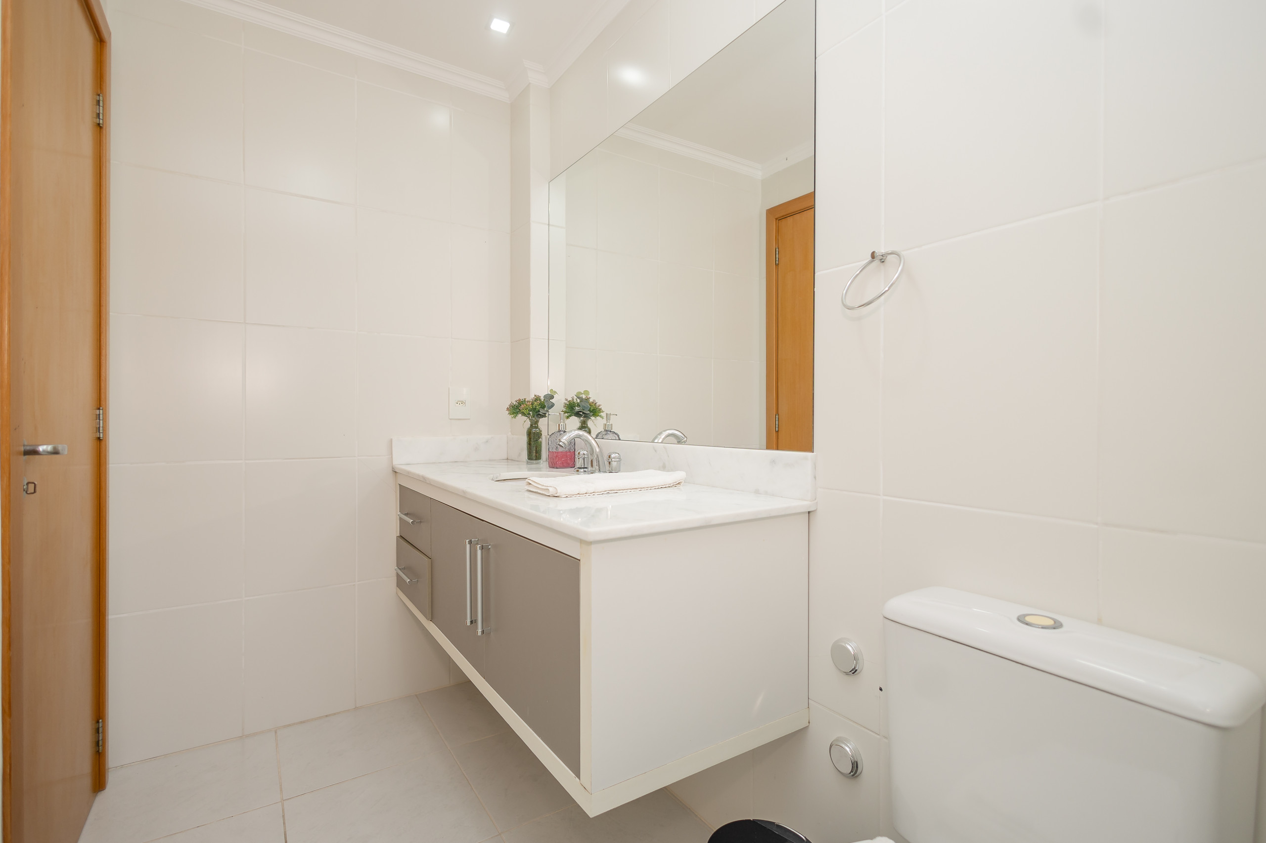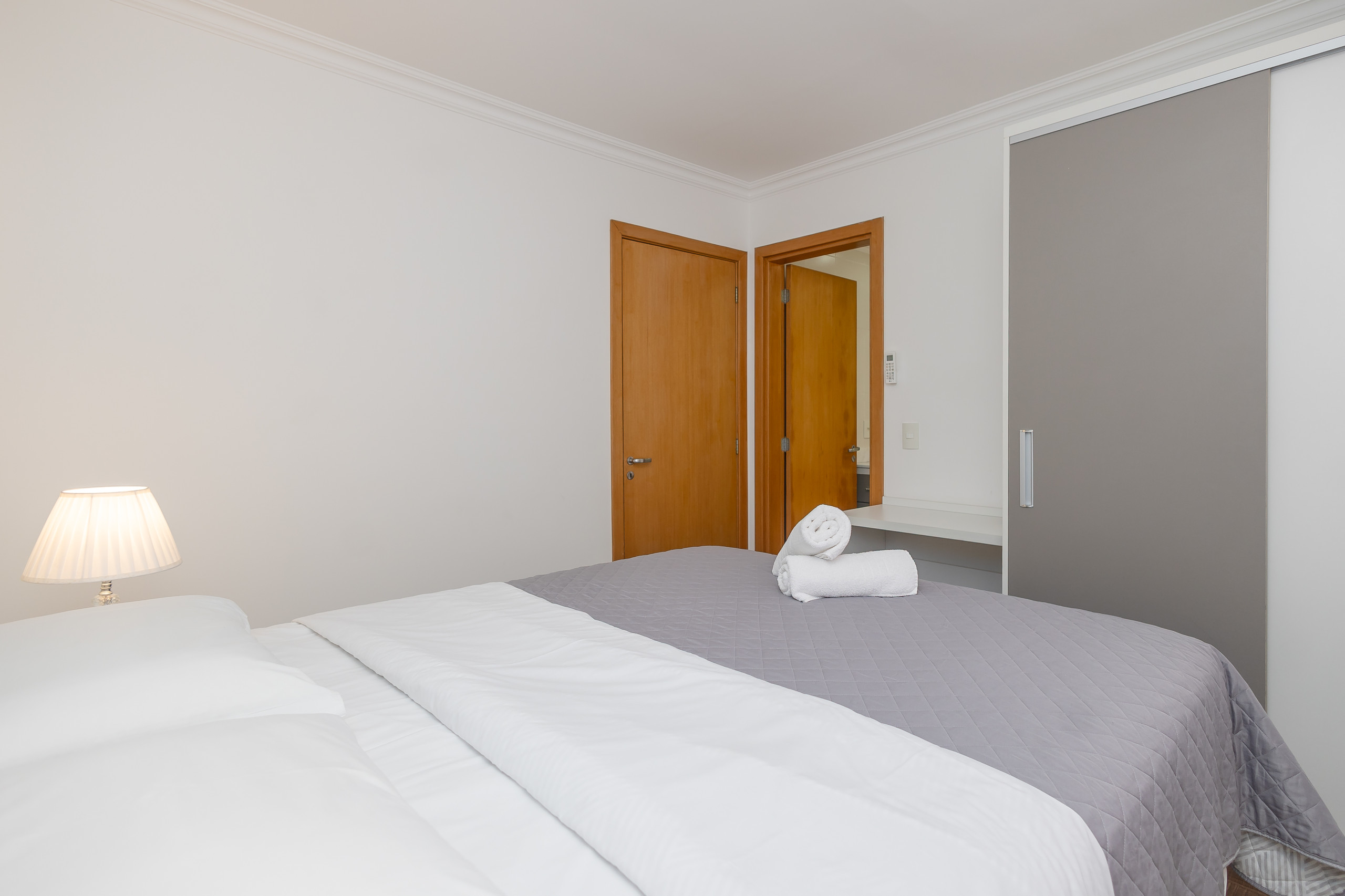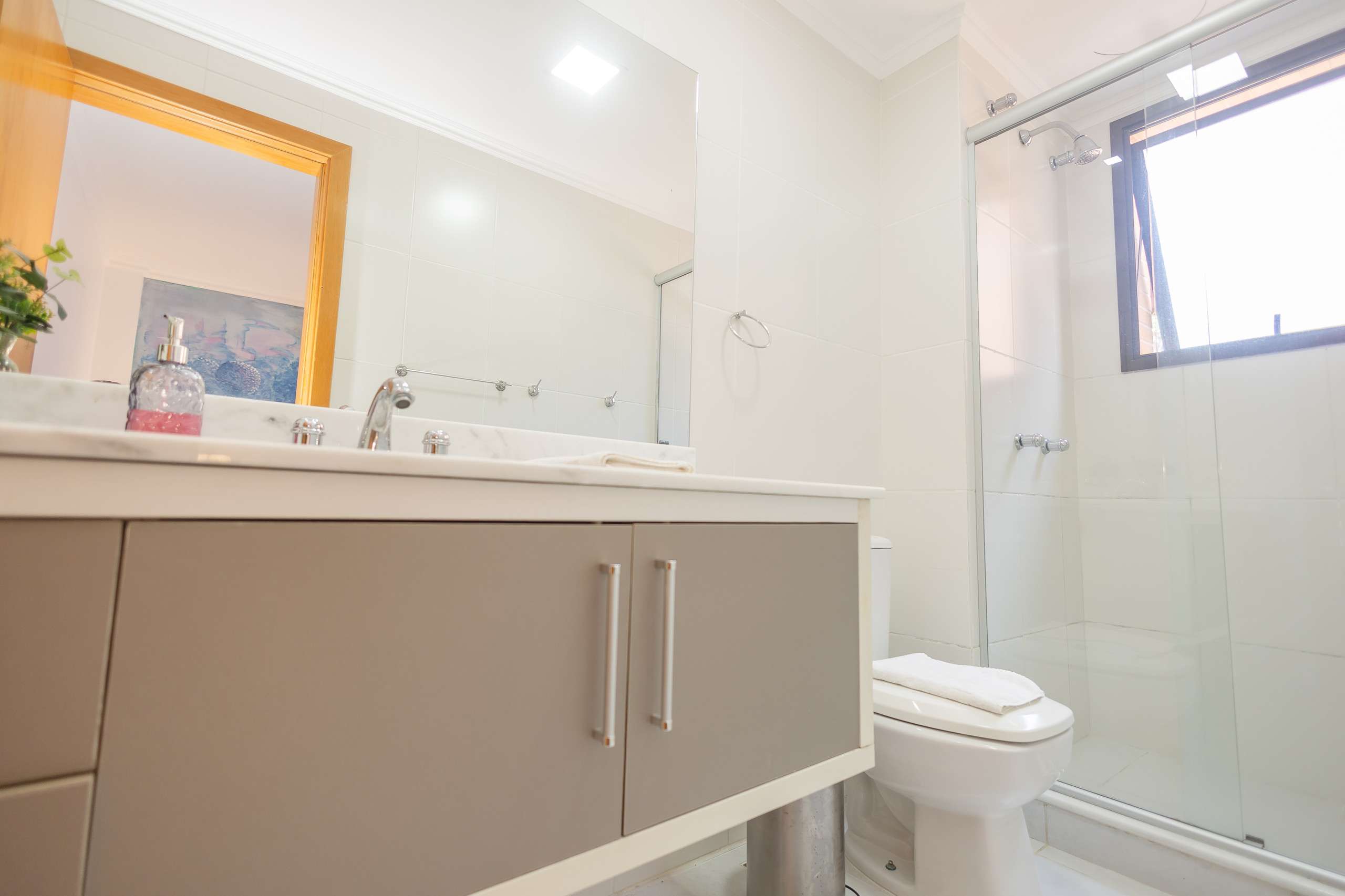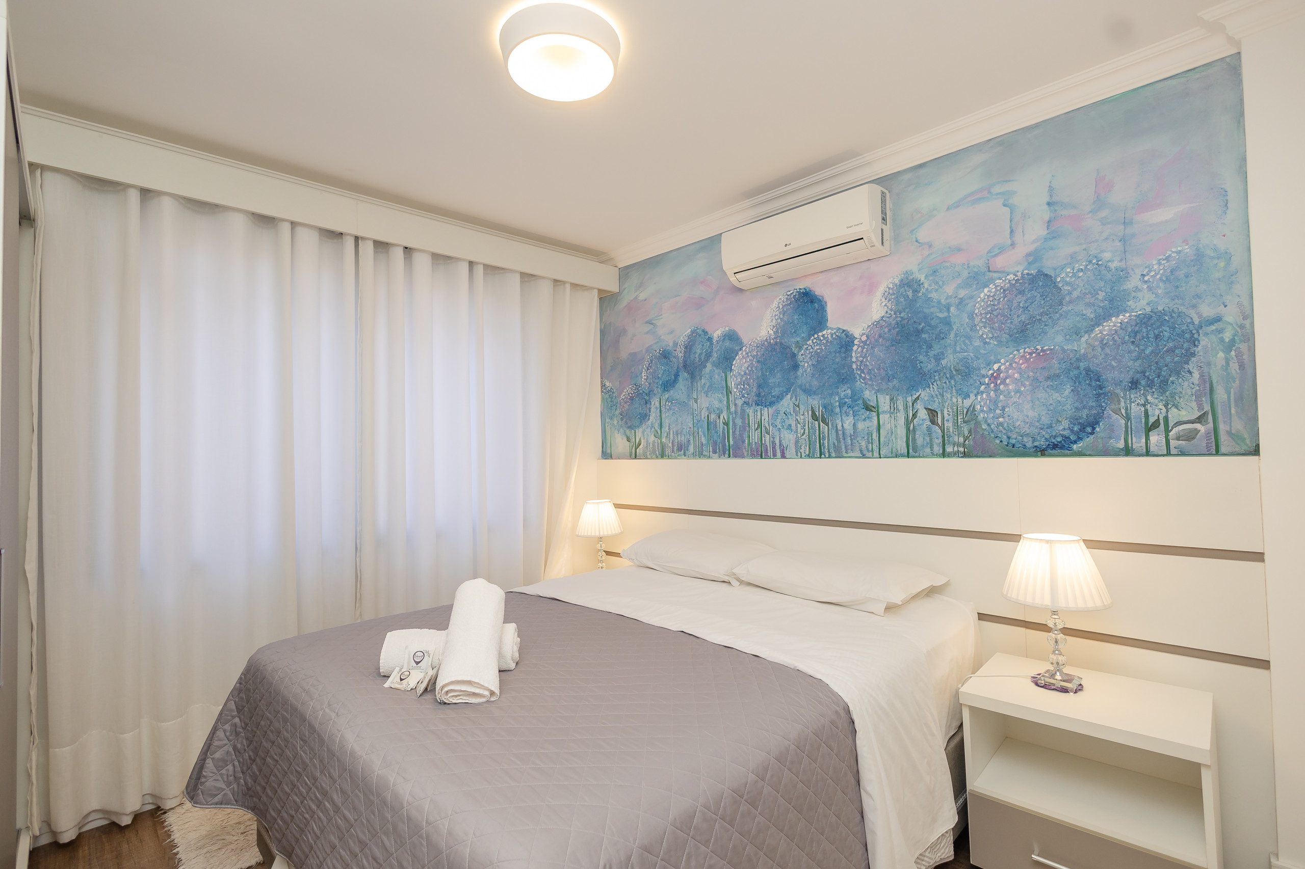 O apartamento conta com uma suíte com cama queen e uma cama de casal no living, 2 banheiros, sendo 1 completo e 1 lavabo, e uma vaga de garagem.