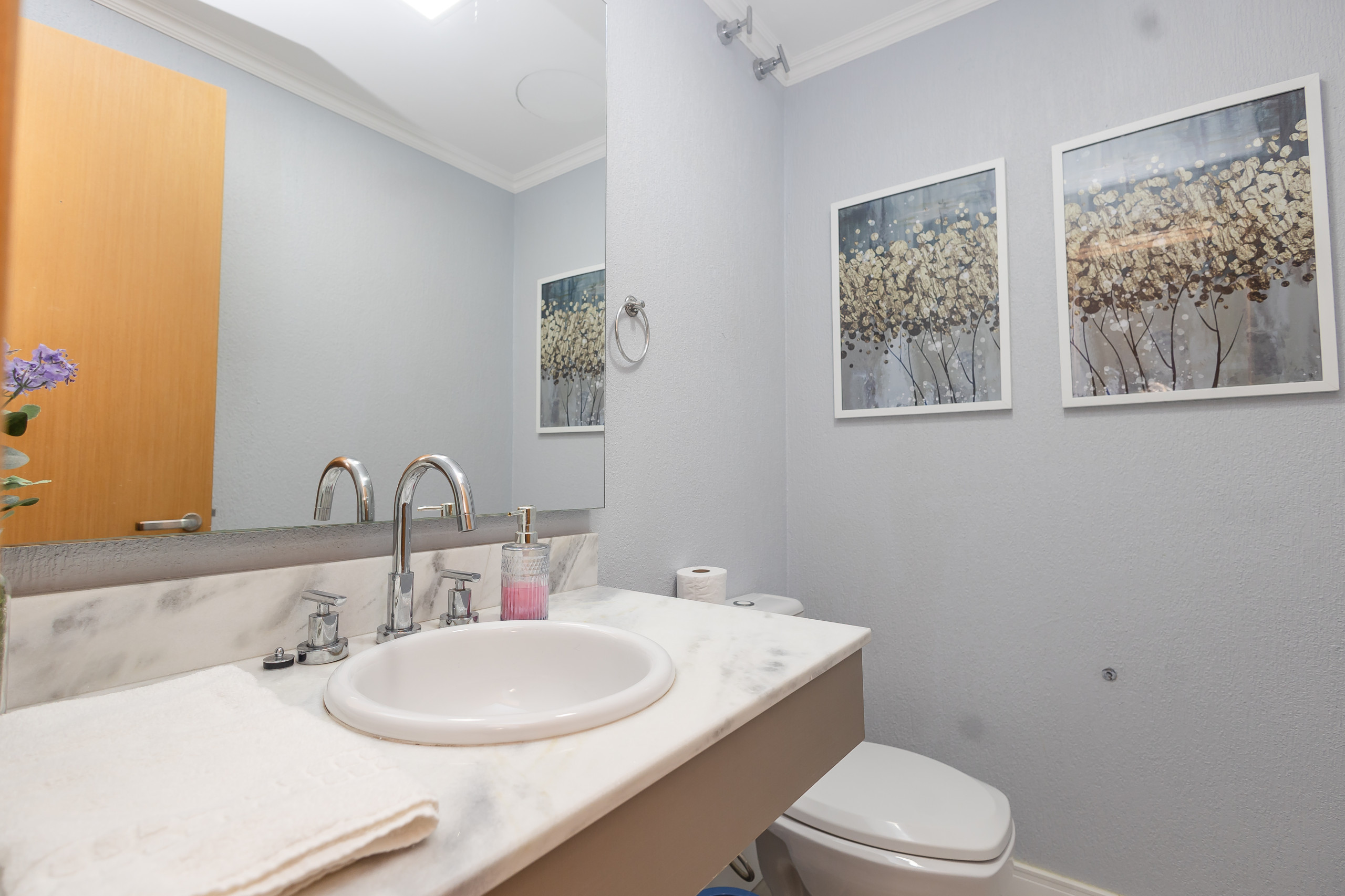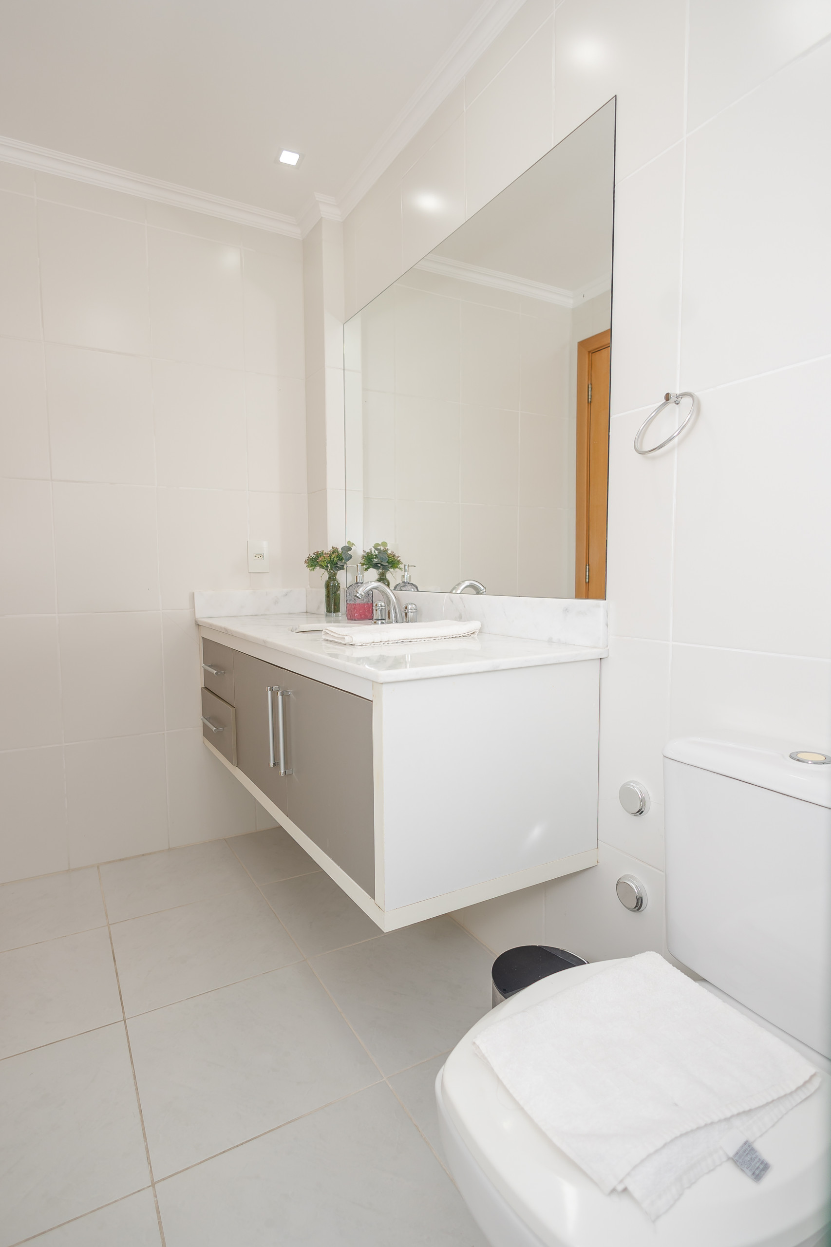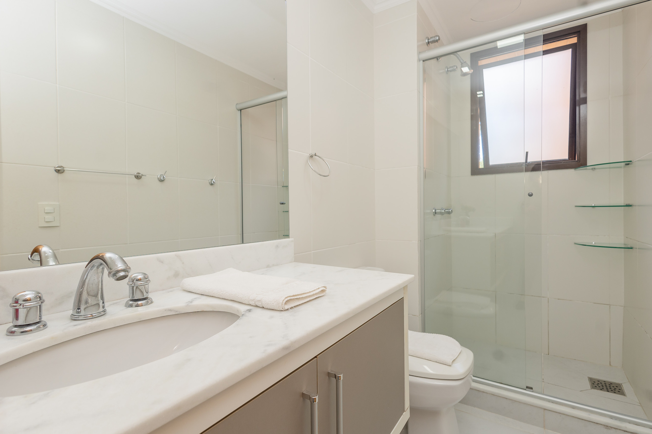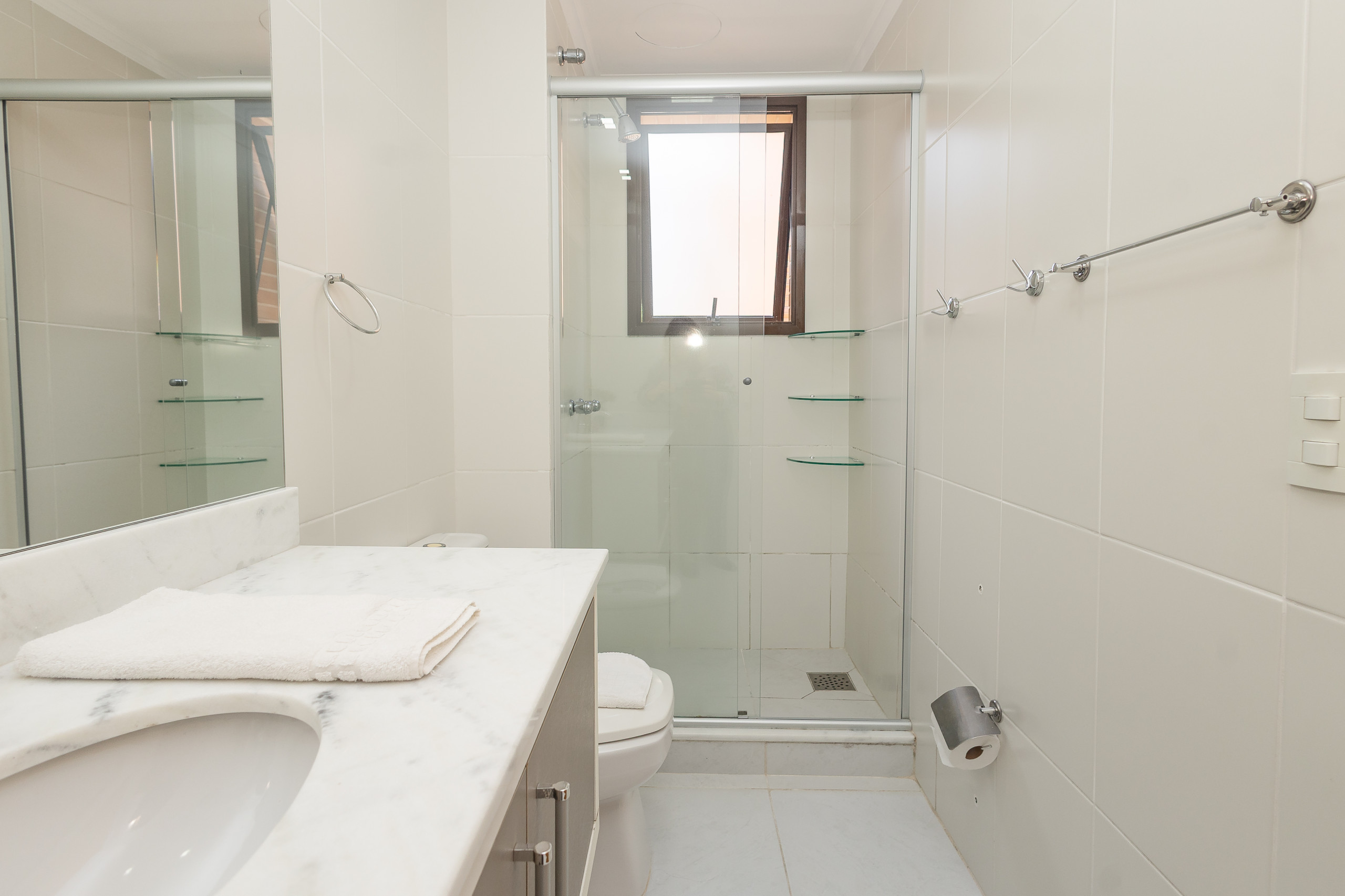O apartamento conta com uma suíte com cama queen e uma cama de casal no living, 2 banheiros, sendo 1 completo e 1 lavabo, e uma vaga de garagem.