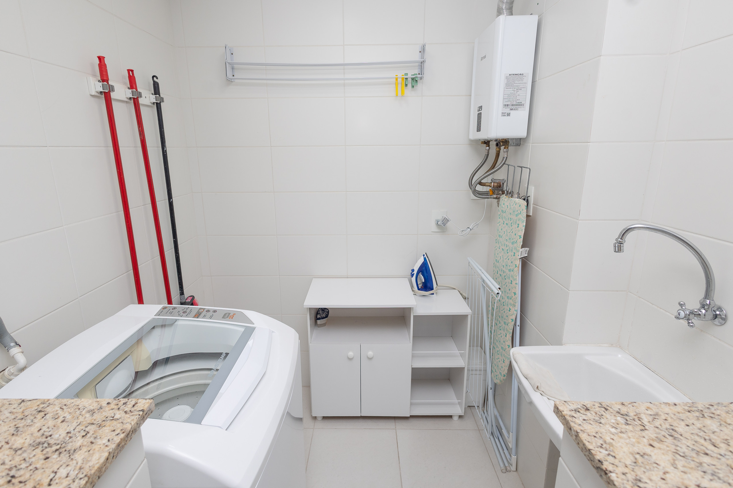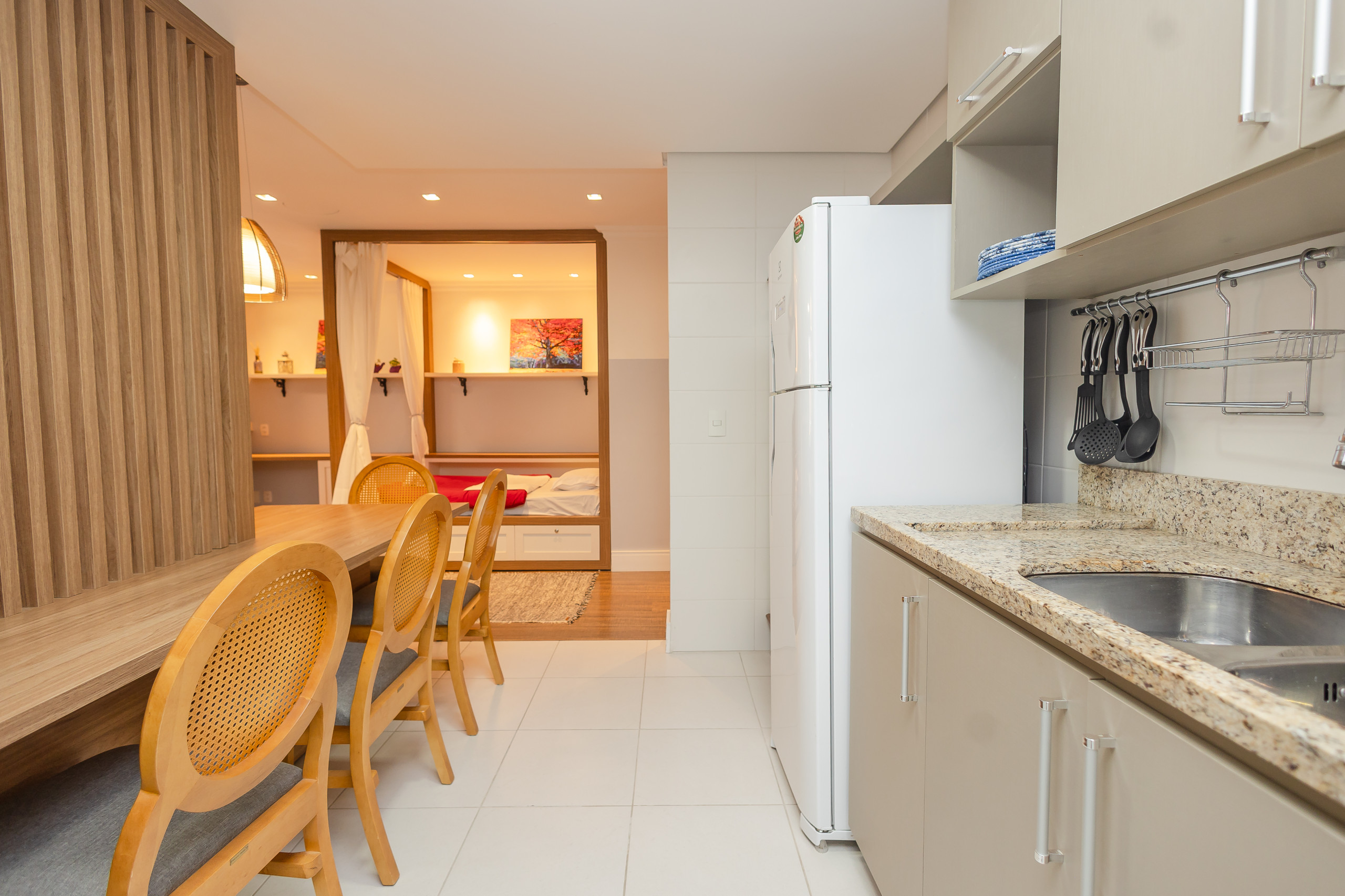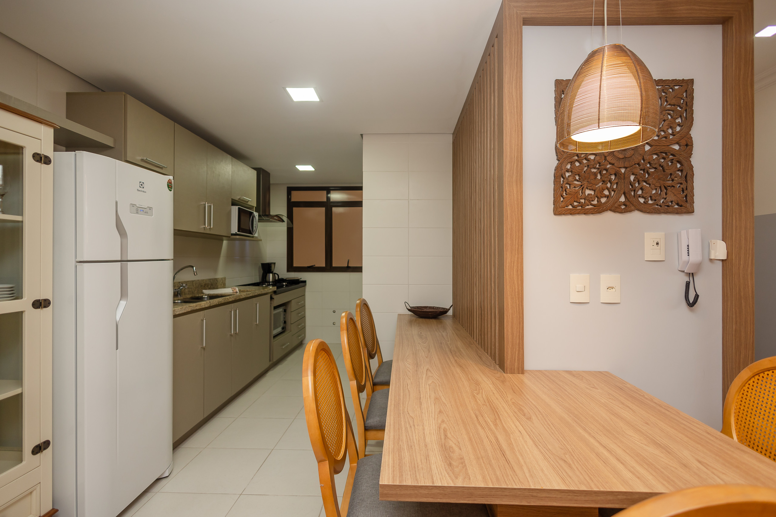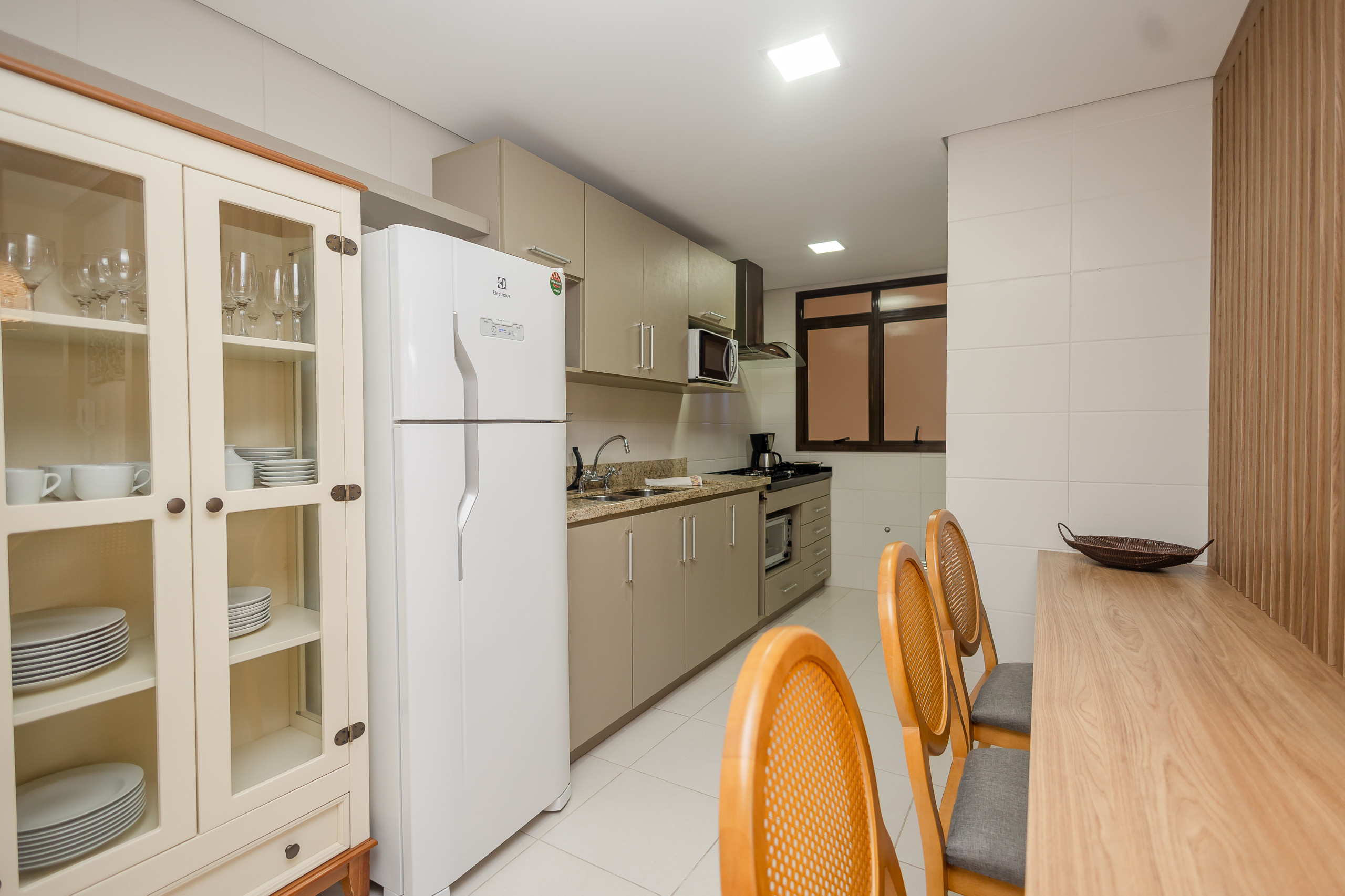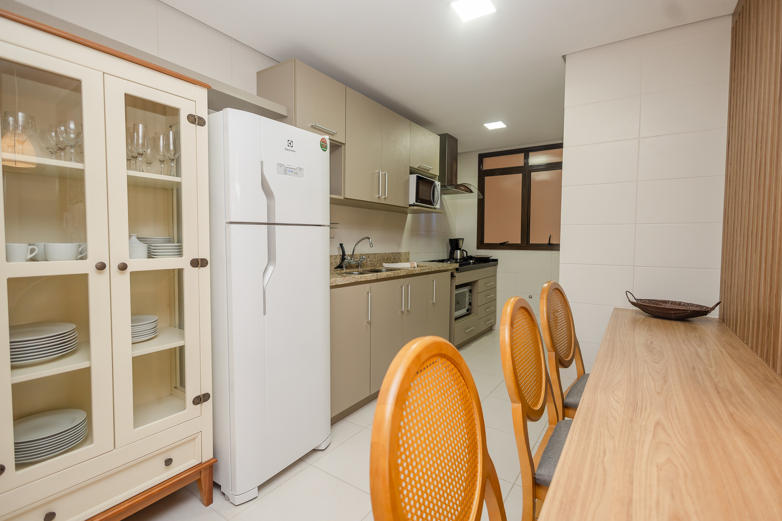 A cozinha americana é completa, equipada com geladeira, máquina de lavar, cafeteira, forno, micro-ondas e todos os utensílios necessários para preparar refeições em família. Além disso, o imóvel possui Wi-Fi, TV e ferro de passar e split Q/F no living e na suíte.