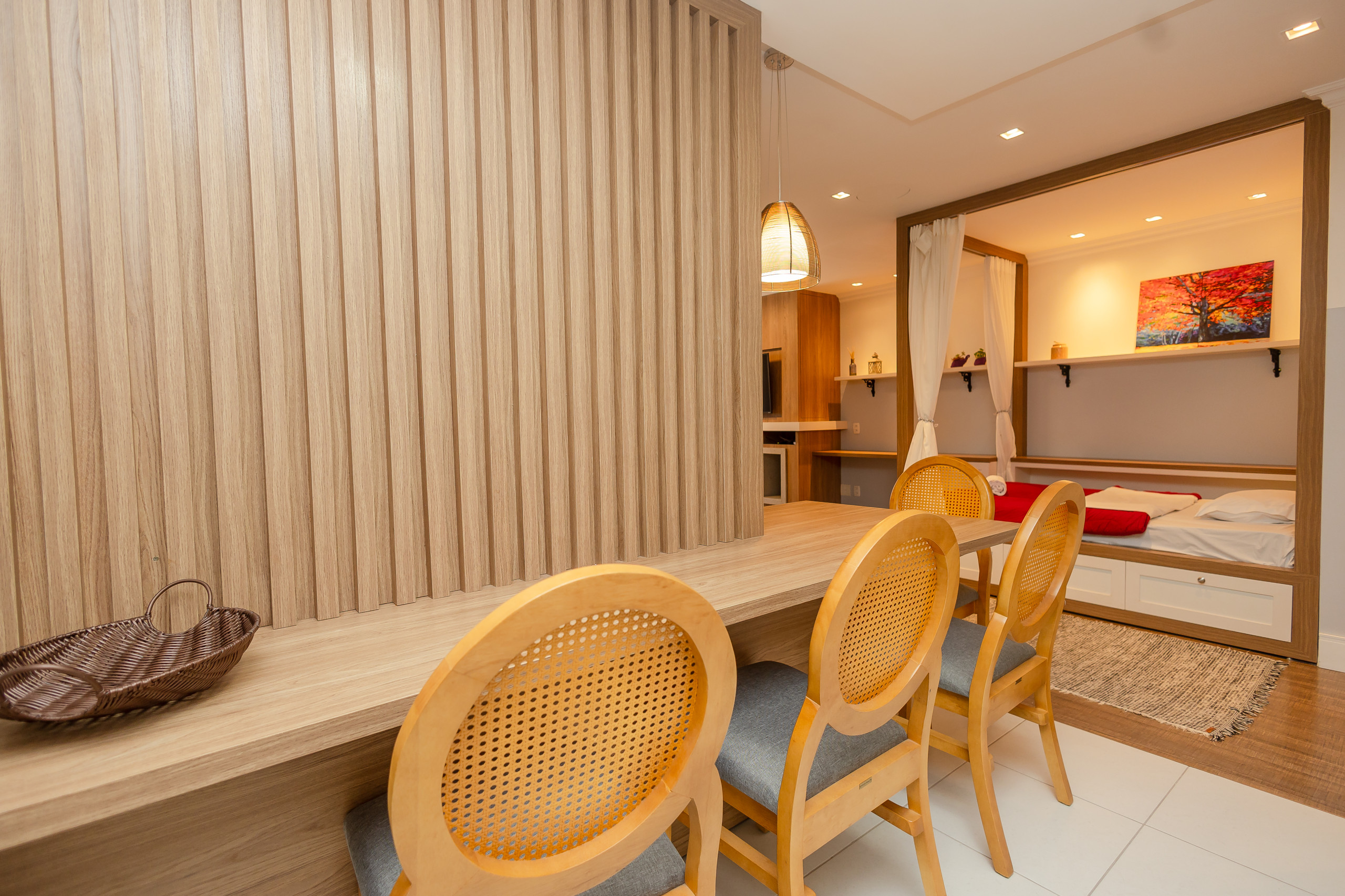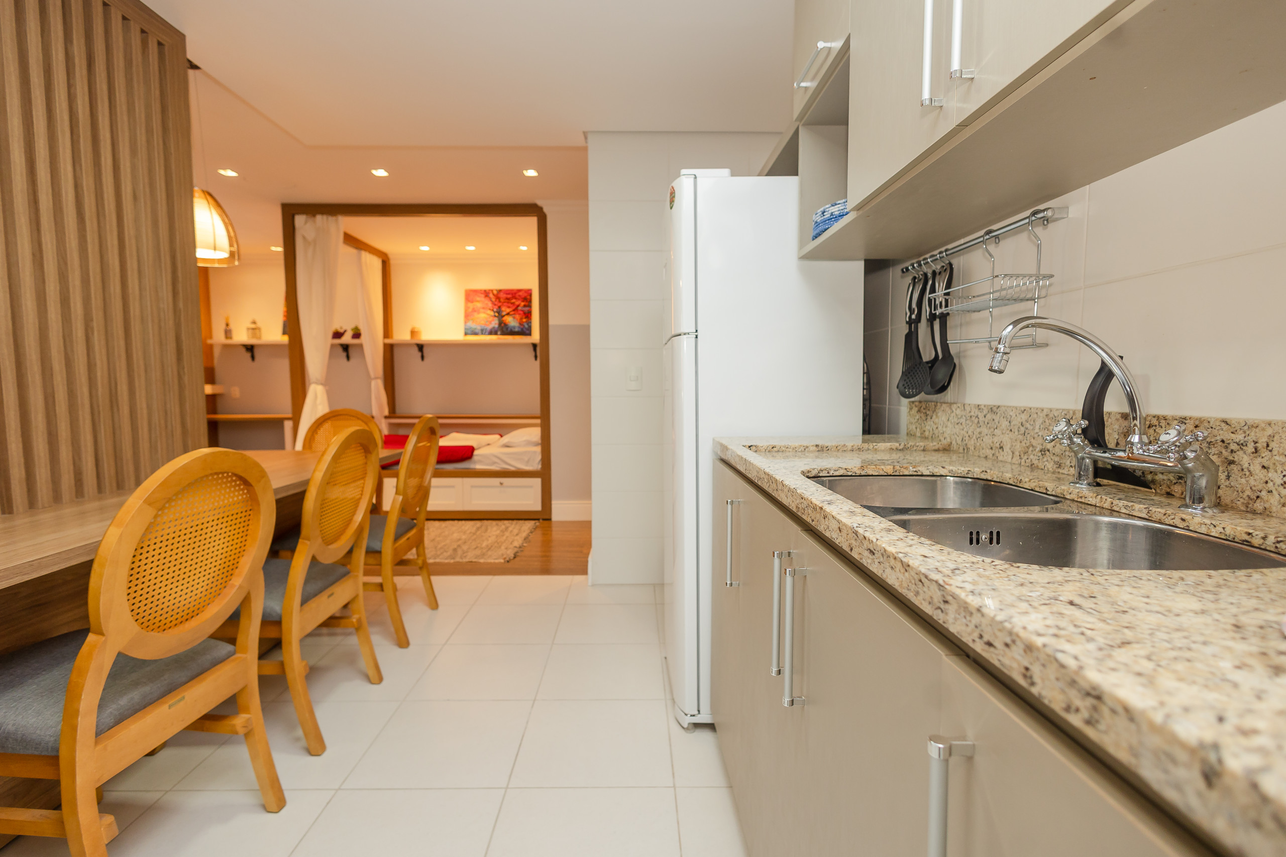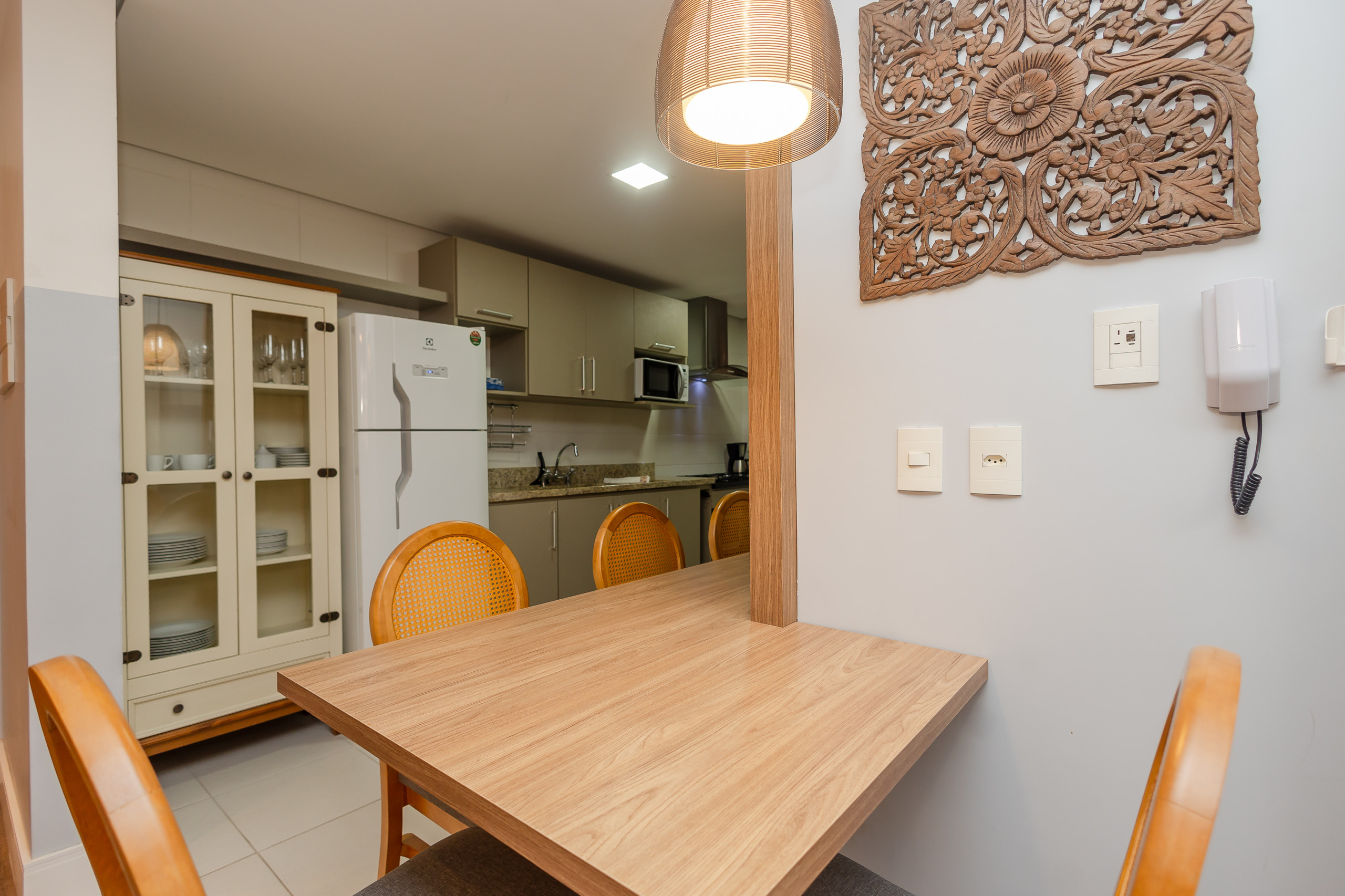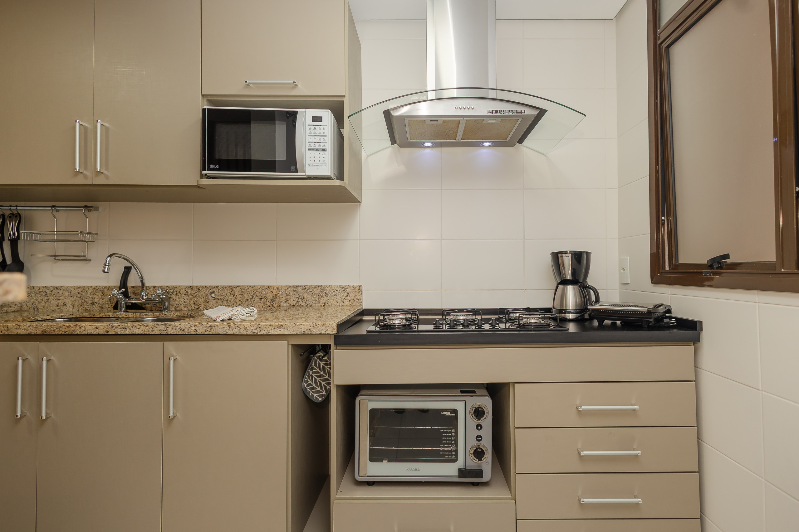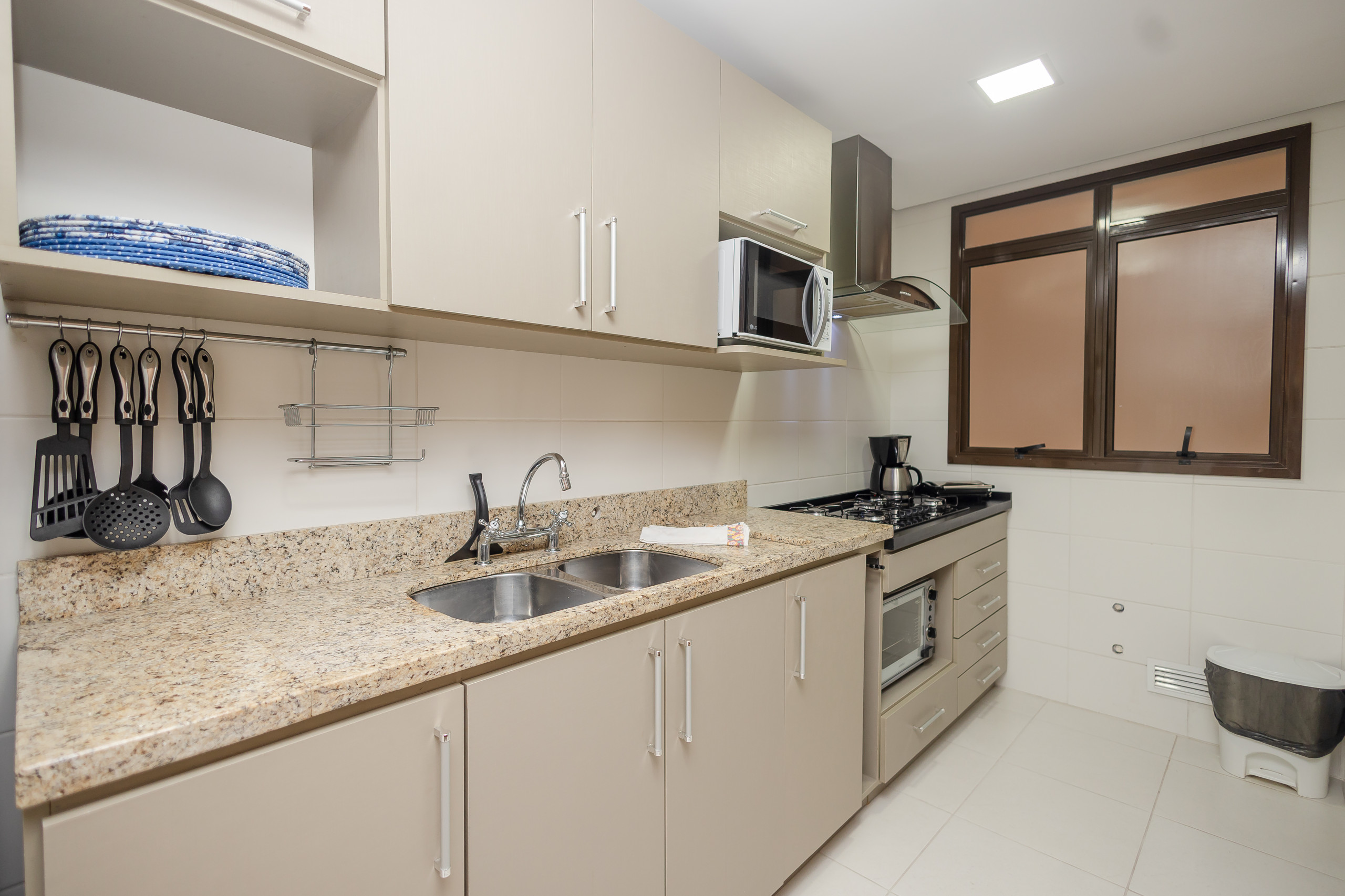 A cozinha americana é completa, equipada com geladeira, máquina de lavar, cafeteira, forno, micro-ondas e todos os utensílios necessários para preparar refeições em família. Além disso, o imóvel possui Wi-Fi, TV e ferro de passar e split Q/F no living e na suíte.