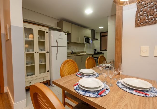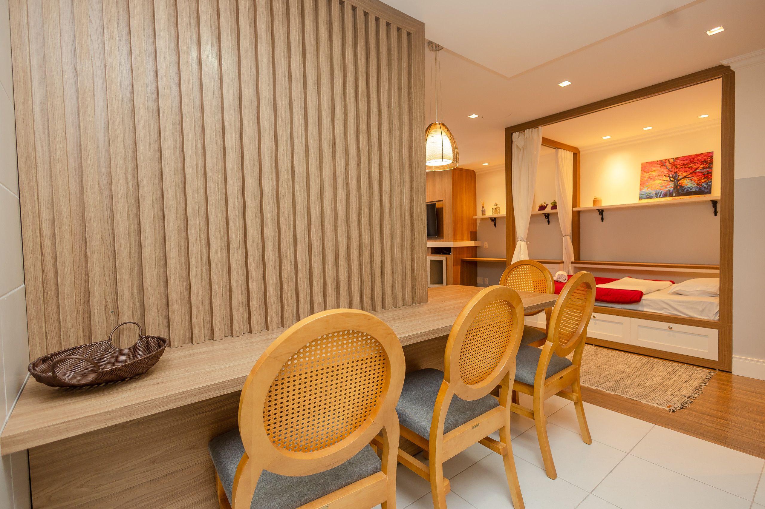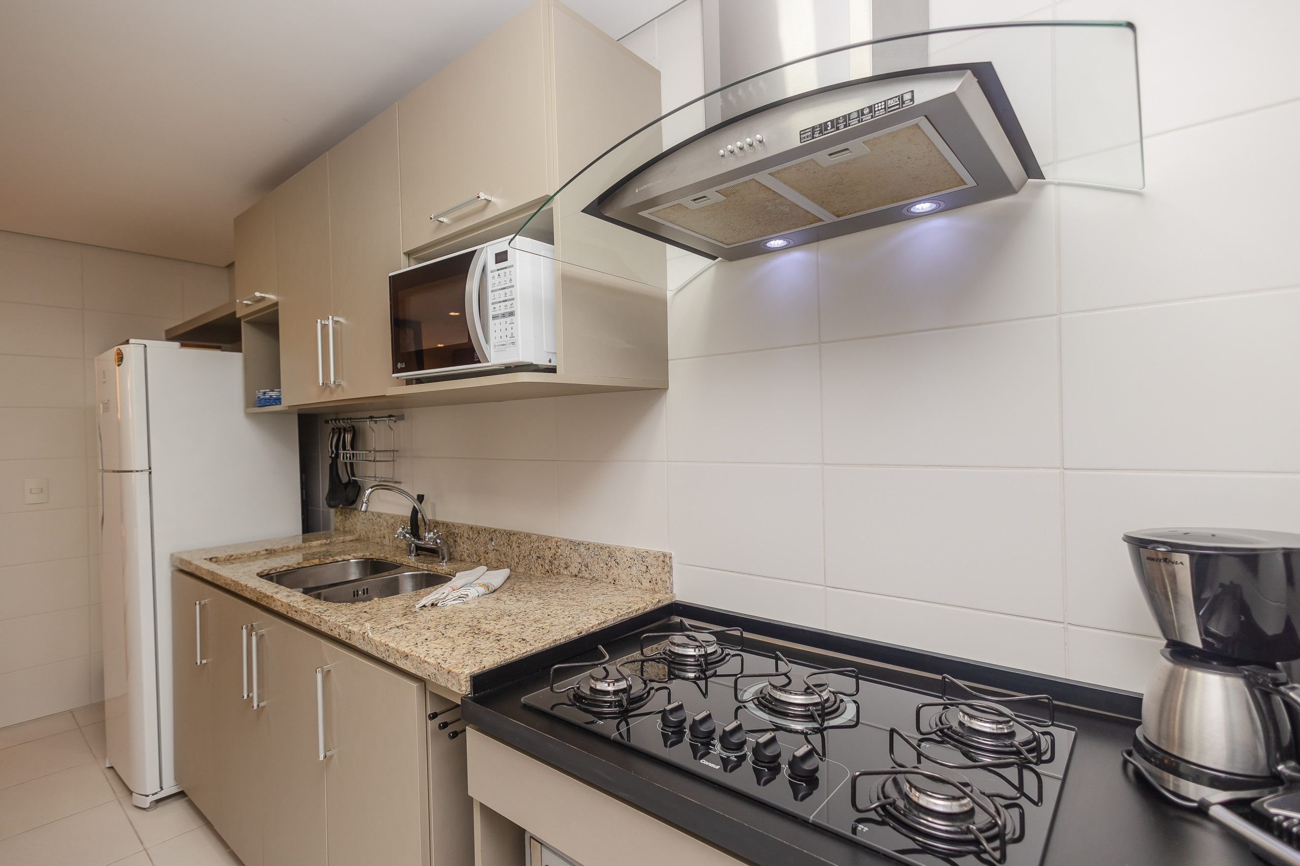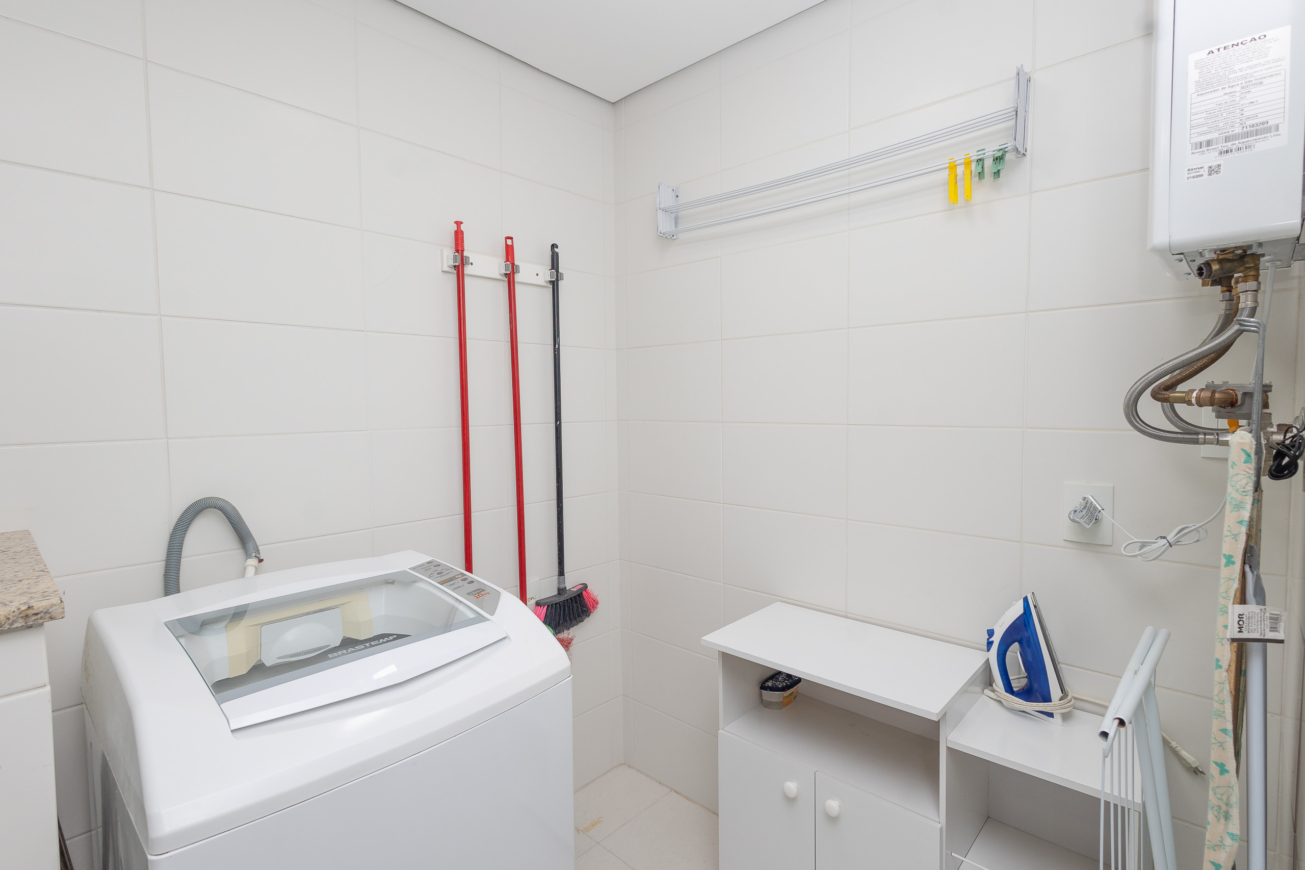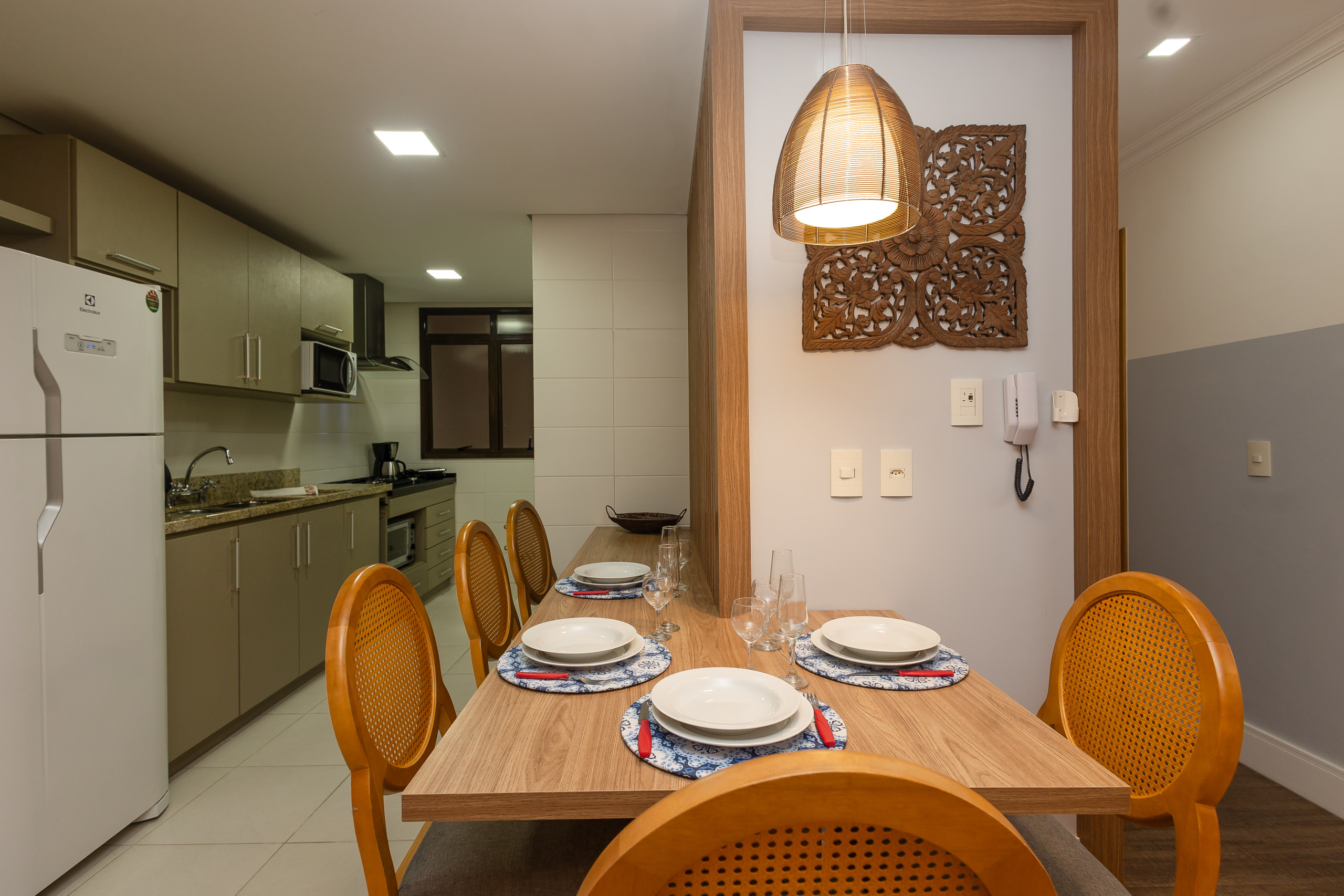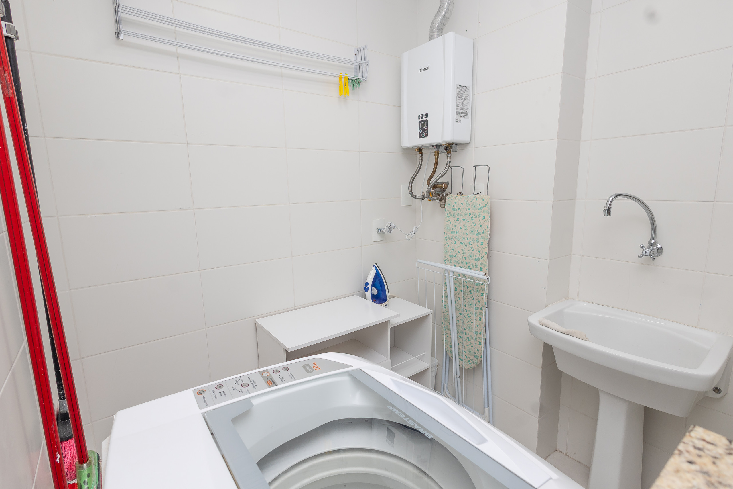 A cozinha americana é completa, equipada com geladeira, máquina de lavar, cafeteira, forno, micro-ondas e todos os utensílios necessários para preparar refeições em família. Além disso, o imóvel possui Wi-Fi, TV e ferro de passar e split Q/F no living e na suíte.