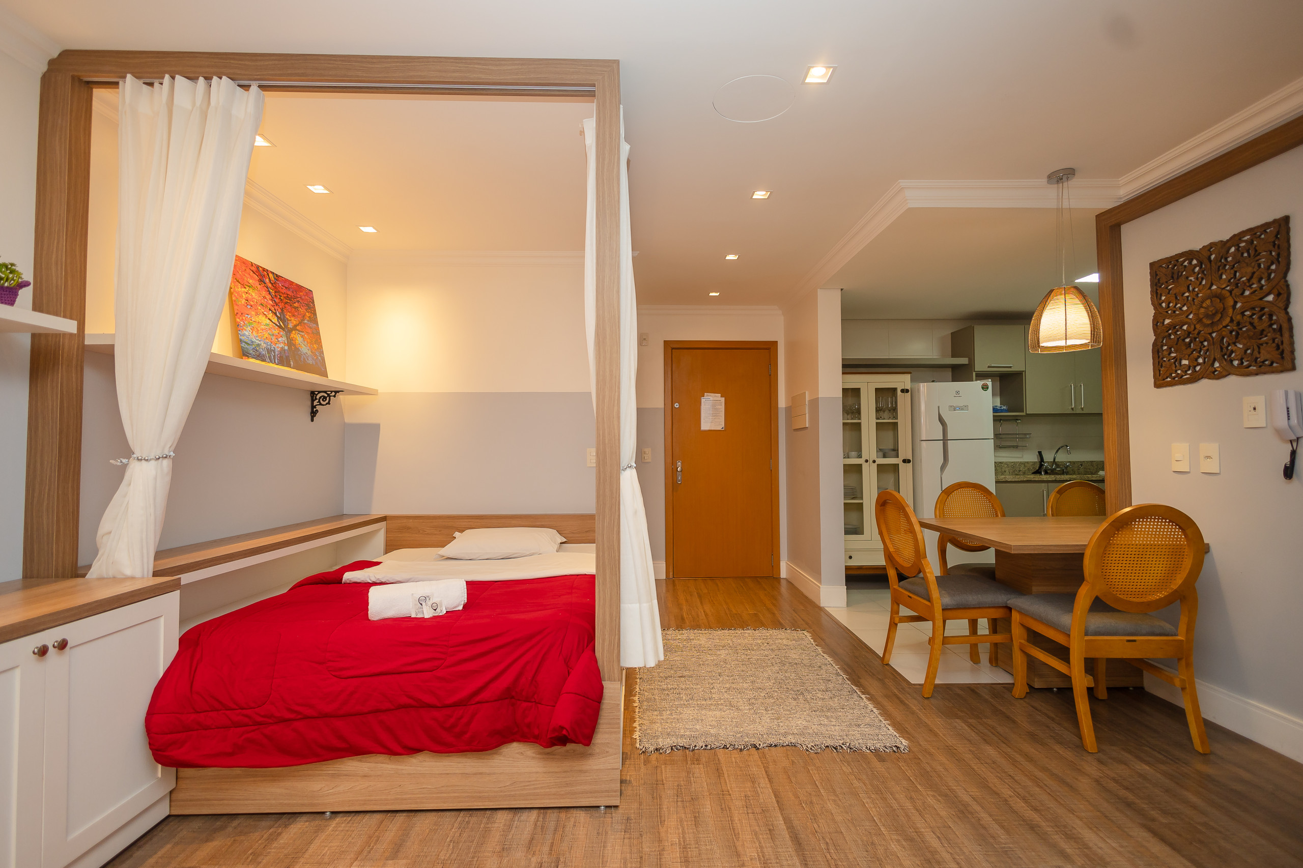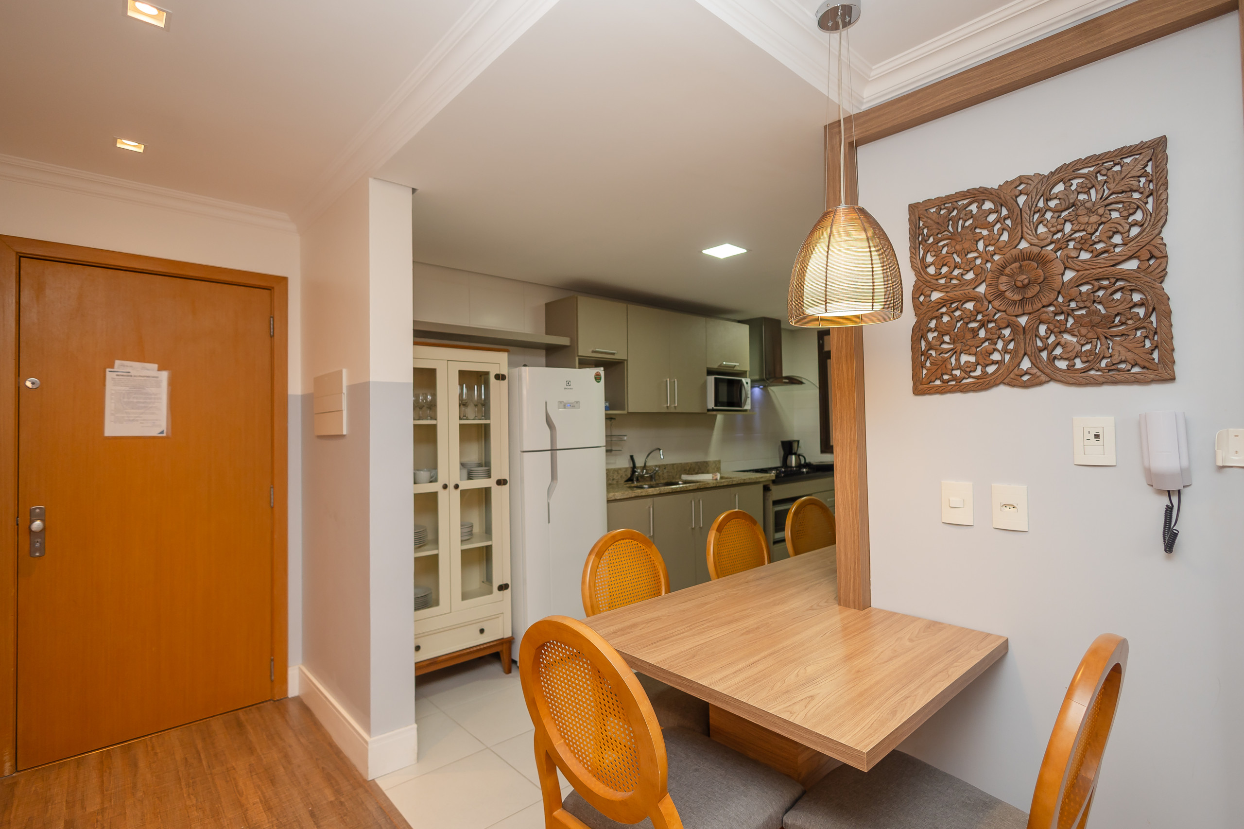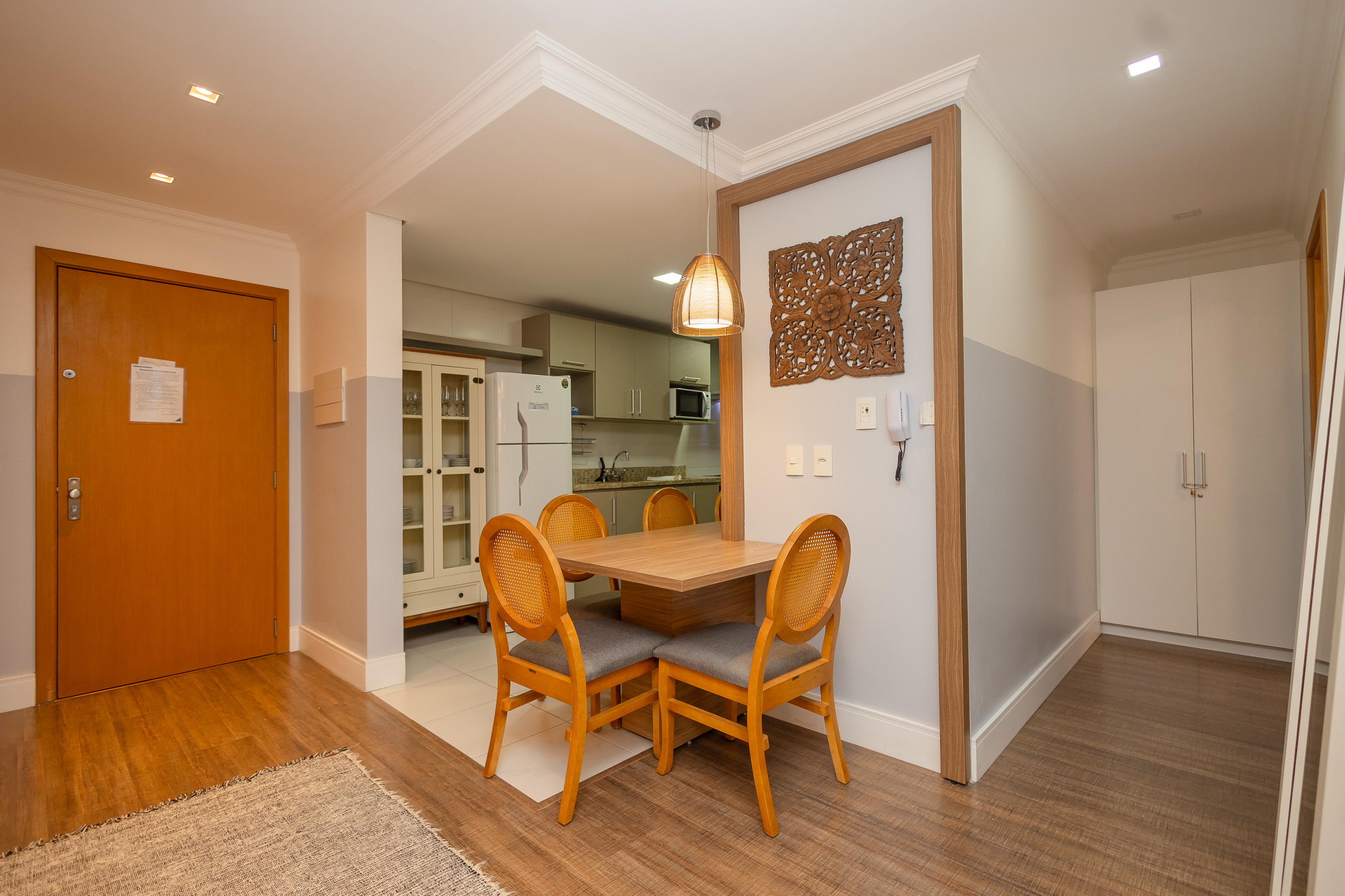 O imóvel possui um quarto, banheiro social, cozinha equipada, sala com dois ambientes (estar e jantar), sofá-cama, wi-fi de alta velocidade, smart TV e TV a cabo, aquecedor, sacada e uma vaga de garagem. O condomínio oferece piscina aquecida e quadra de tênis.