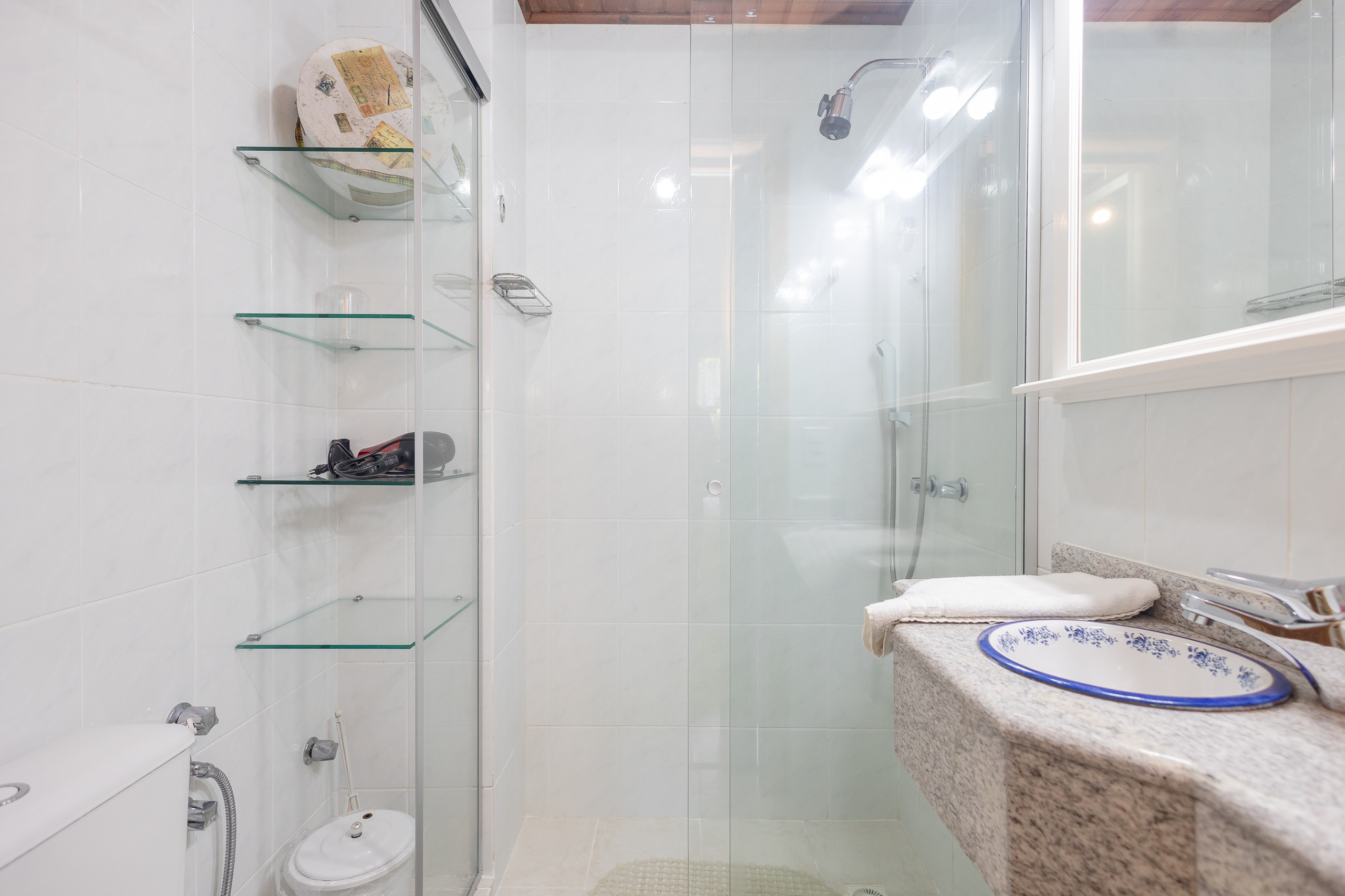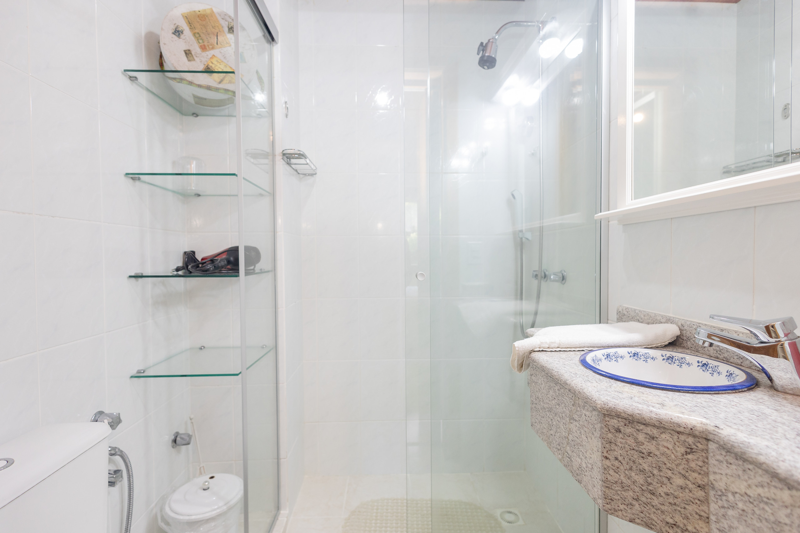 O apartamento possui ar-condicionado na sala de estar, garantindo conforto térmico em qualquer época do ano. Aquecedores elétricos complementam o sistema de climatização. Além disso, o imóvel conta com 2 banheiros - um completo e um lavabo - e internet Wi-Fi gratuita.