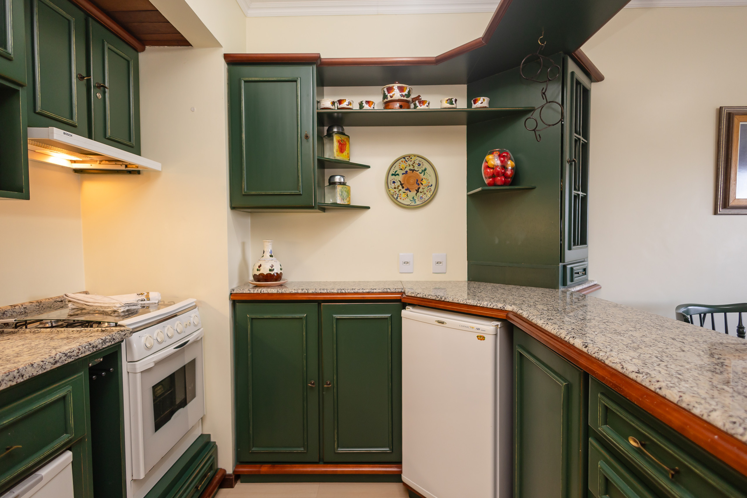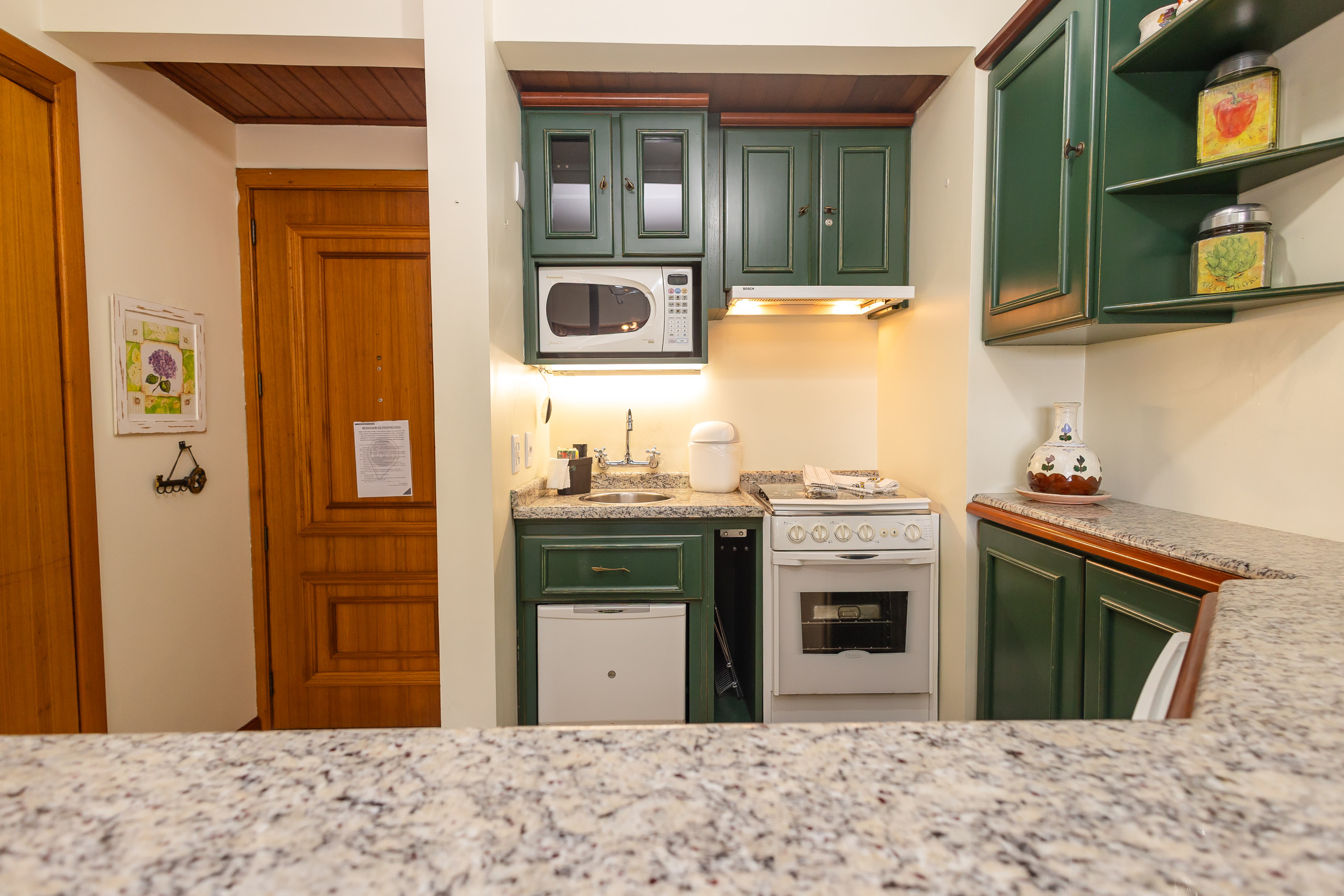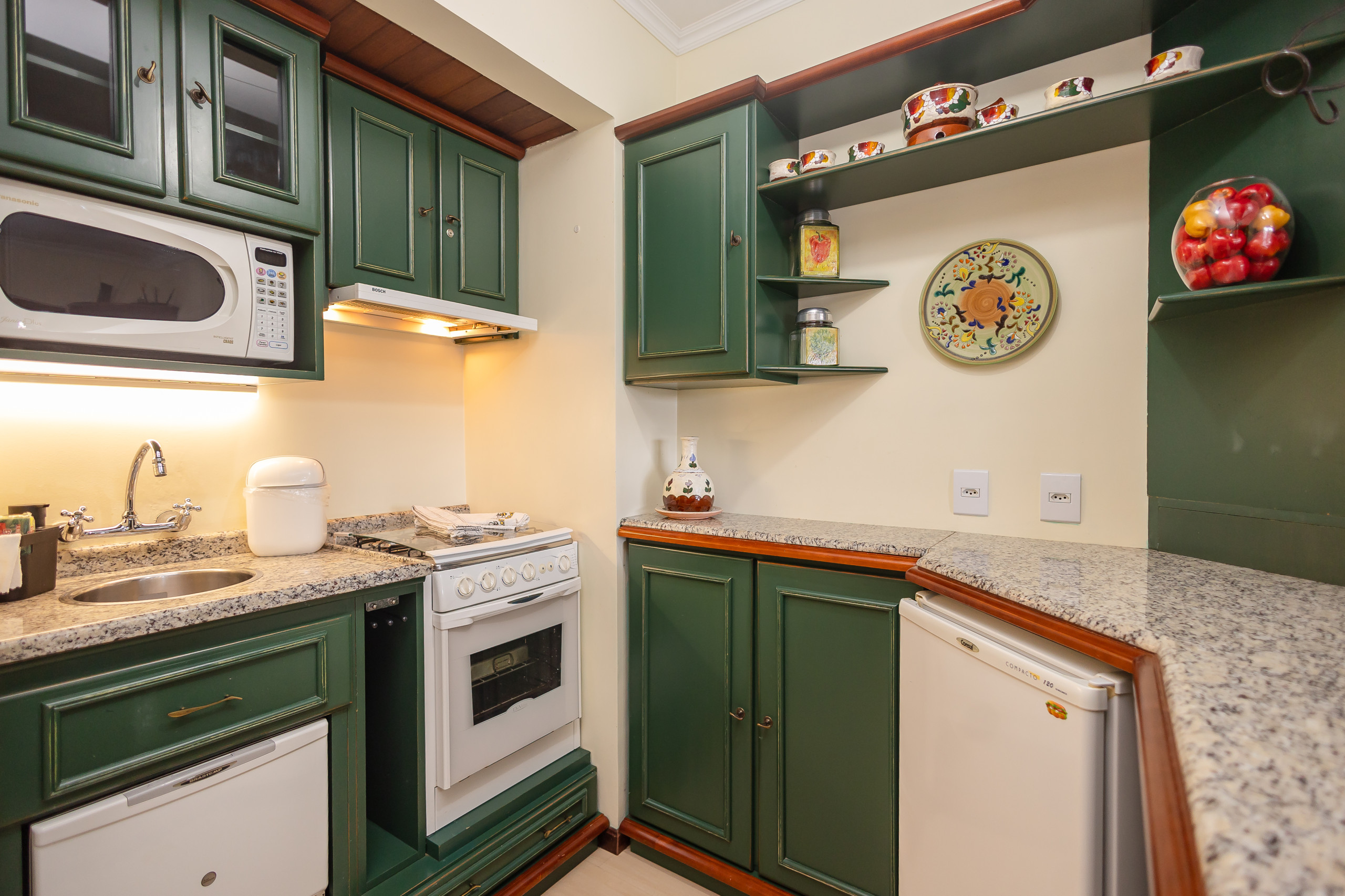 A cozinha americana é um destaque, equipada com eletrodomésticos como frigobar, máquina de lavar louça, forno, micro-ondas, cafeteira, torradeira e liquidificador. Todos os utensílios necessários estão disponíveis para que você possa preparar refeições deliciosas durante sua estadia.
