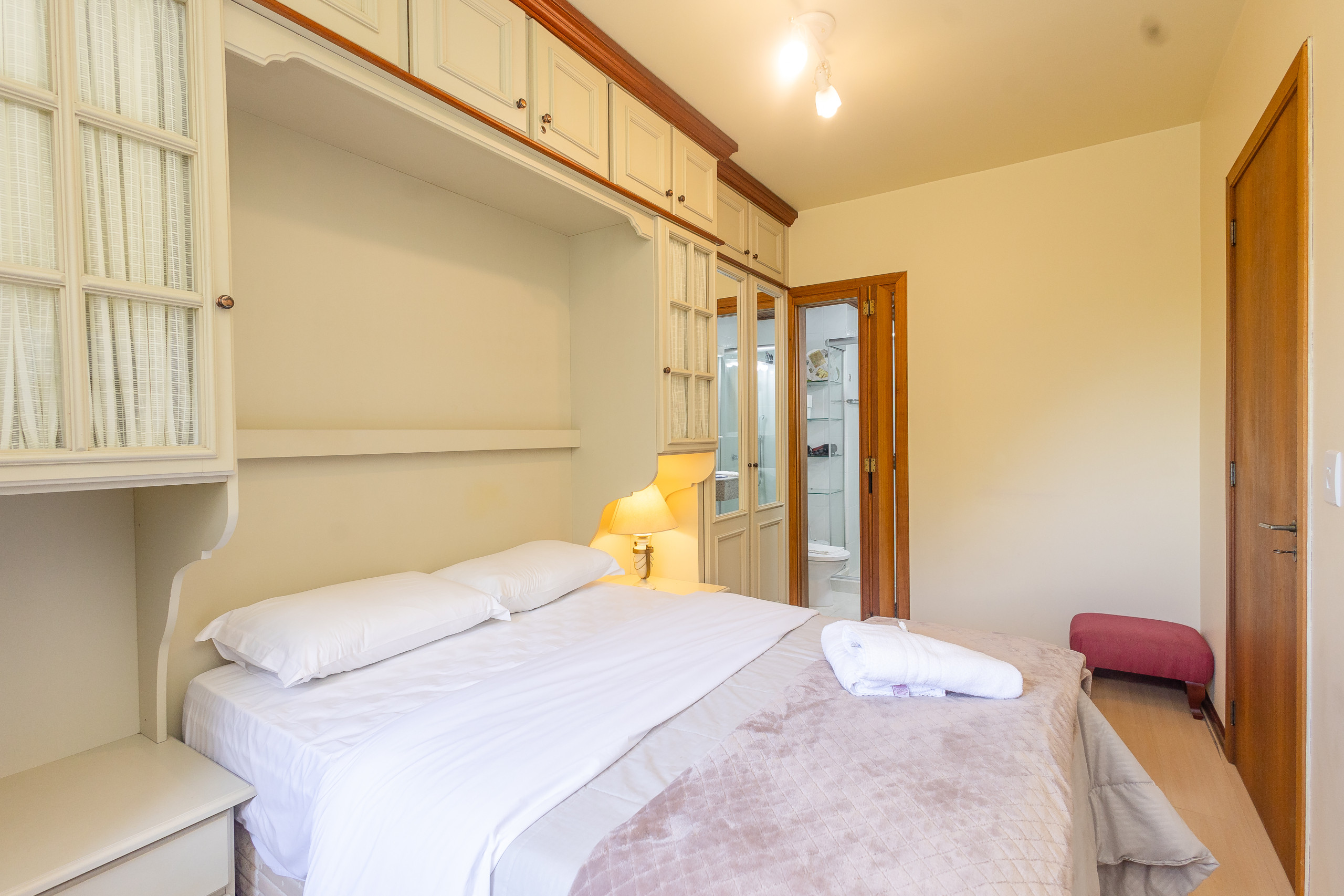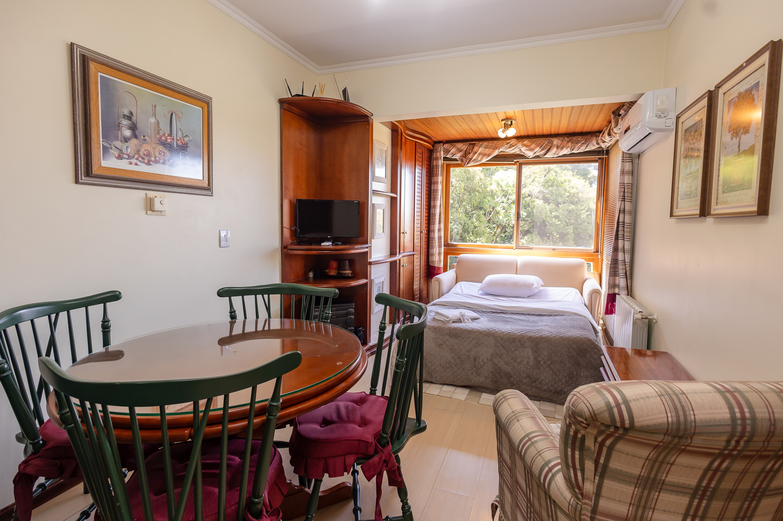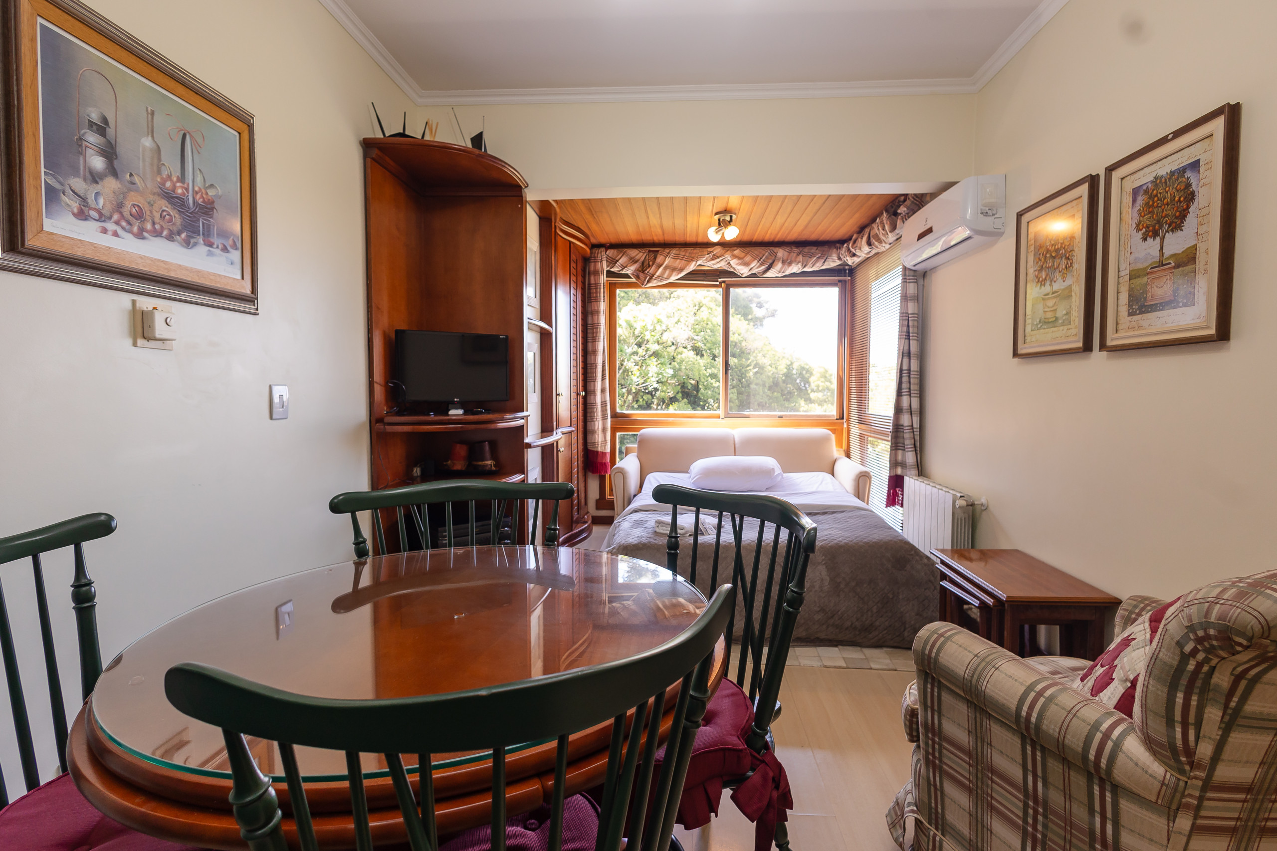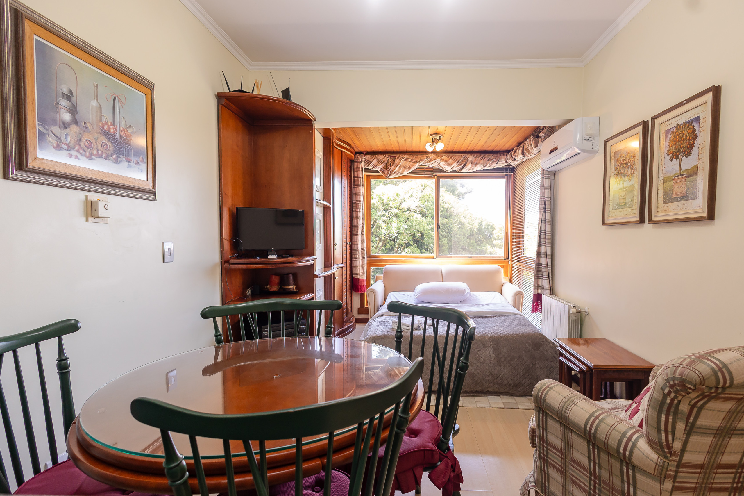 Com 49m², este espaço compacto e bem planejado oferece tudo que você precisa para uma estadia relaxante. O apartamento conta com um quarto confortável com uma cama de casal e um sofá-cama no living, permitindo acomodar até 4 pessoas com facilidade. O ambiente é extremamente aconchegante e iluminado, criando uma atmosfera perfeita para descanso.