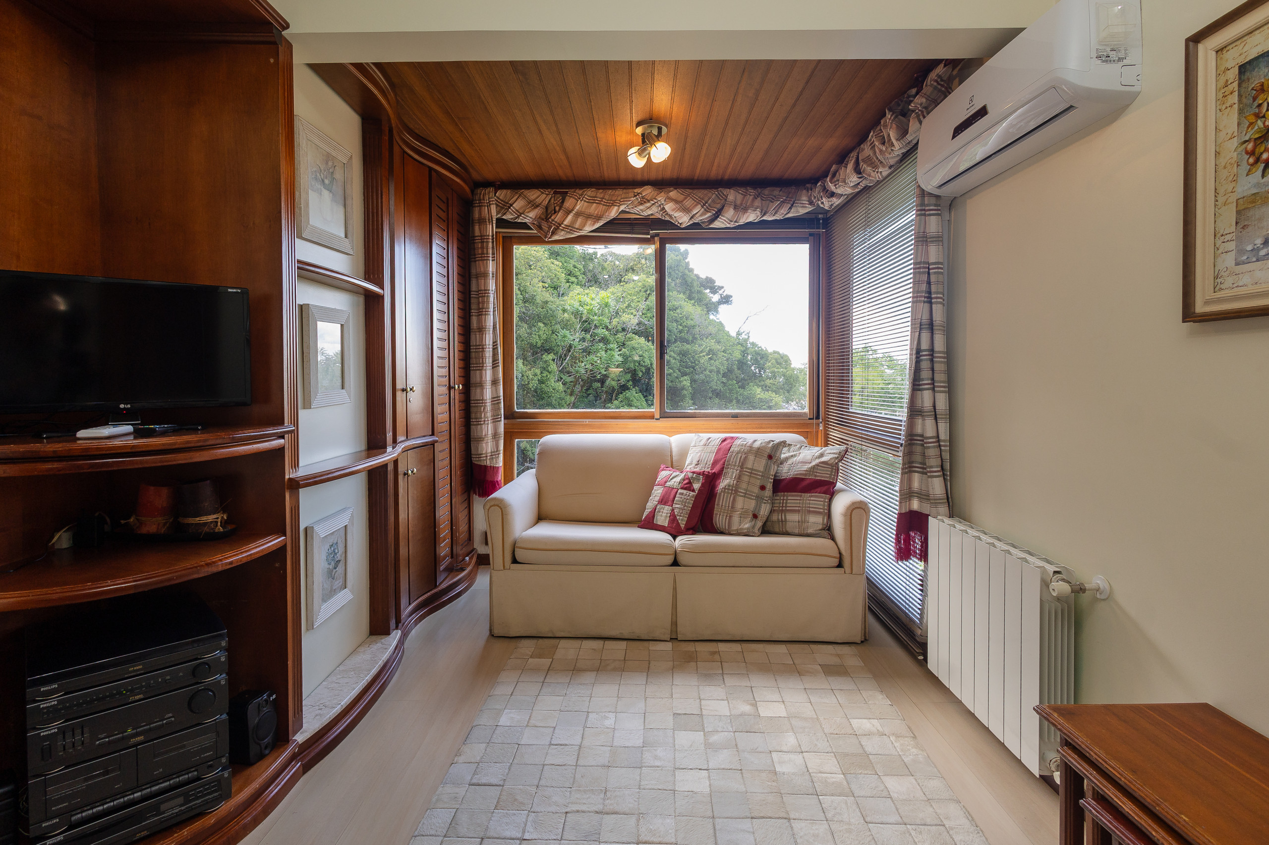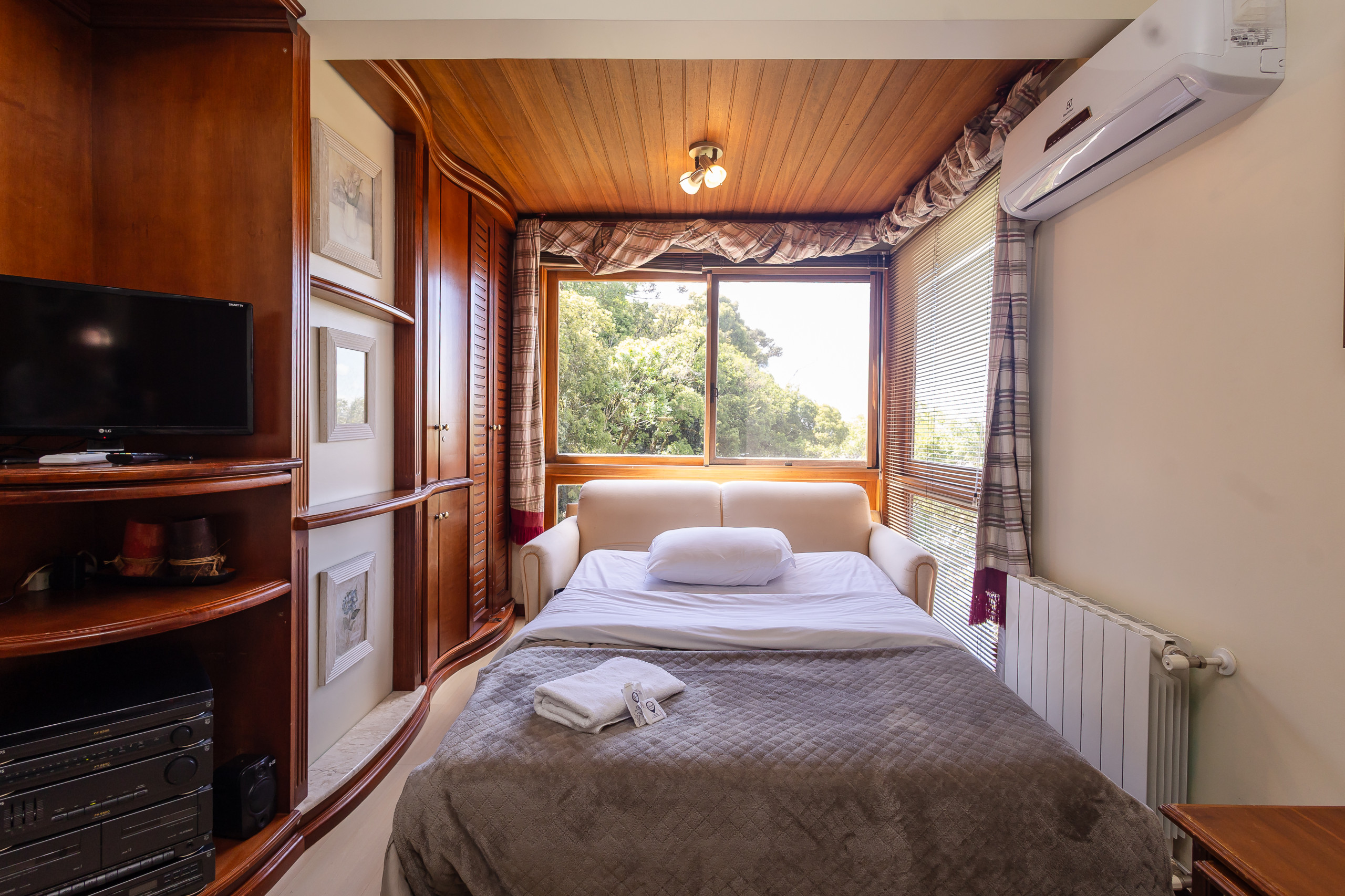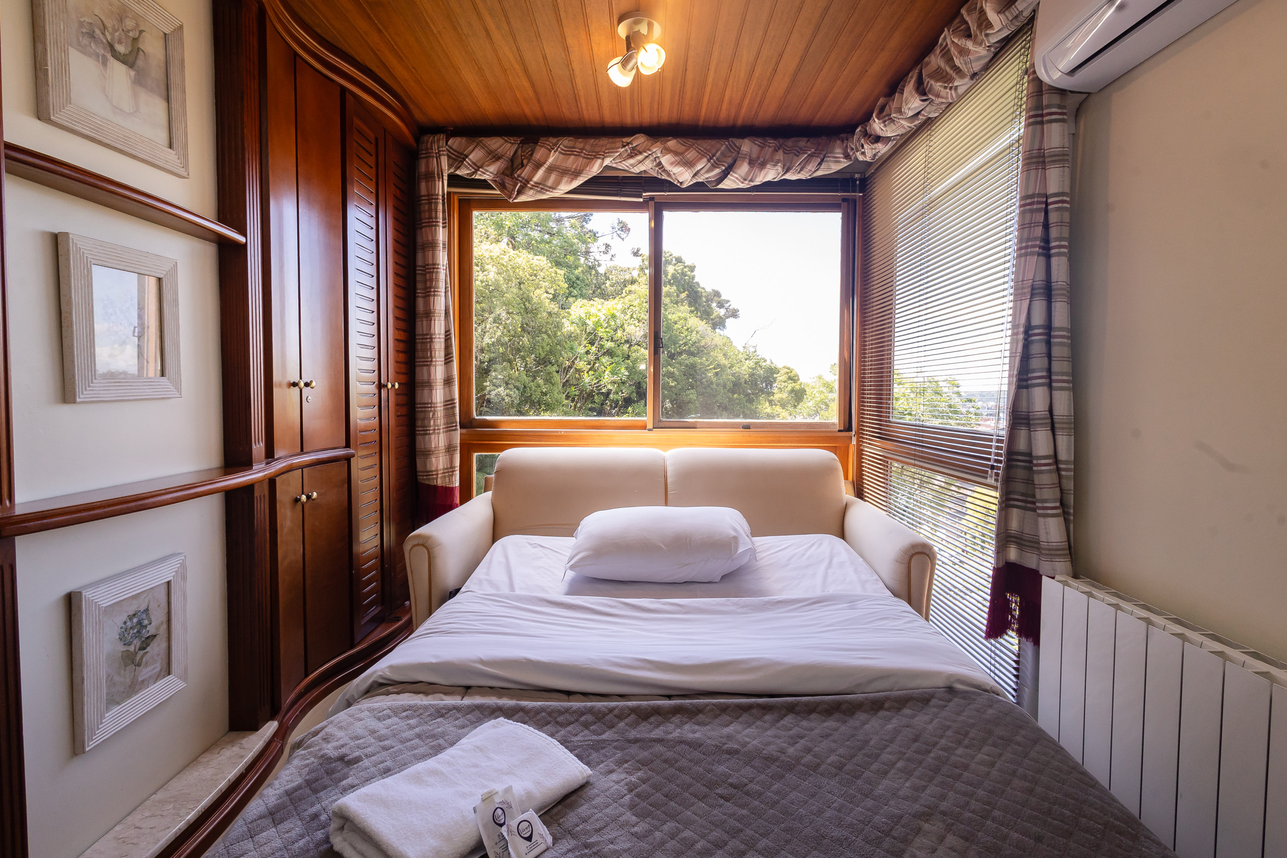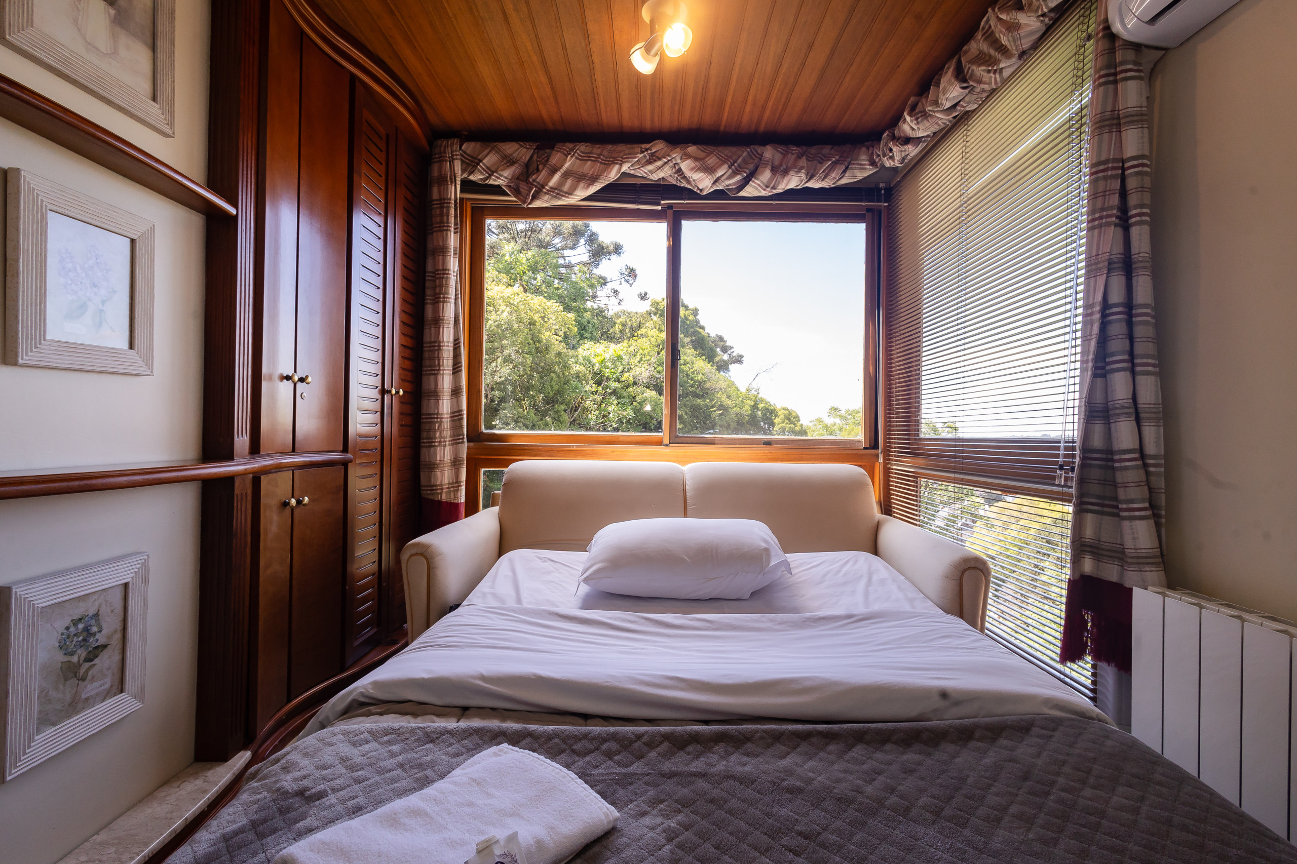 Com 49m², este espaço compacto e bem planejado oferece tudo que você precisa para uma estadia relaxante. O apartamento conta com um quarto confortável com uma cama de casal e um sofá-cama no living, permitindo acomodar até 4 pessoas com facilidade. O ambiente é extremamente aconchegante e iluminado, criando uma atmosfera perfeita para descanso.