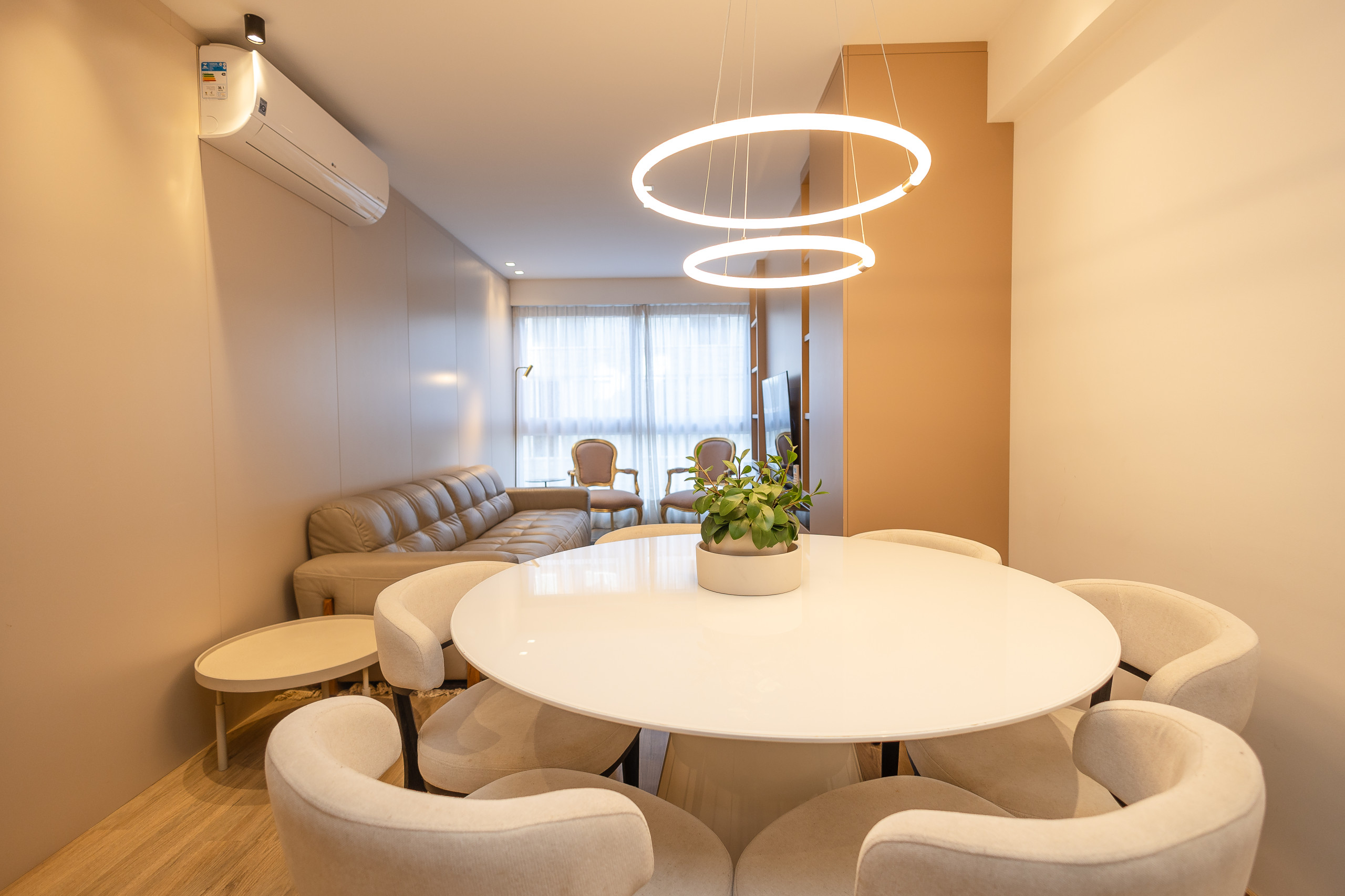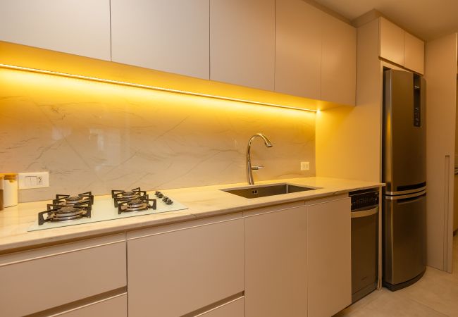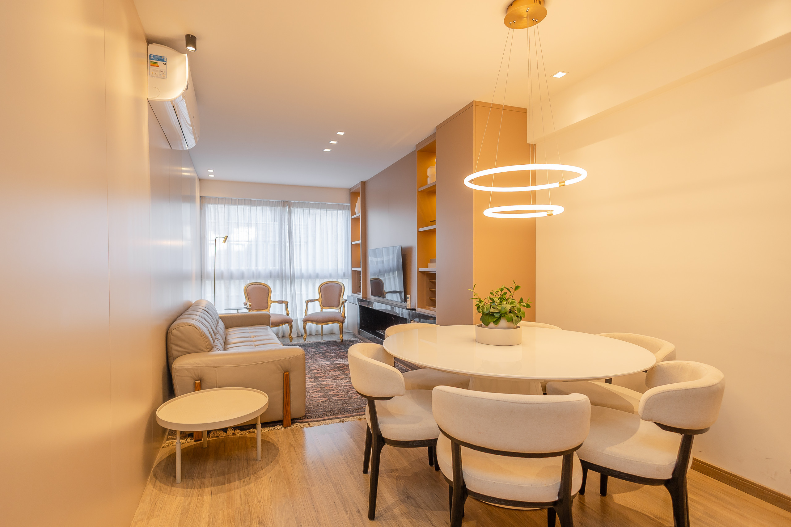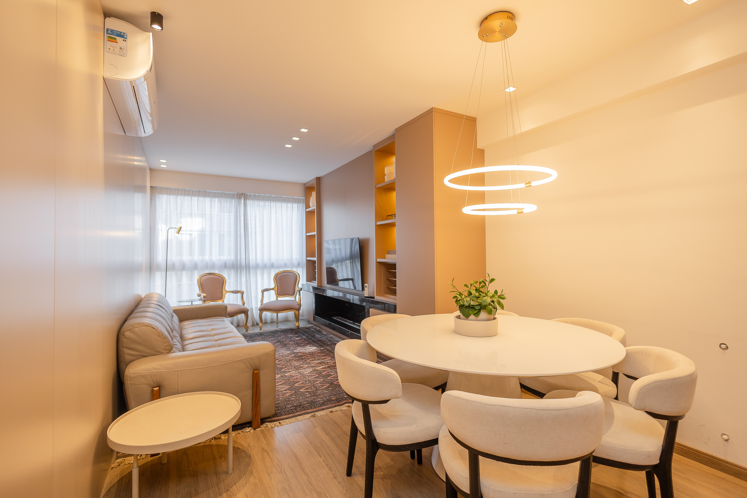 Apartamento moderno, decorado com muito bom gosto e cuidado, possui living 2 ambientes integrados e com lareira, cozinha completa com lava-louças, 2 suítes, lavabo. Todos os ambientes são equipados com smart TV e ar-condicionado quente/frio. Uma vaga de garagem. Imóvel muito bonito e confortável!