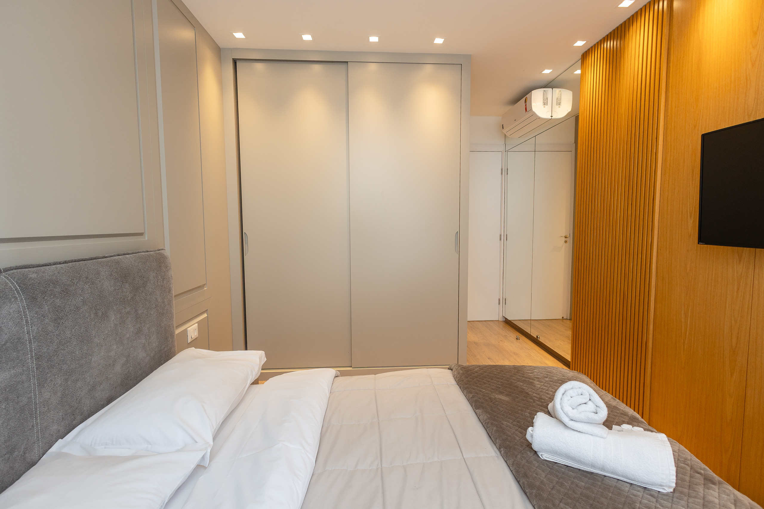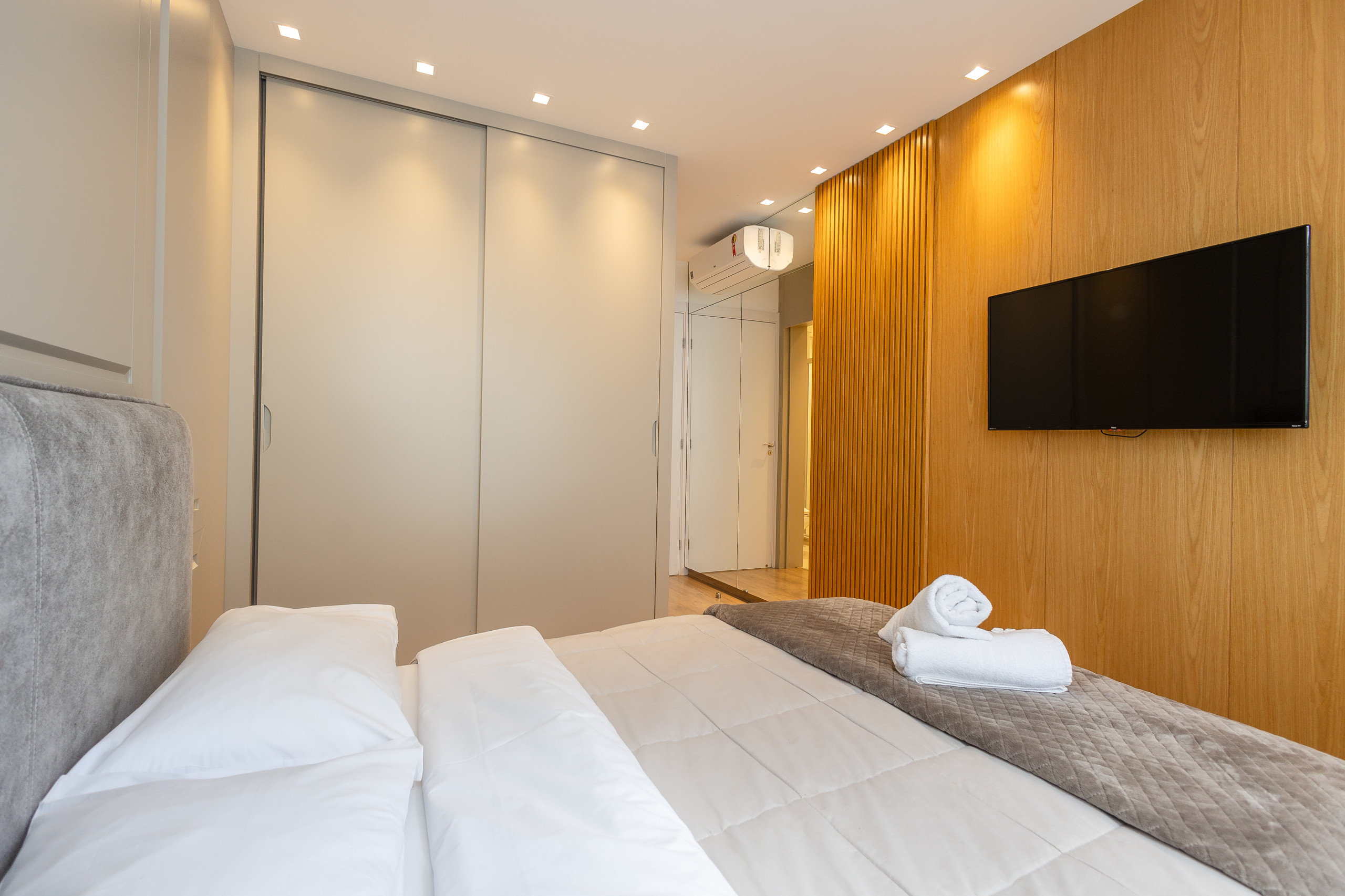 O imóvel possui um quarto, banheiro social, cozinha equipada, sala com dois ambientes (estar e jantar), sofá-cama, wi-fi de alta velocidade, smart TV e TV a cabo, aquecedor, sacada e uma vaga de garagem. O condomínio oferece piscina aquecida e quadra de tênis.