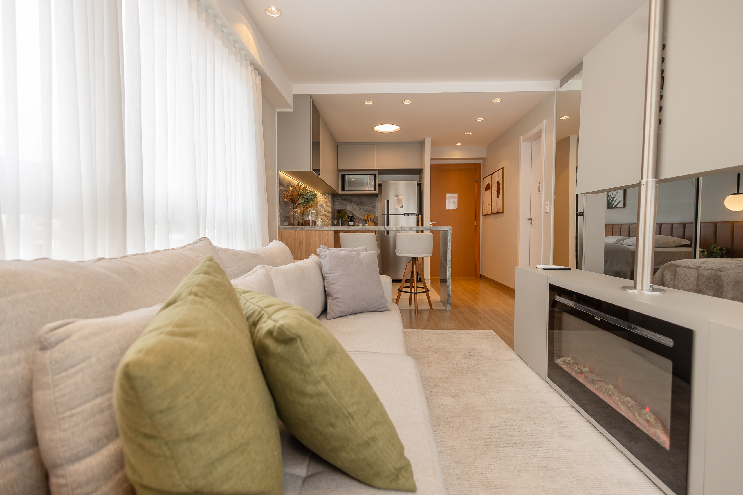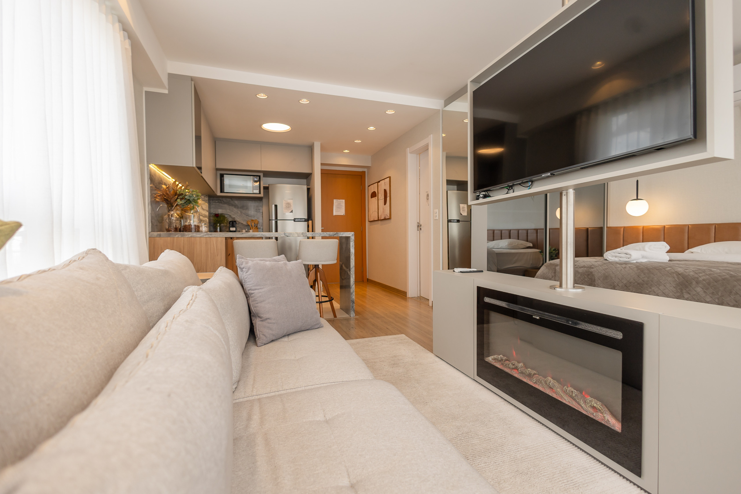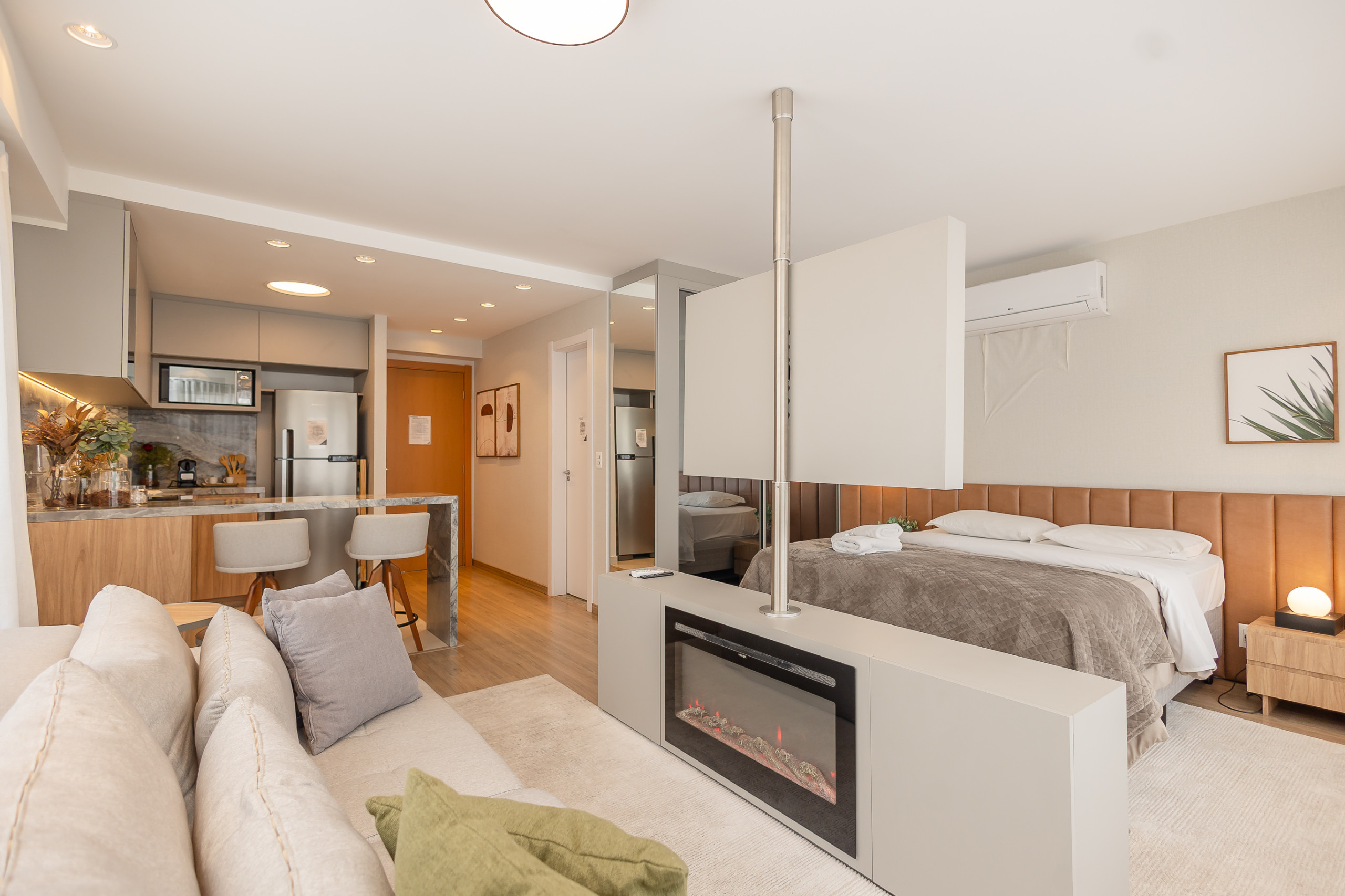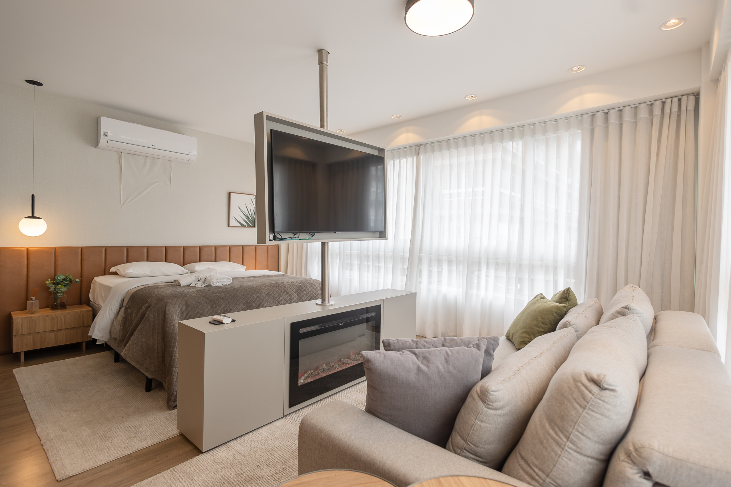 O imóvel possui um quarto, banheiro social, cozinha equipada, sala com dois ambientes (estar e jantar), sofá-cama, wi-fi de alta velocidade, smart TV e TV a cabo, aquecedor, sacada e uma vaga de garagem. O condomínio oferece piscina aquecida e quadra de tênis.