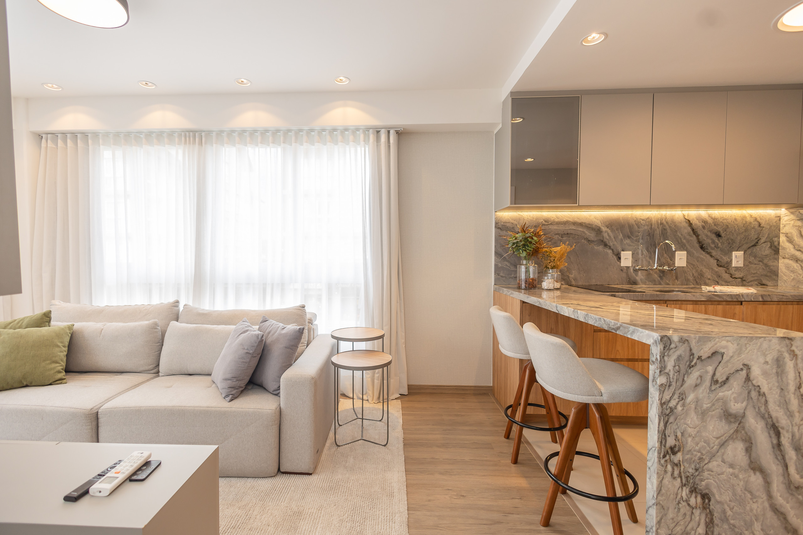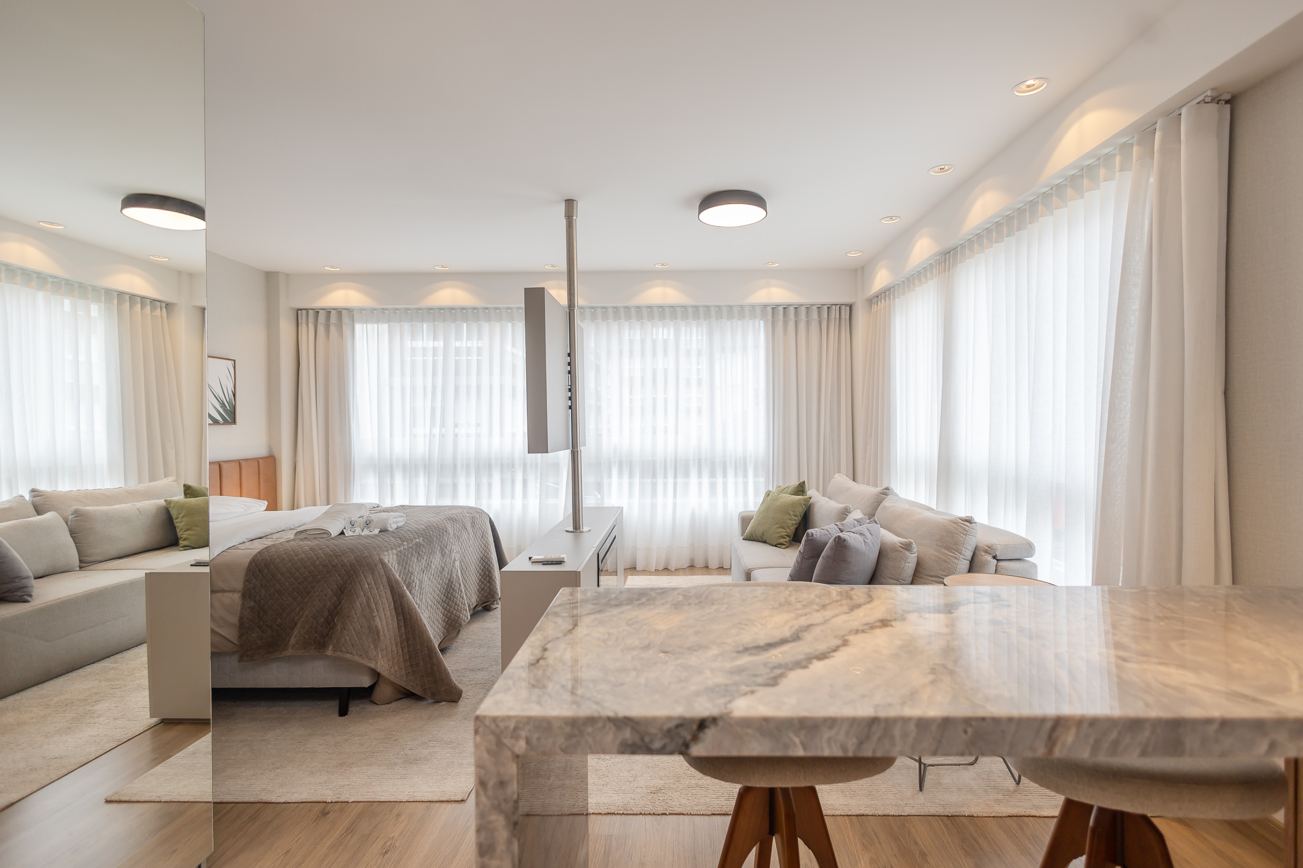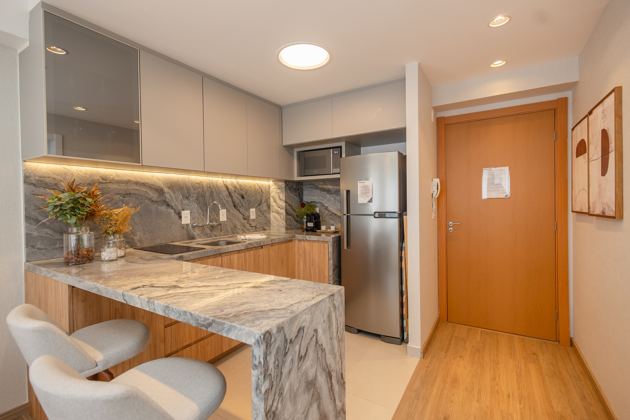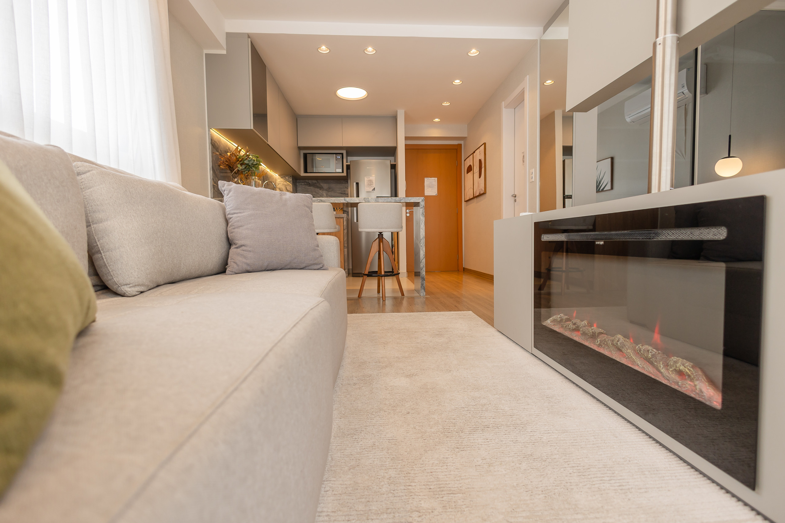 O imóvel possui um quarto, banheiro social, cozinha equipada, sala com dois ambientes (estar e jantar), sofá-cama, wi-fi de alta velocidade, smart TV e TV a cabo, aquecedor, sacada e uma vaga de garagem. O condomínio oferece piscina aquecida e quadra de tênis.