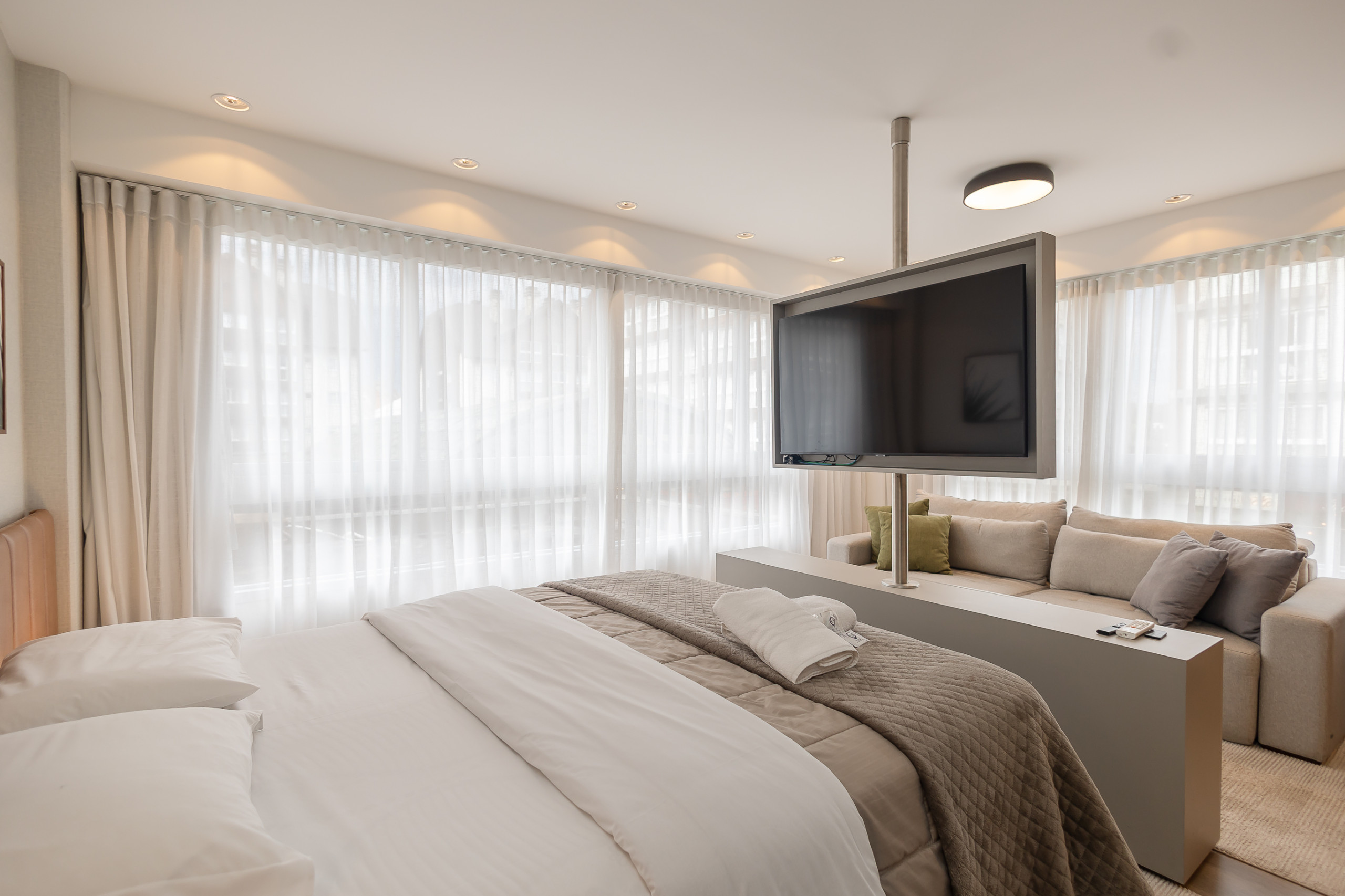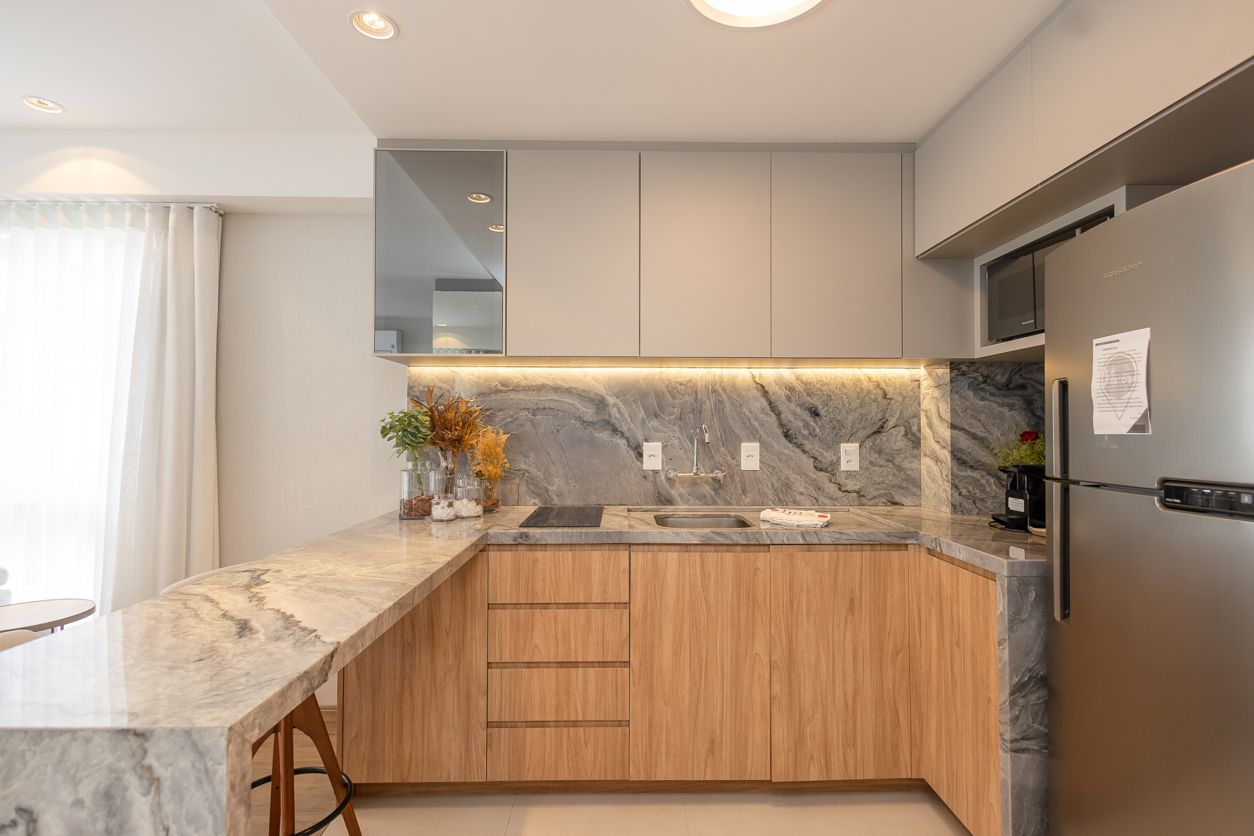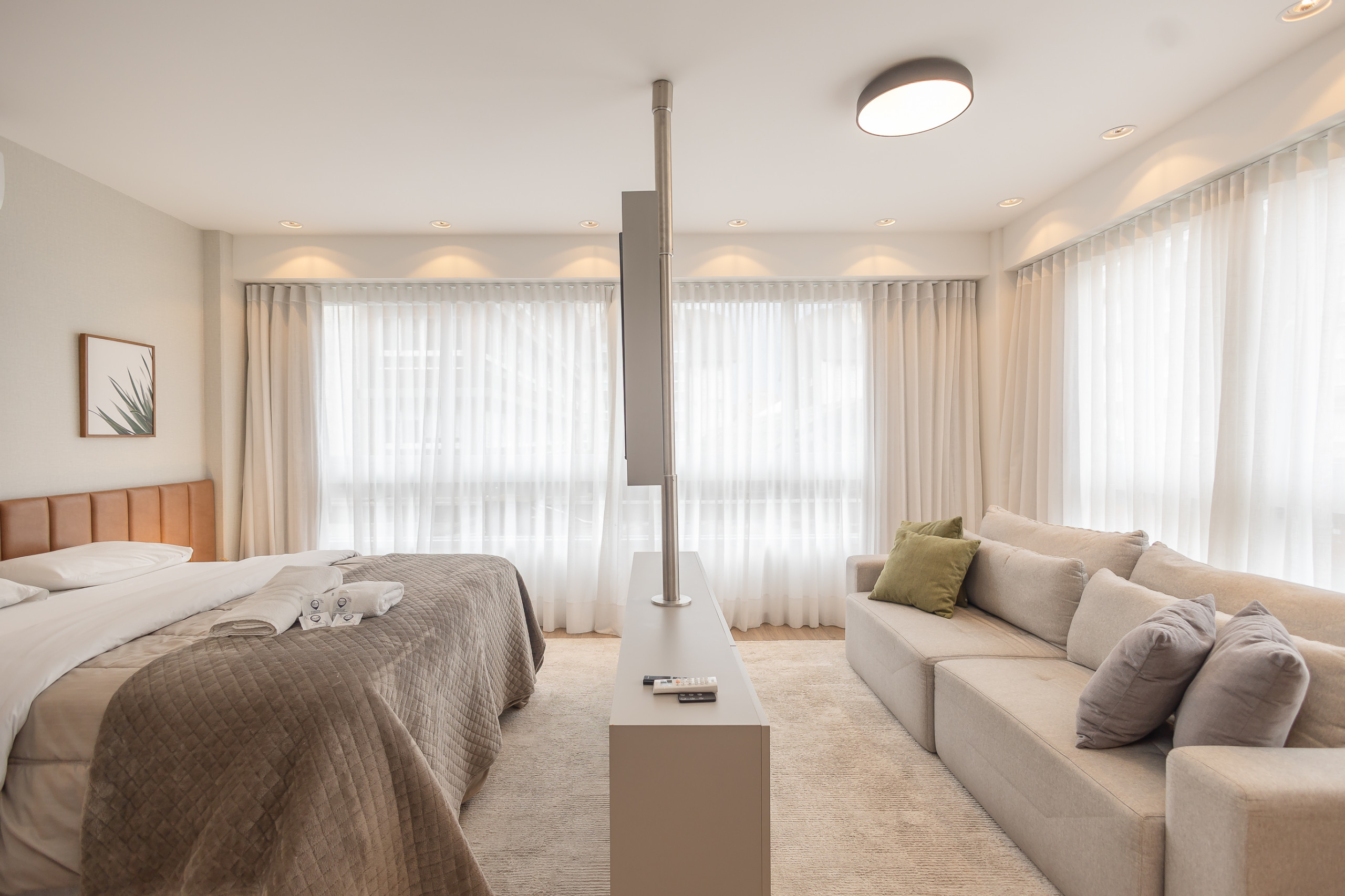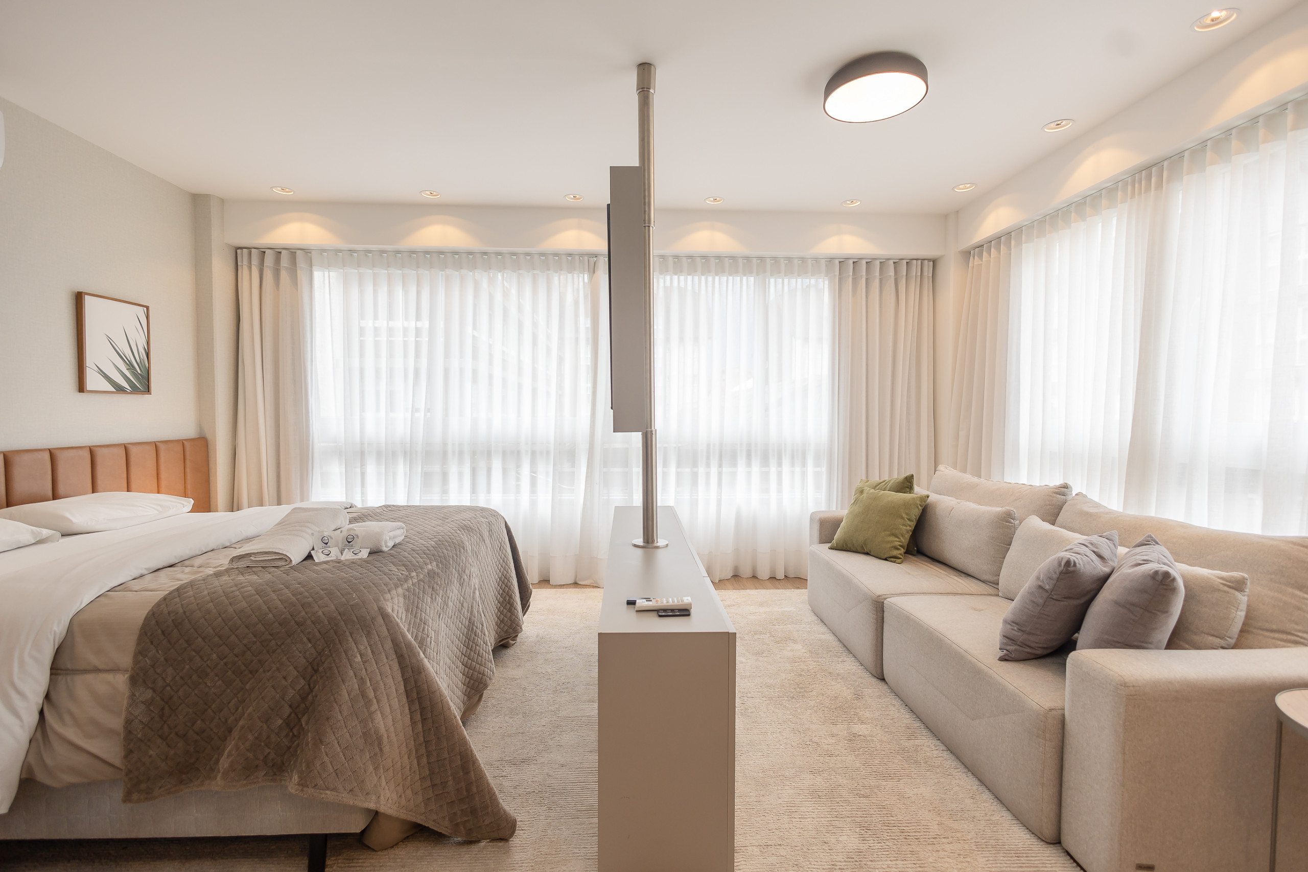O imóvel possui um quarto, banheiro social, cozinha equipada, sala com dois ambientes (estar e jantar), sofá-cama, wi-fi de alta velocidade, smart TV e TV a cabo, aquecedor, sacada e uma vaga de garagem. O condomínio oferece piscina aquecida e quadra de tênis.