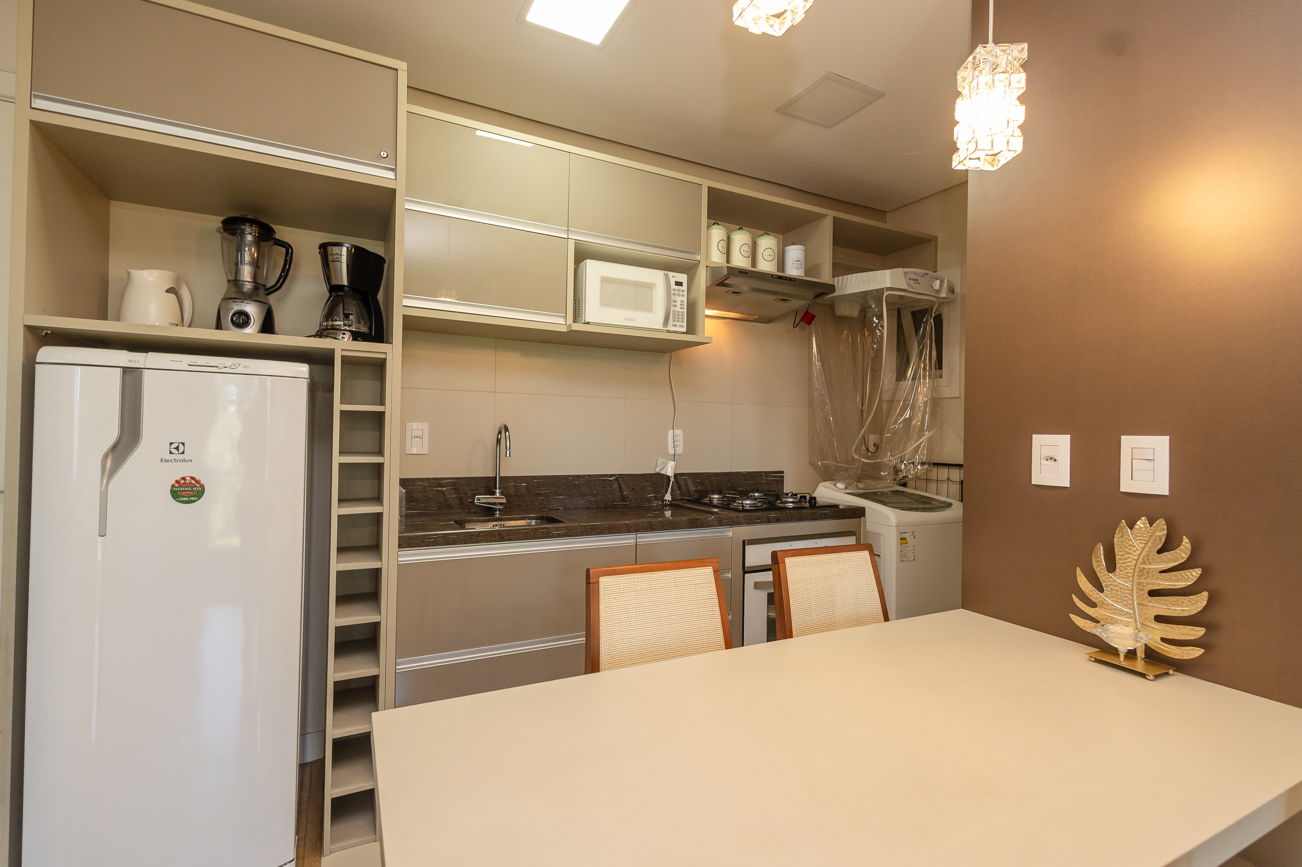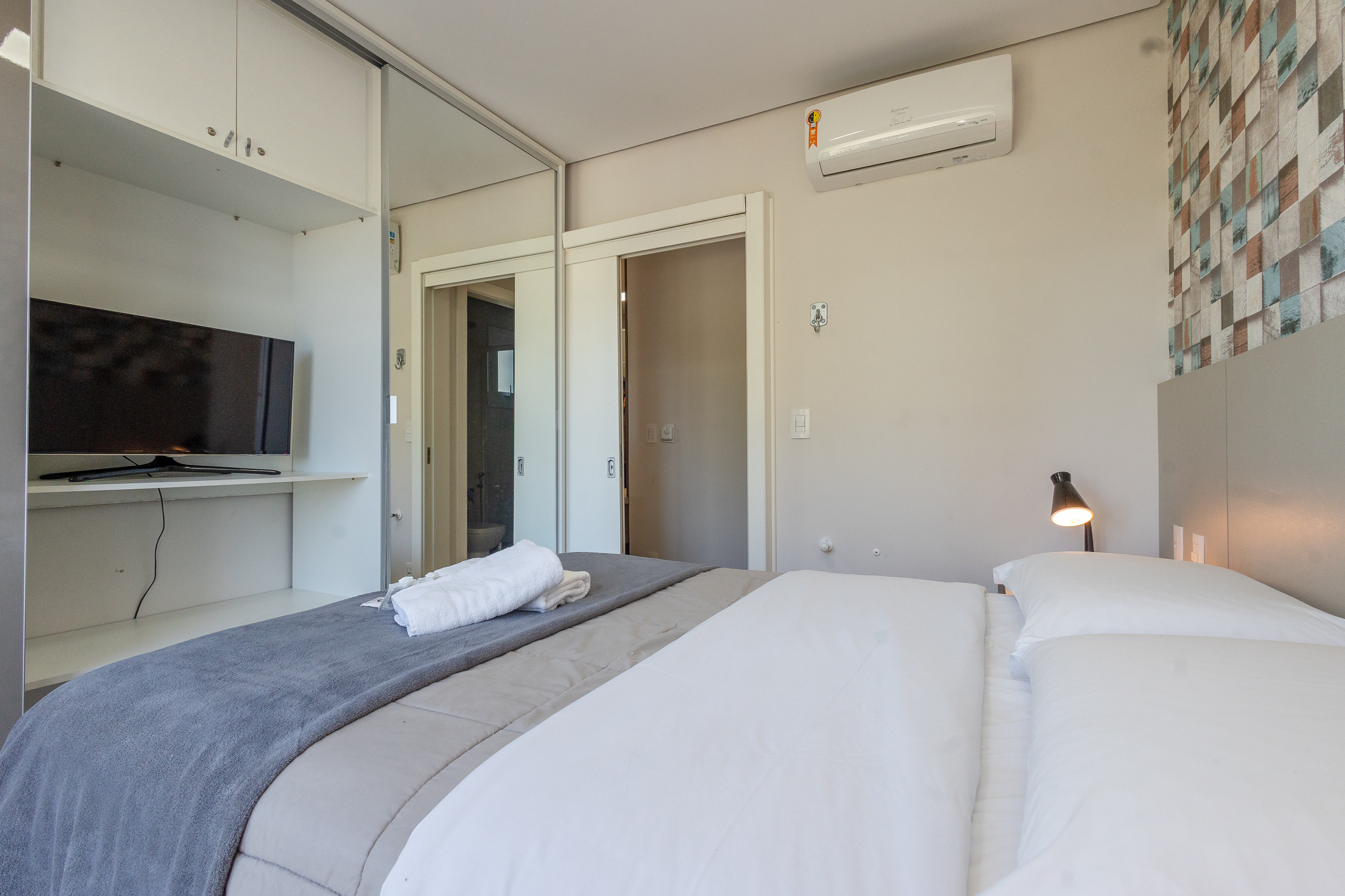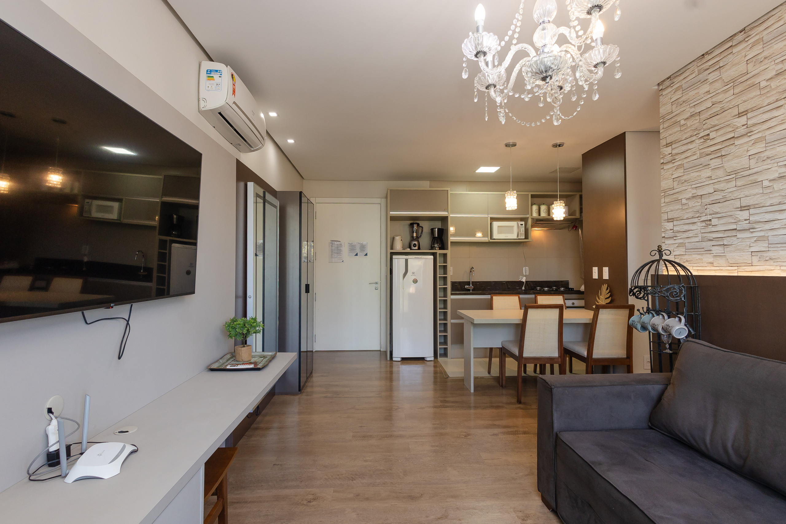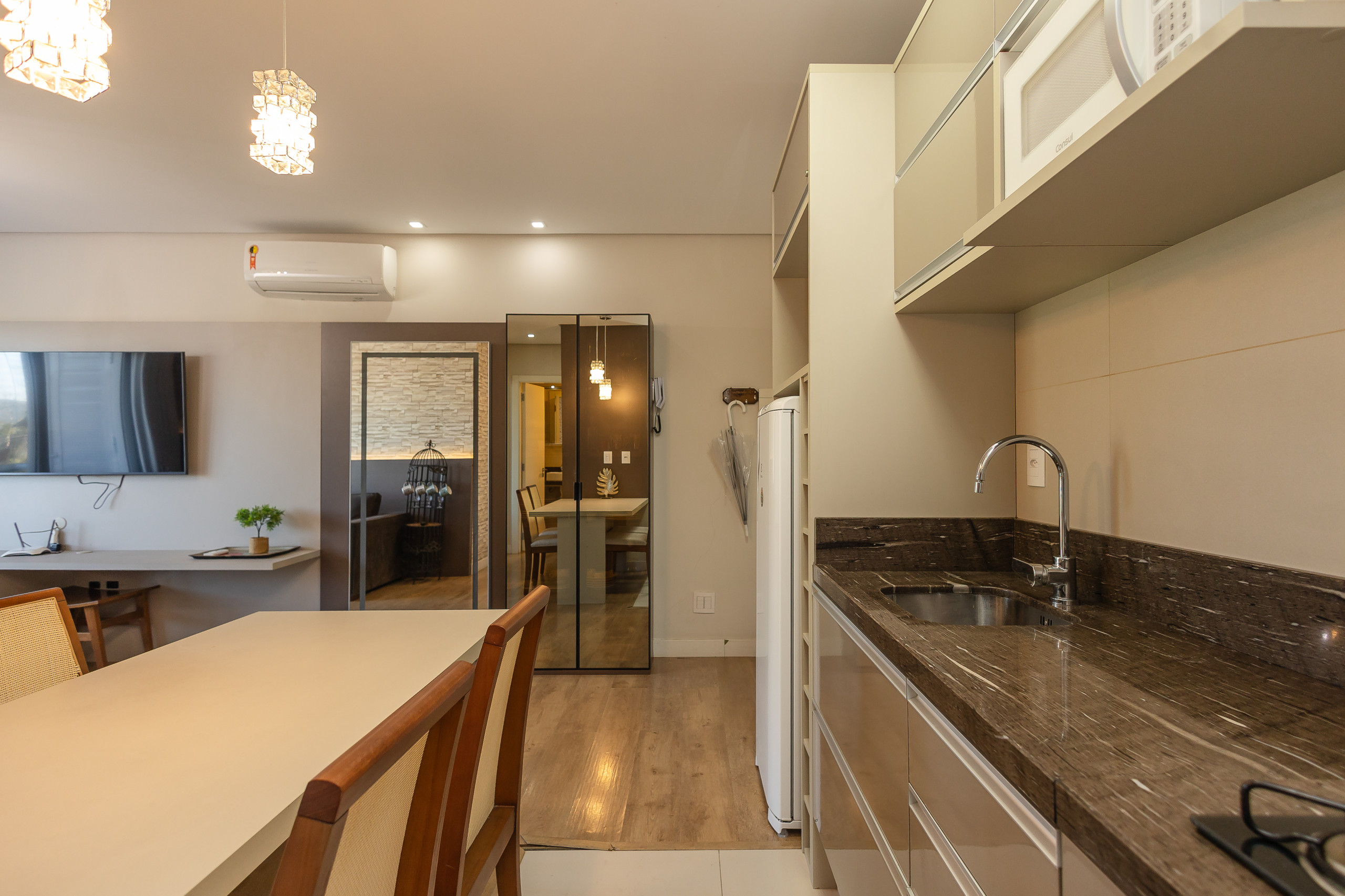 O imóvel possui um quarto, banheiro social, cozinha equipada, sala com dois ambientes (estar e jantar), sofá-cama, wi-fi de alta velocidade, smart TV e TV a cabo, aquecedor, sacada e uma vaga de garagem. O condomínio oferece piscina aquecida e quadra de tênis.