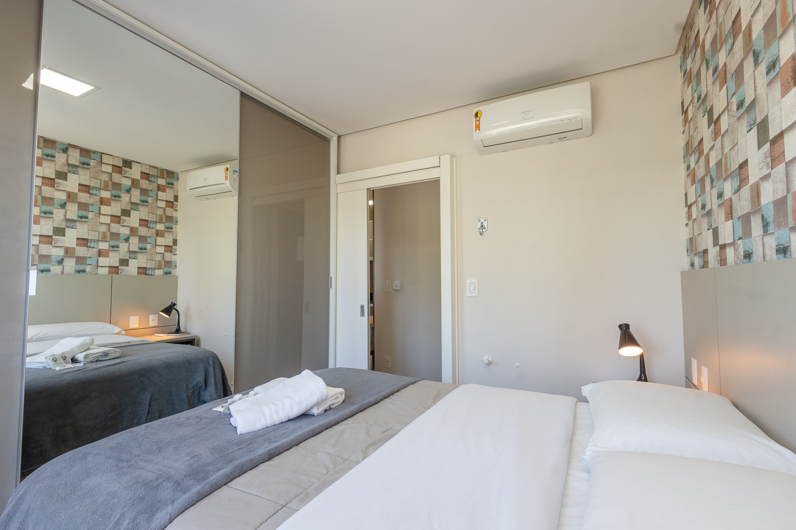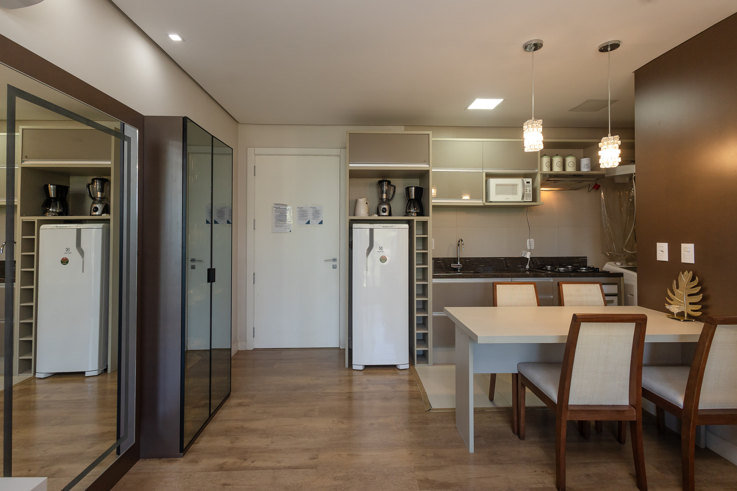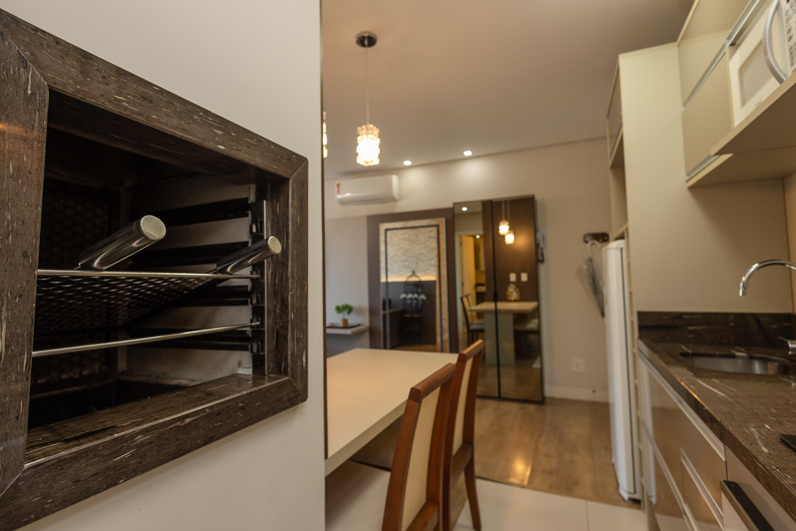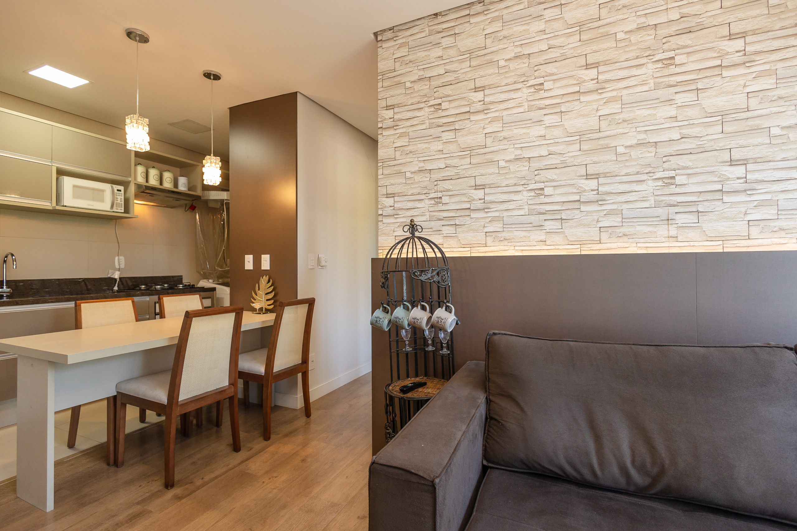 O imóvel possui um quarto, banheiro social, cozinha equipada, sala com dois ambientes (estar e jantar), sofá-cama, wi-fi de alta velocidade, smart TV e TV a cabo, aquecedor, sacada e uma vaga de garagem. O condomínio oferece piscina aquecida e quadra de tênis.