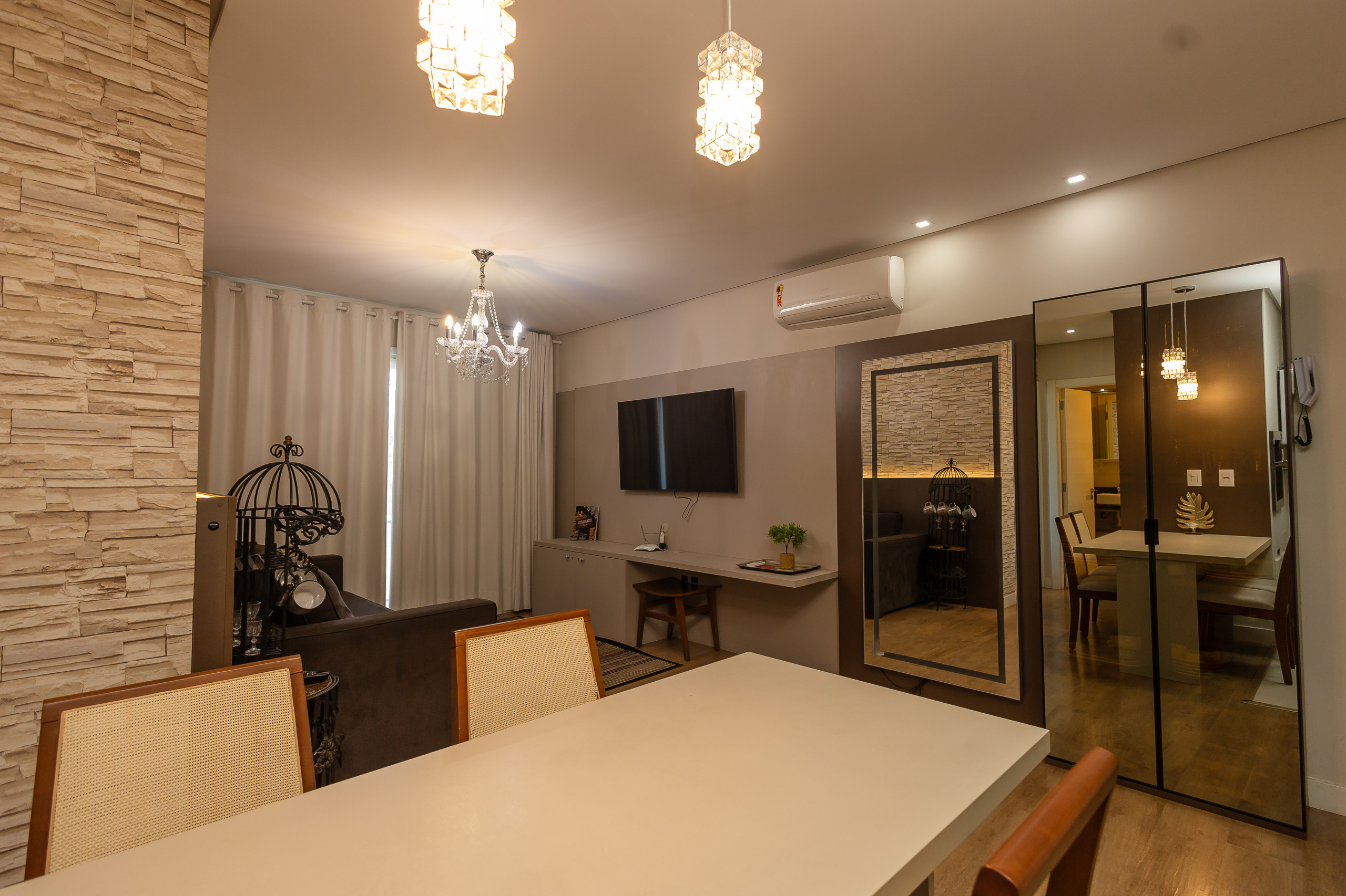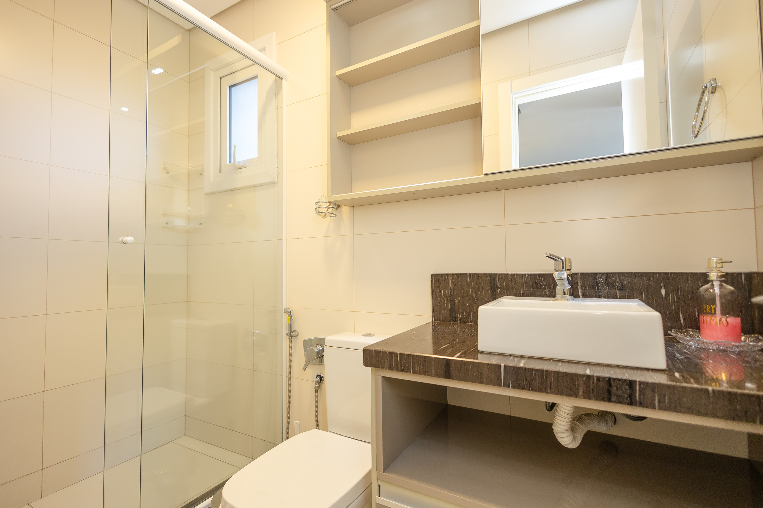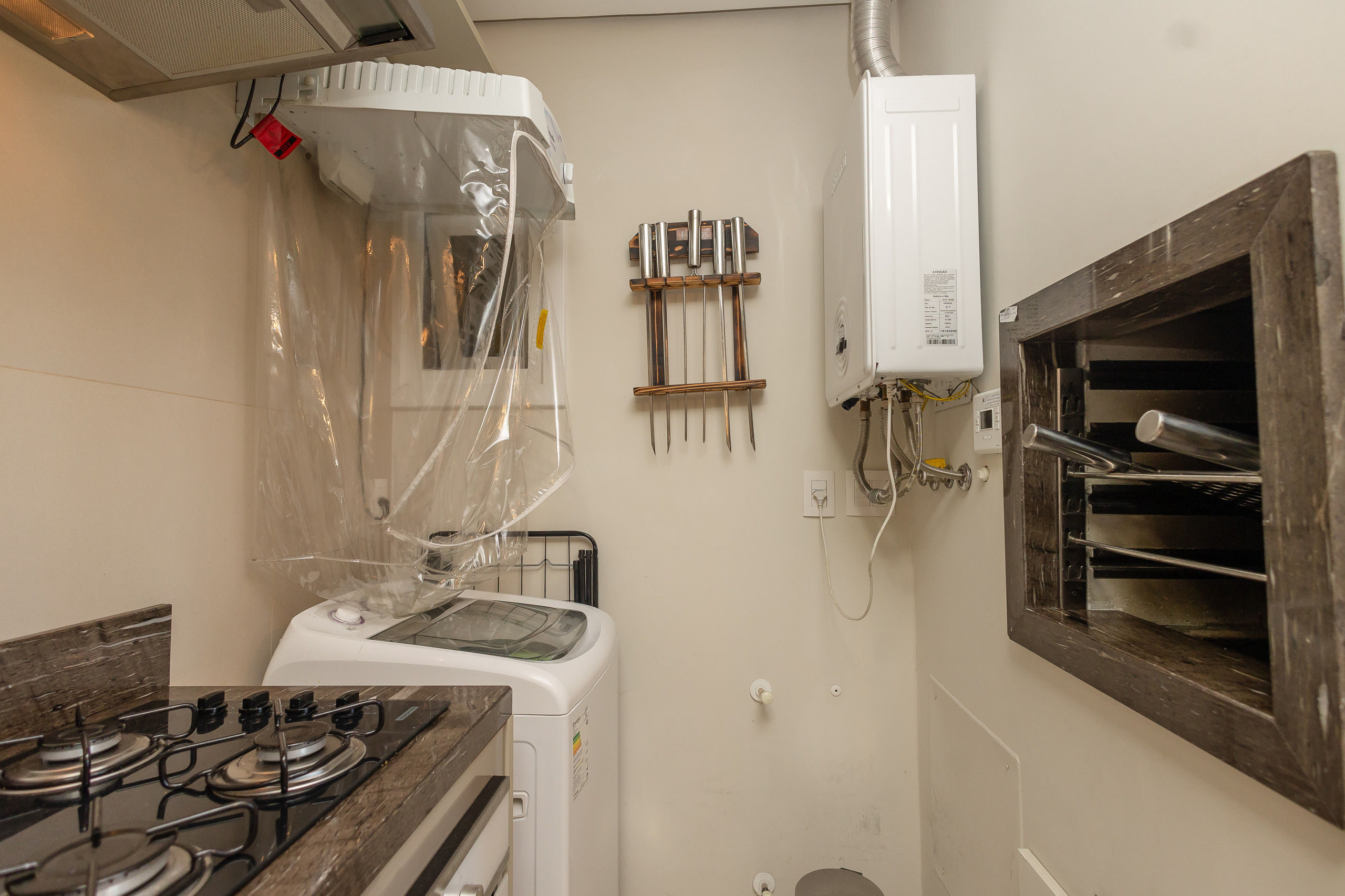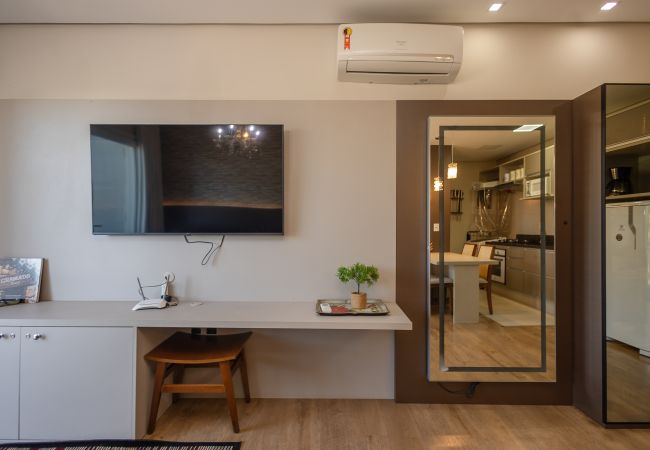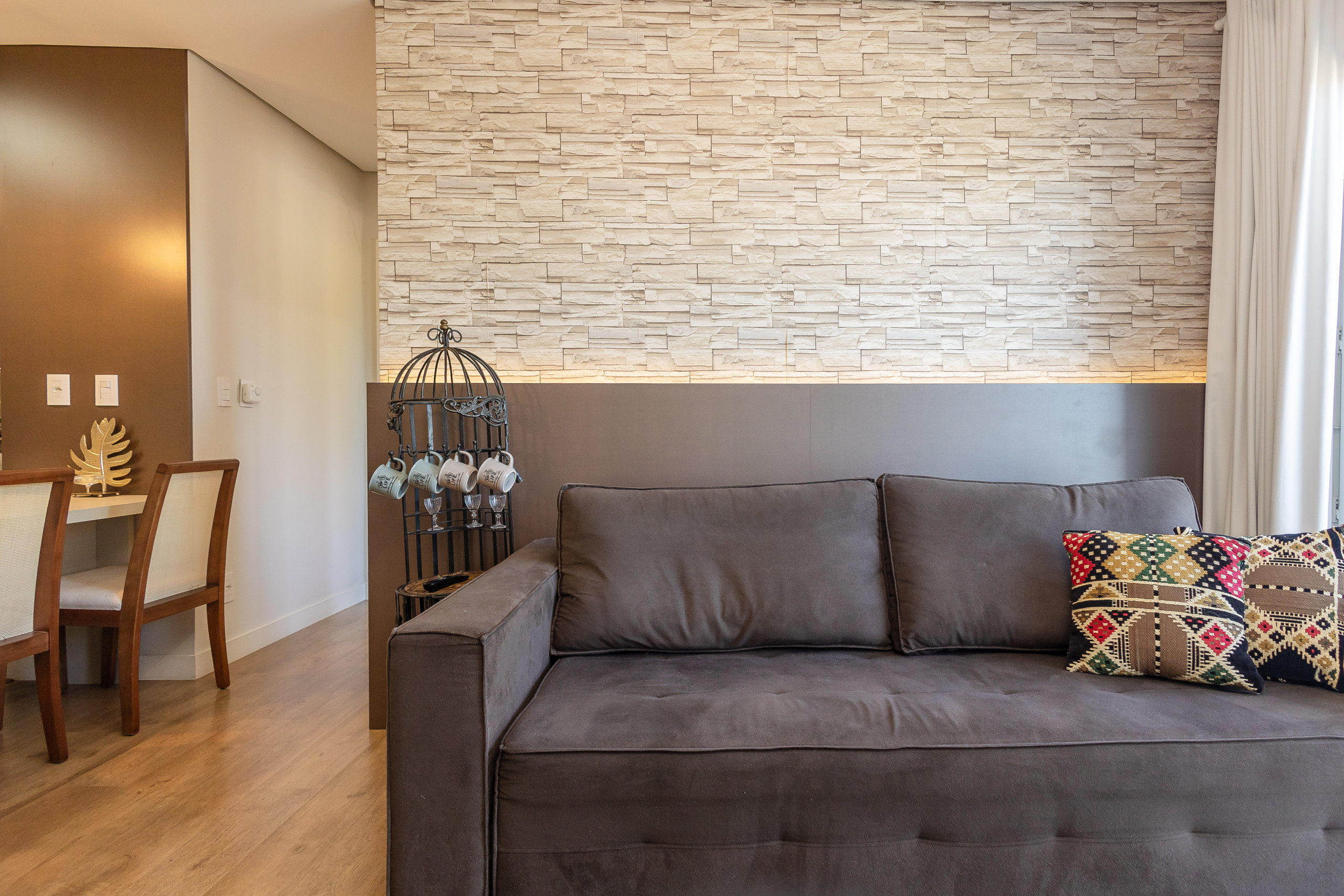 O imóvel possui um quarto, banheiro social, cozinha equipada, sala com dois ambientes (estar e jantar), sofá-cama, wi-fi de alta velocidade, smart TV e TV a cabo, aquecedor, sacada e uma vaga de garagem. O condomínio oferece piscina aquecida e quadra de tênis.