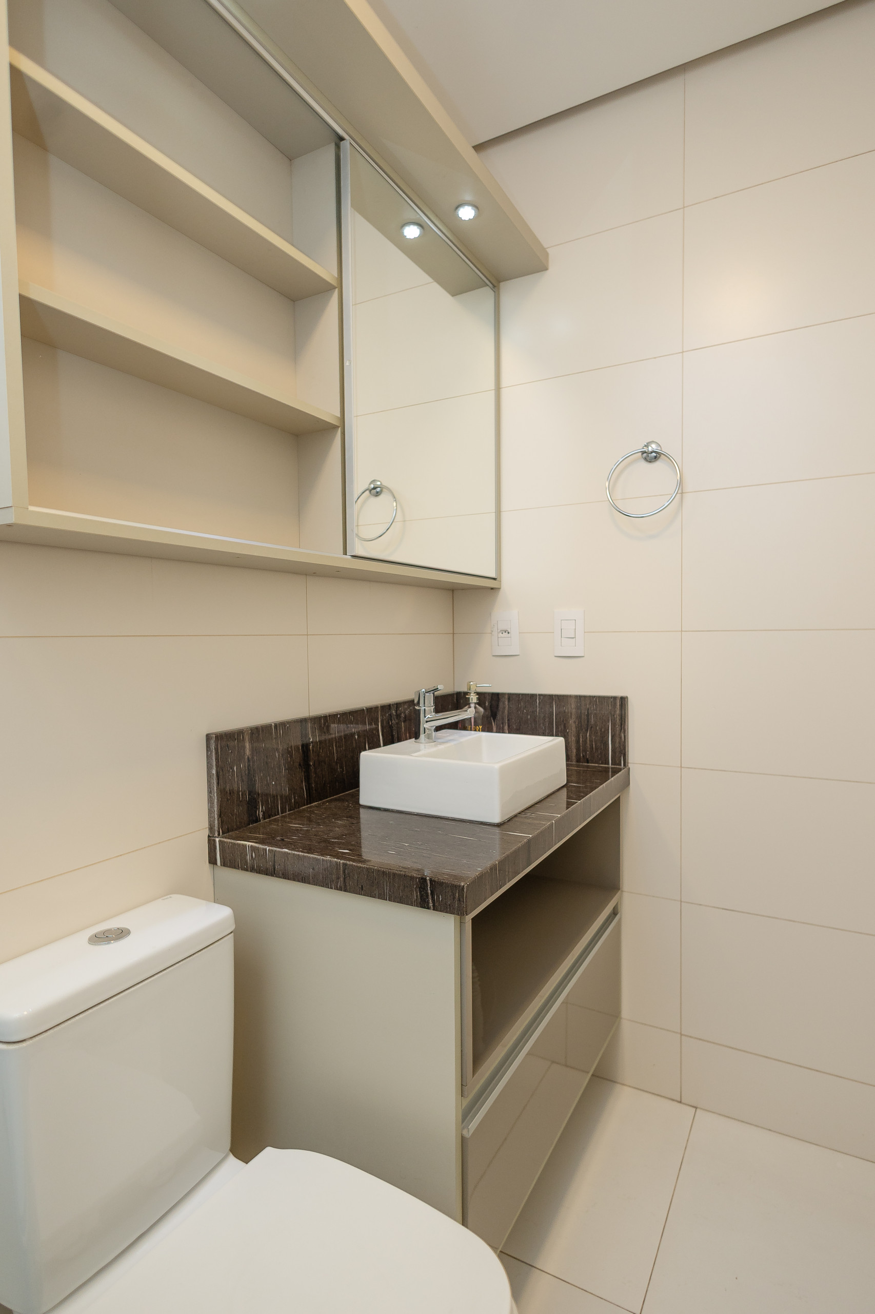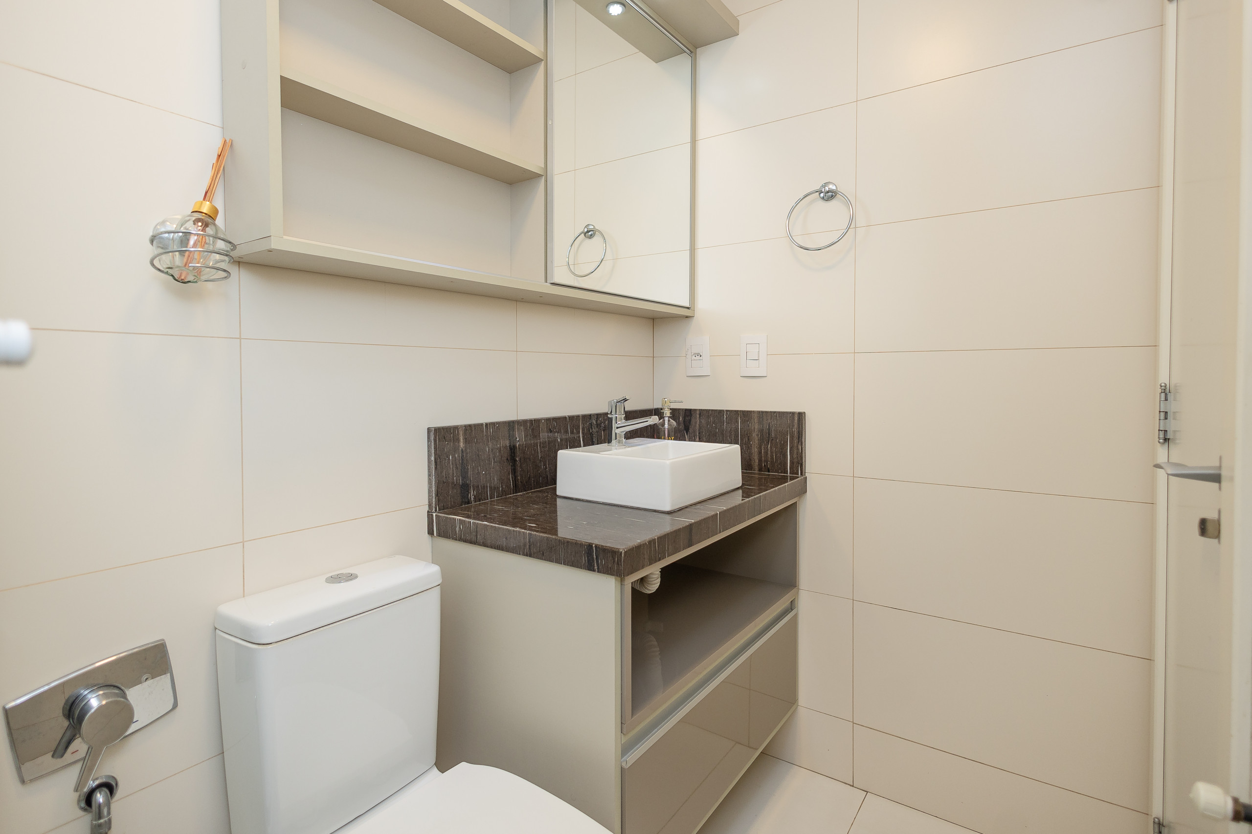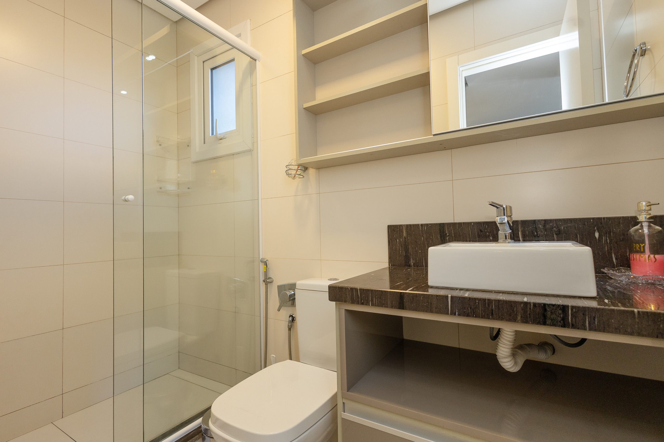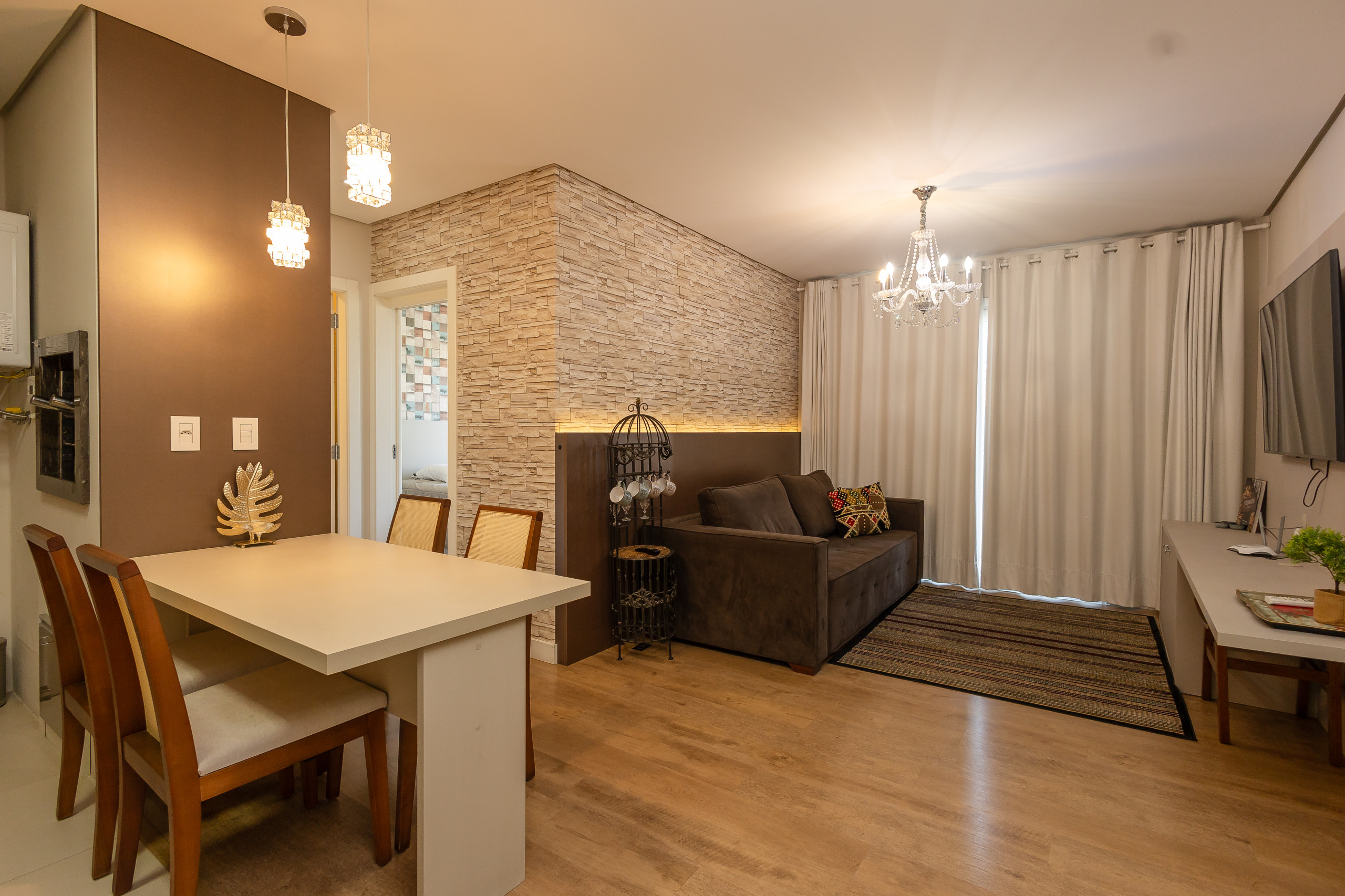 O imóvel possui um quarto, banheiro social, cozinha equipada, sala com dois ambientes (estar e jantar), sofá-cama, wi-fi de alta velocidade, smart TV e TV a cabo, aquecedor, sacada e uma vaga de garagem. O condomínio oferece piscina aquecida e quadra de tênis.