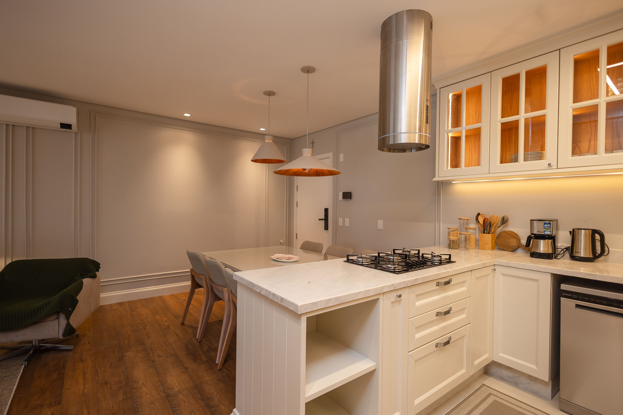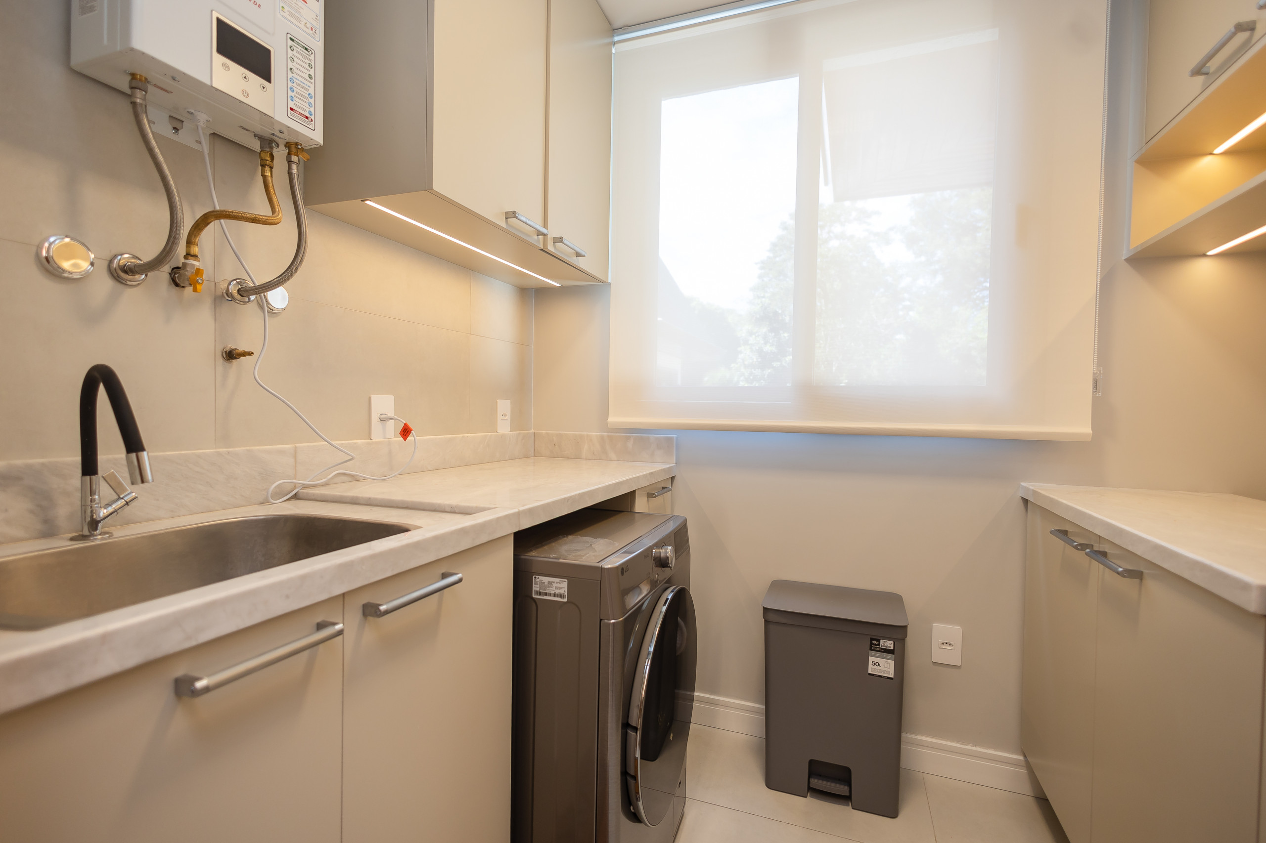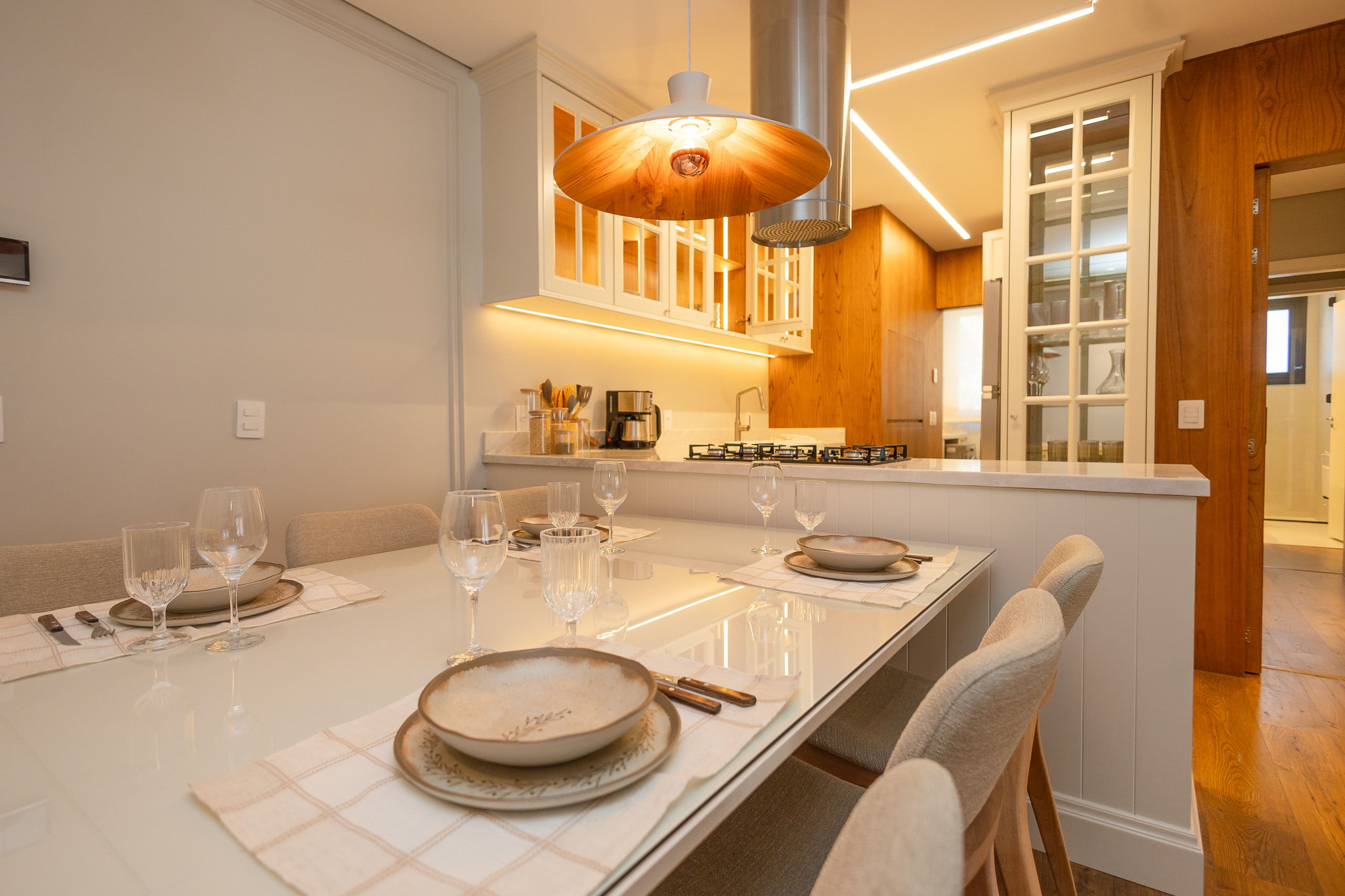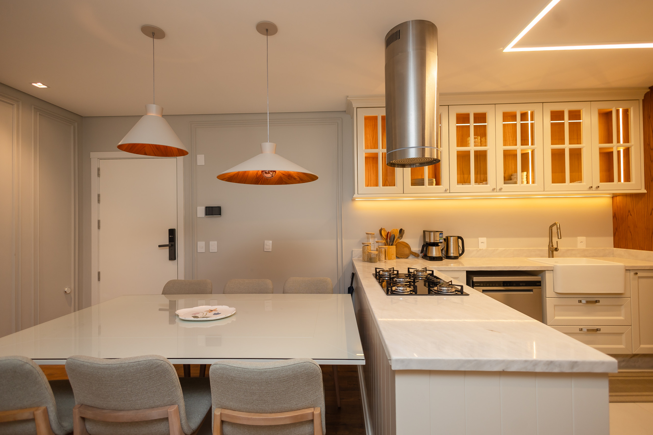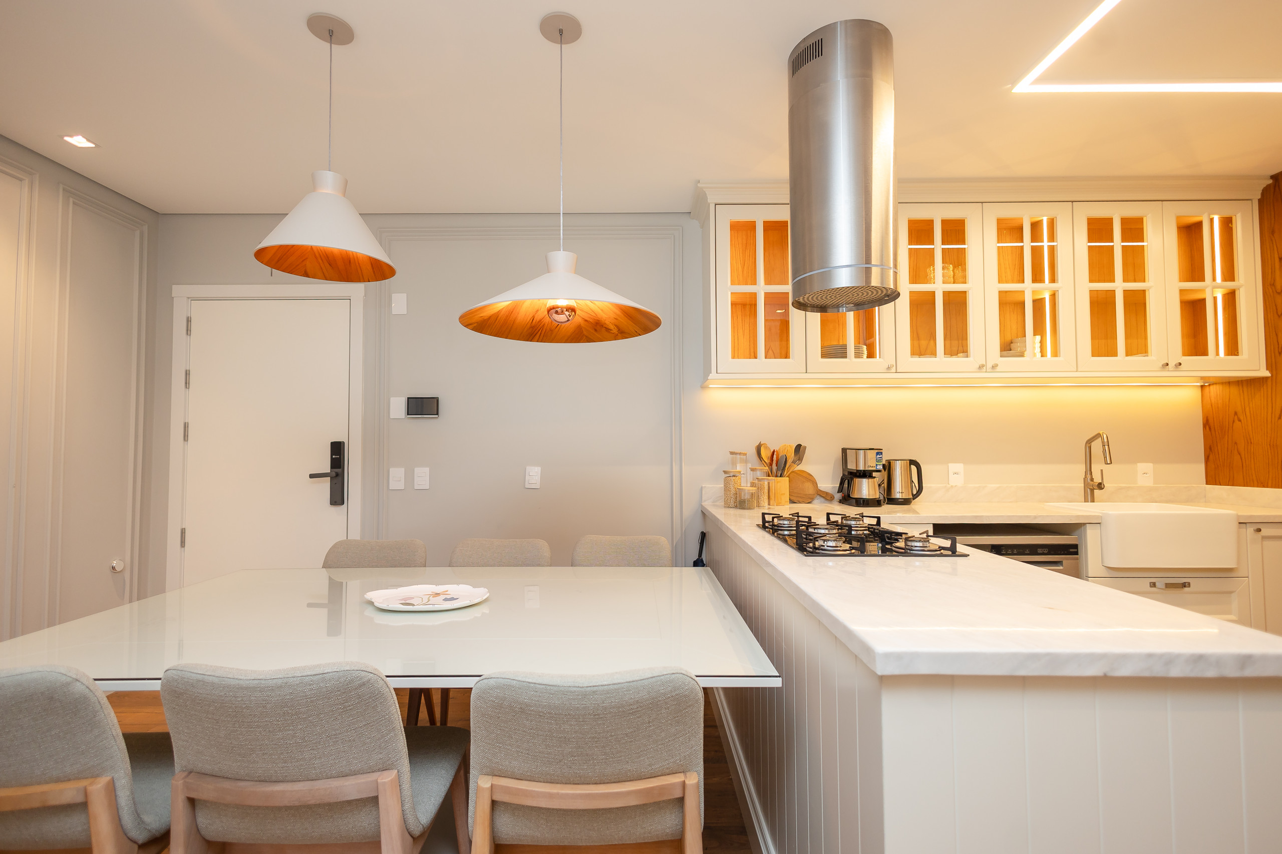 A cozinha completa conta com lava louças, churrasqueira, geladeira, cafeteira, sanduicheira, micro-ondas, cooktop e fogão. À mesa, poderão sentar-se até 06 hospedes para refeições ou para simplesmente apreciar um chocolate quente ou um vinho. O apartamento ainda dispõe de lavanderia com lava e seca.