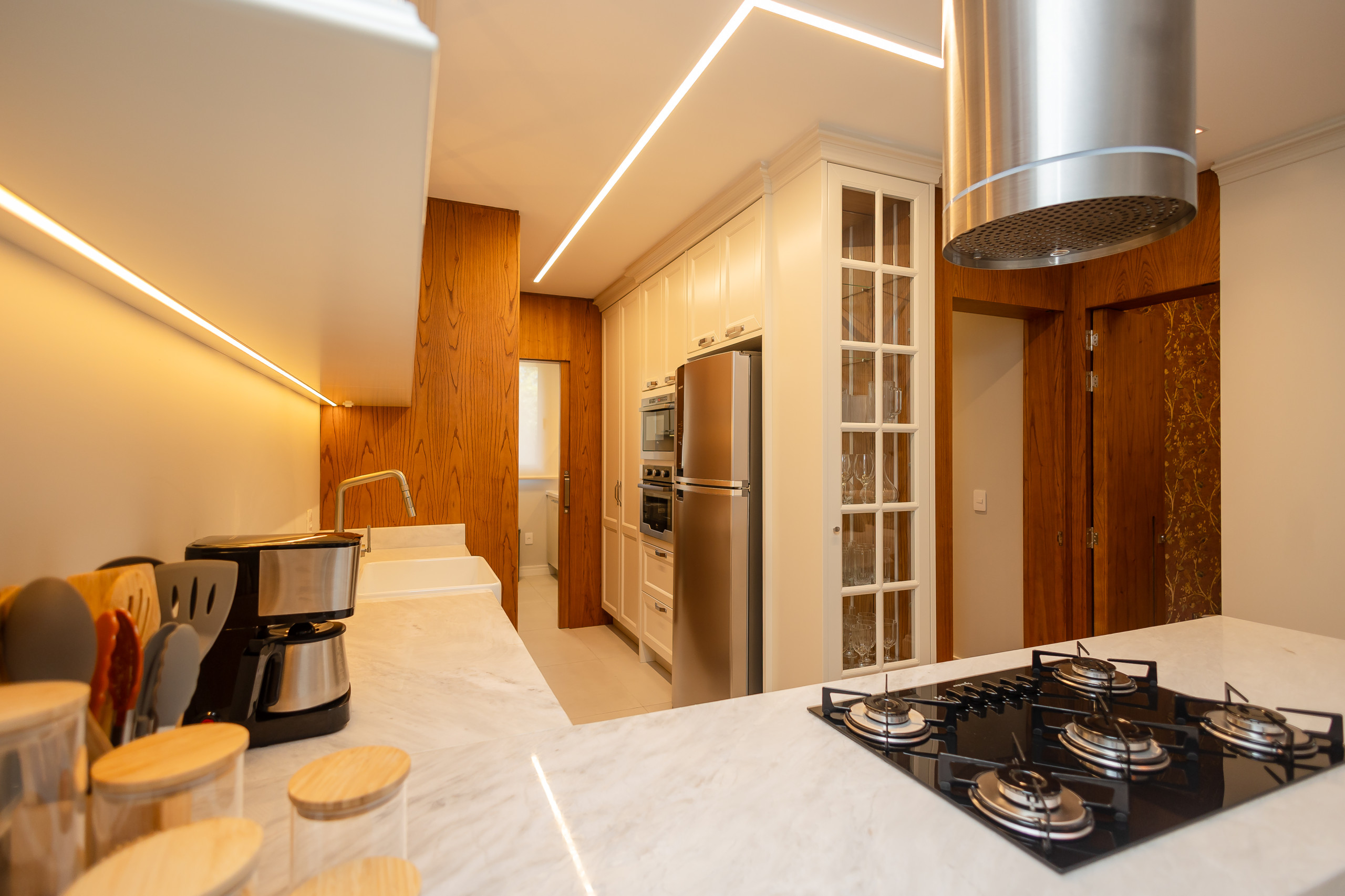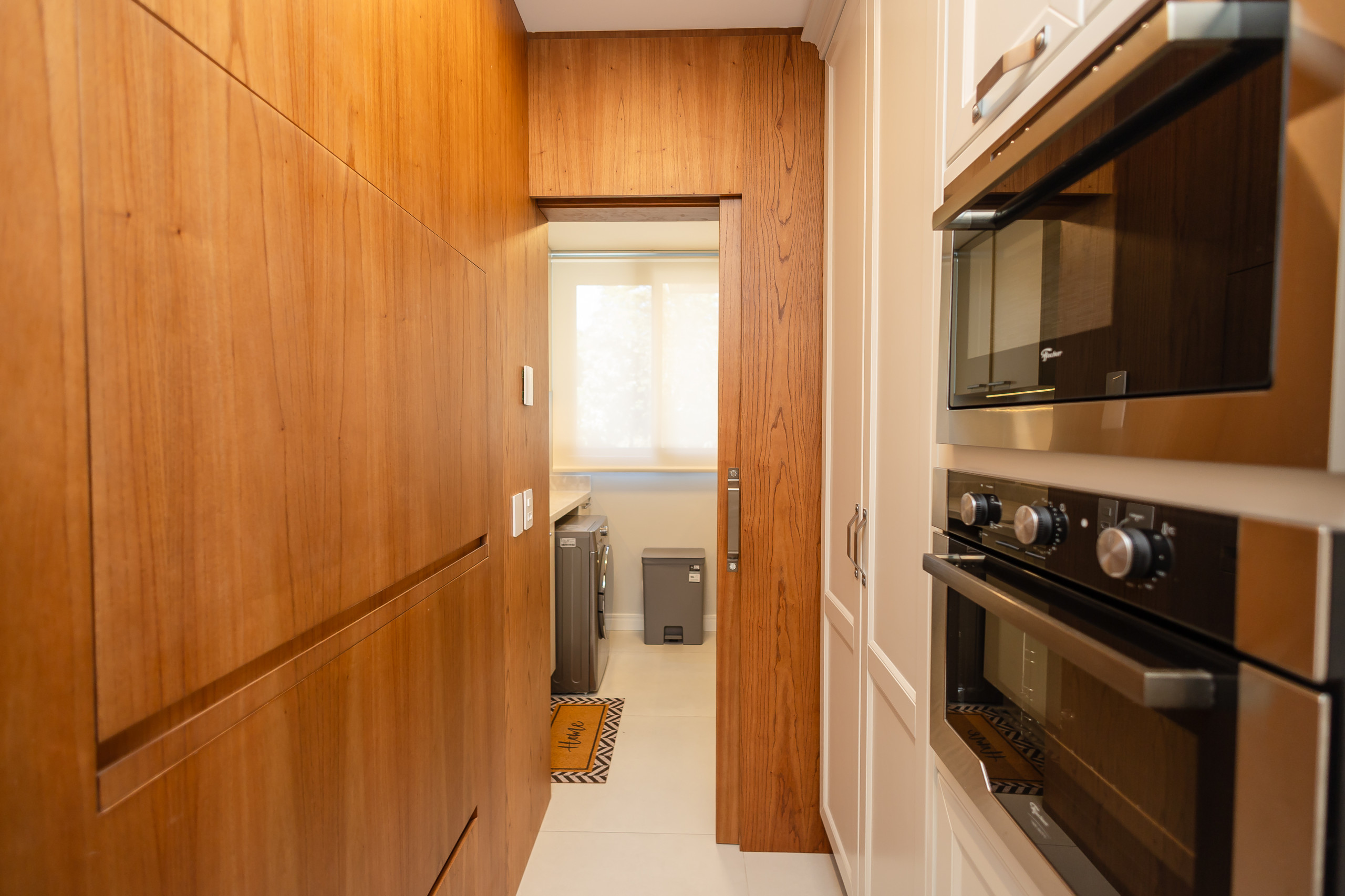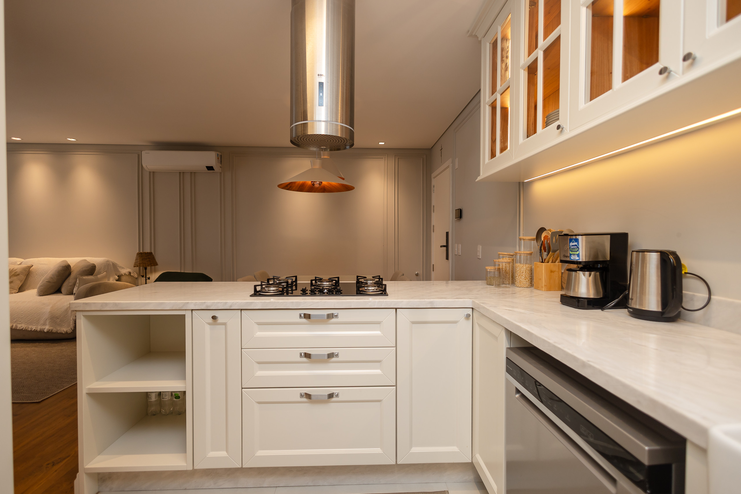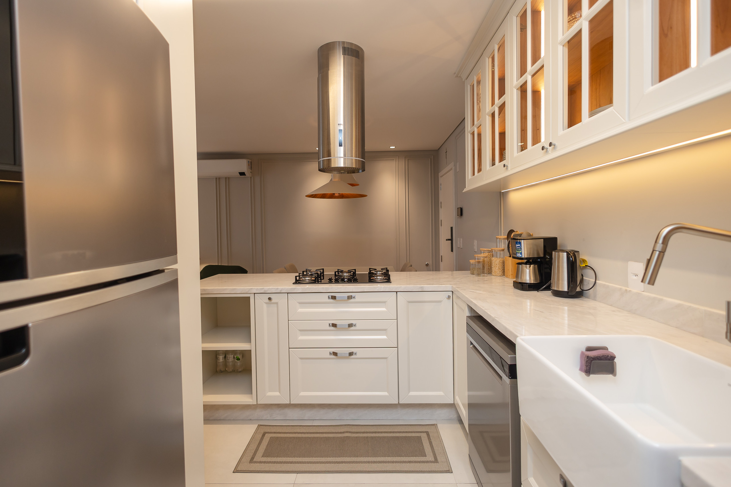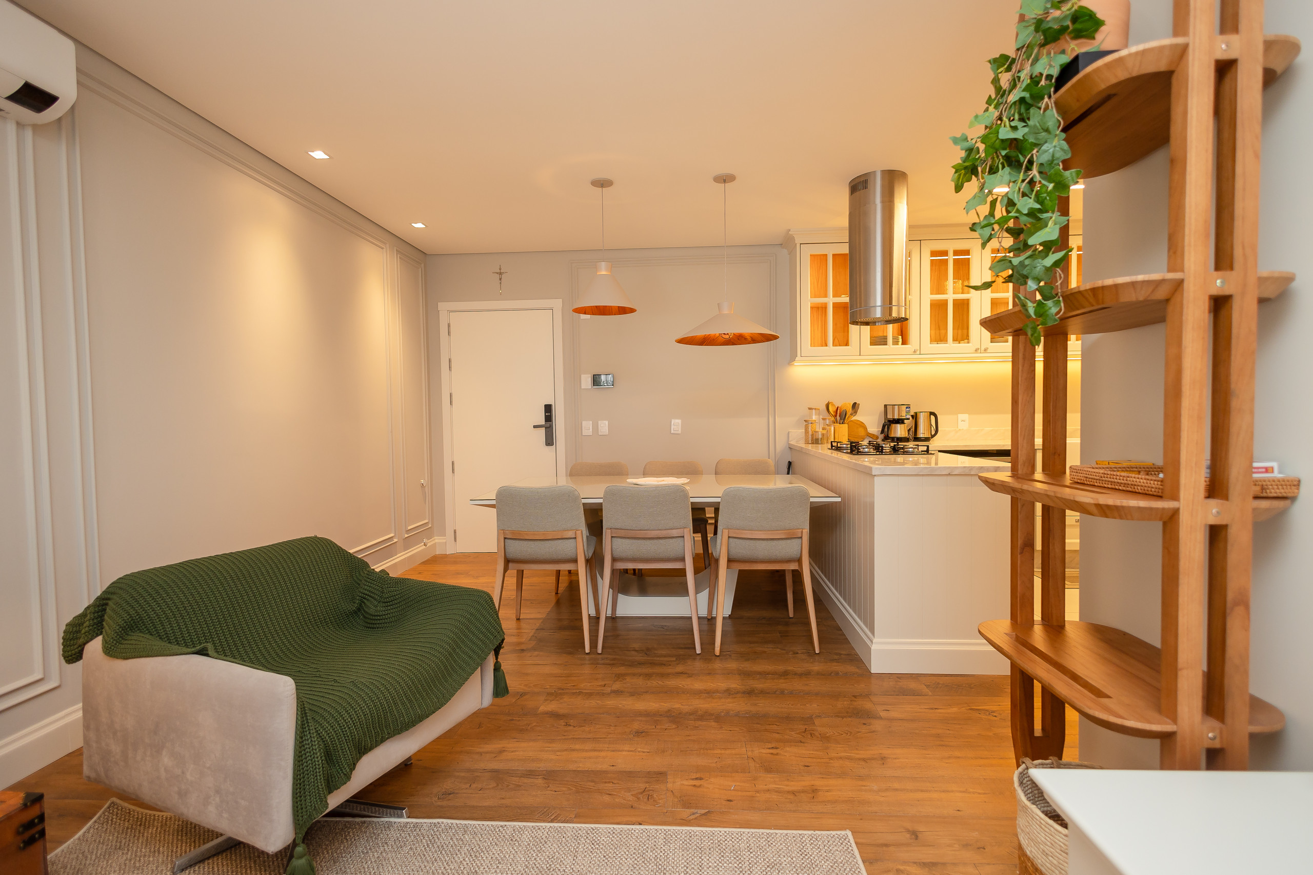 A cozinha completa conta com lava louças, churrasqueira, geladeira, cafeteira, sanduicheira, micro-ondas, cooktop e fogão. À mesa, poderão sentar-se até 06 hospedes para refeições ou para simplesmente apreciar um chocolate quente ou um vinho. O apartamento ainda dispõe de lavanderia com lava e seca.
