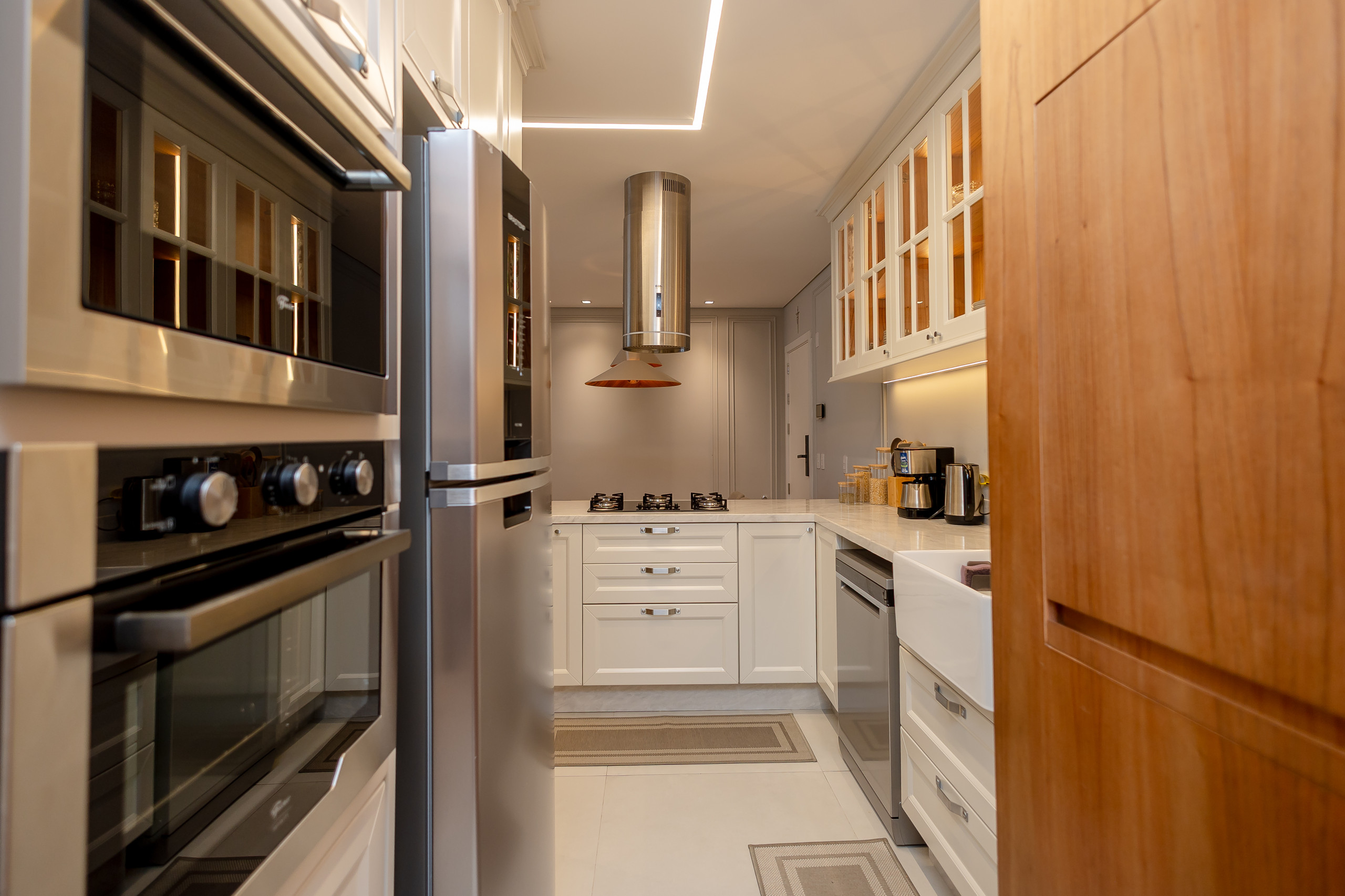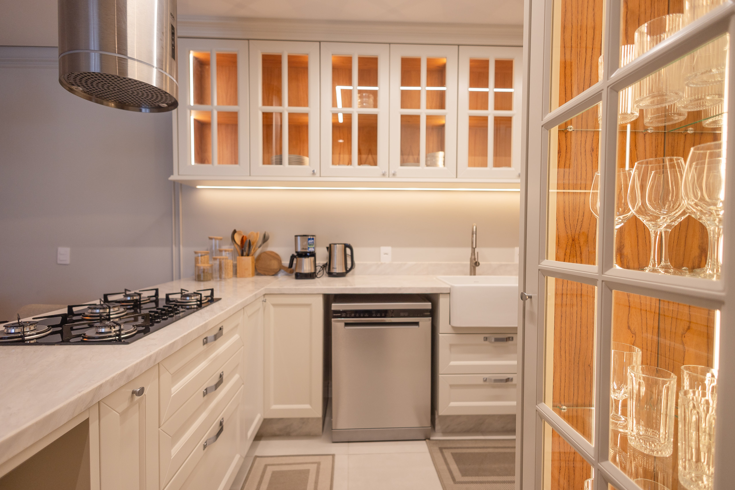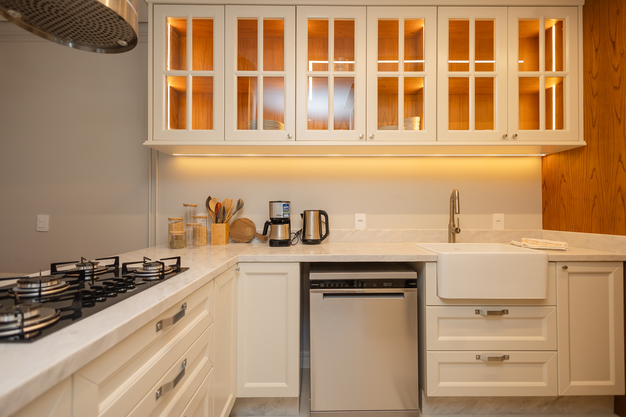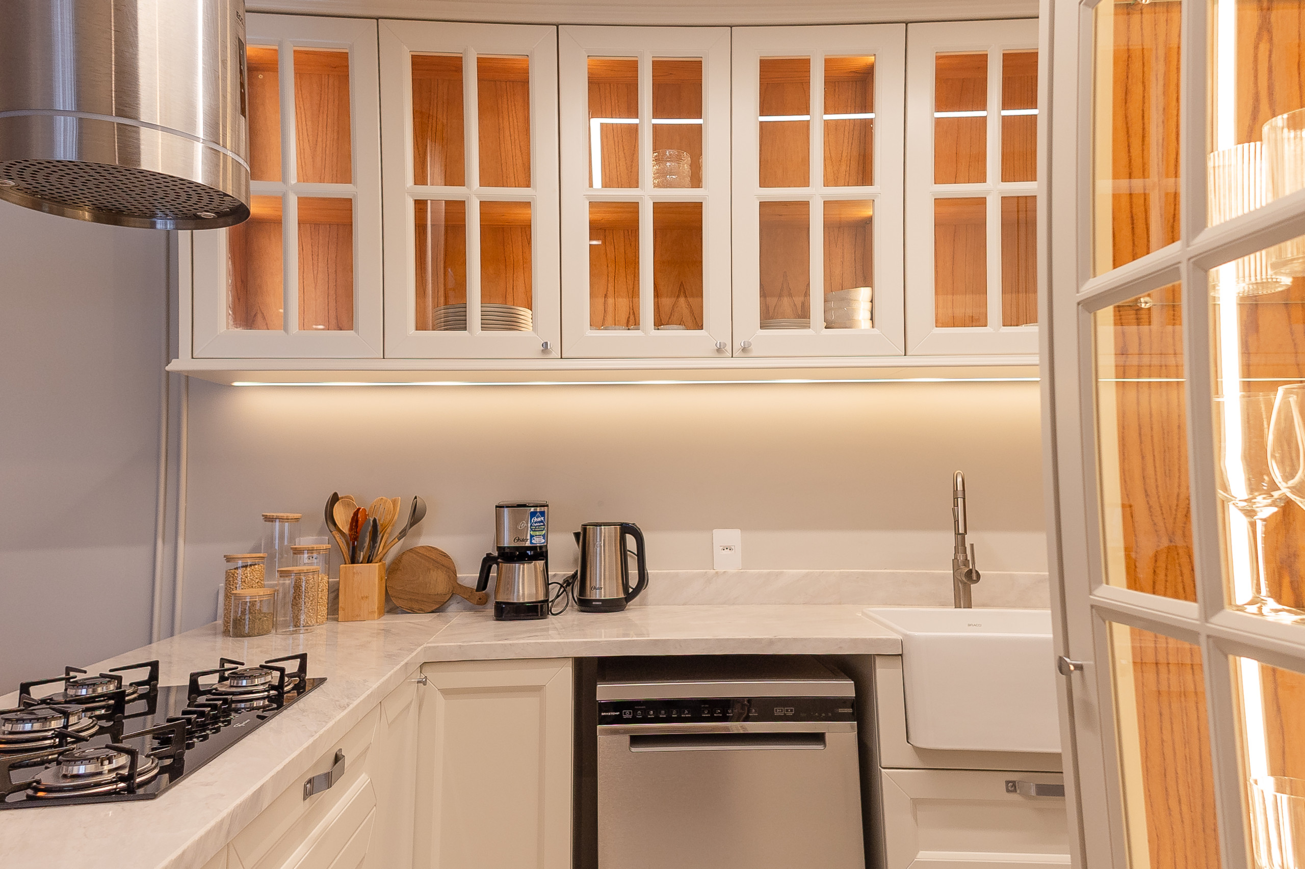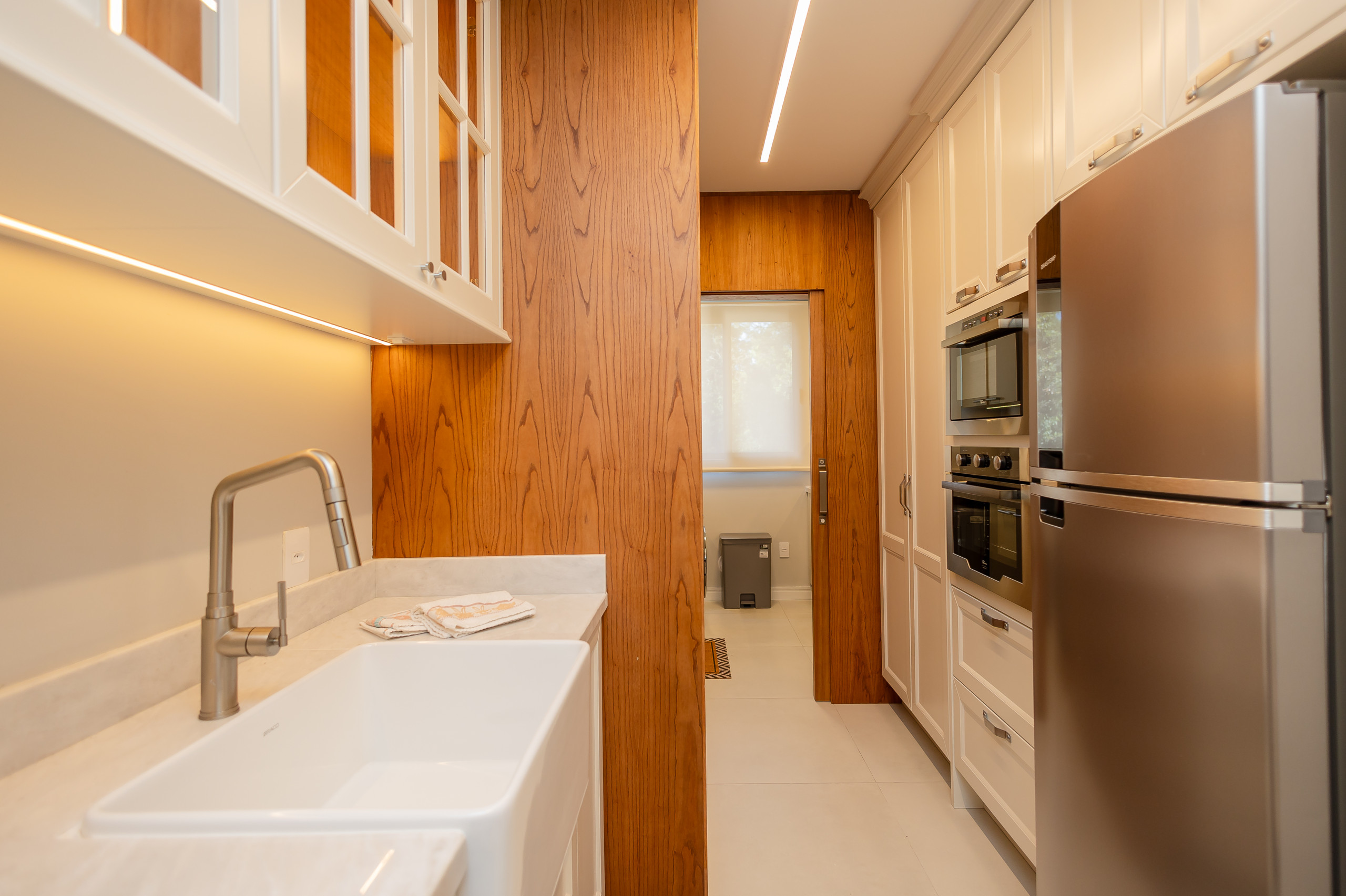 A cozinha completa conta com lava louças, churrasqueira, geladeira, cafeteira, sanduicheira, micro-ondas, cooktop e fogão. À mesa, poderão sentar-se até 06 hospedes para refeições ou para simplesmente apreciar um chocolate quente ou um vinho. O apartamento ainda dispõe de lavanderia com lava e seca.