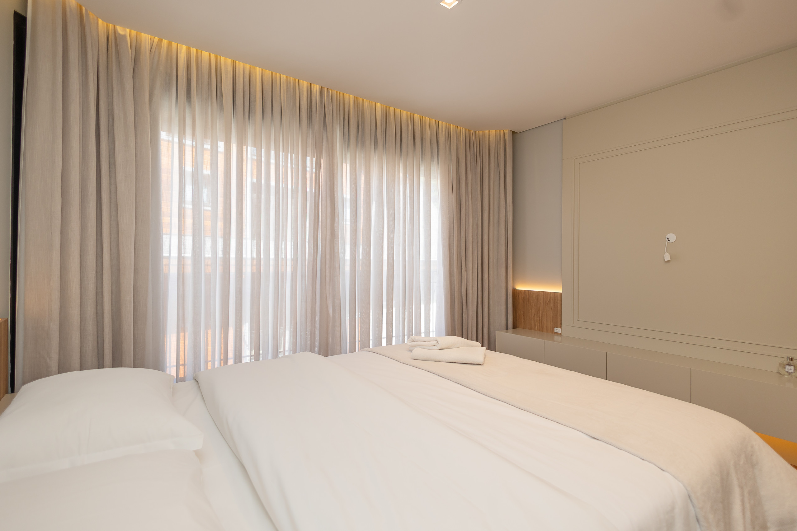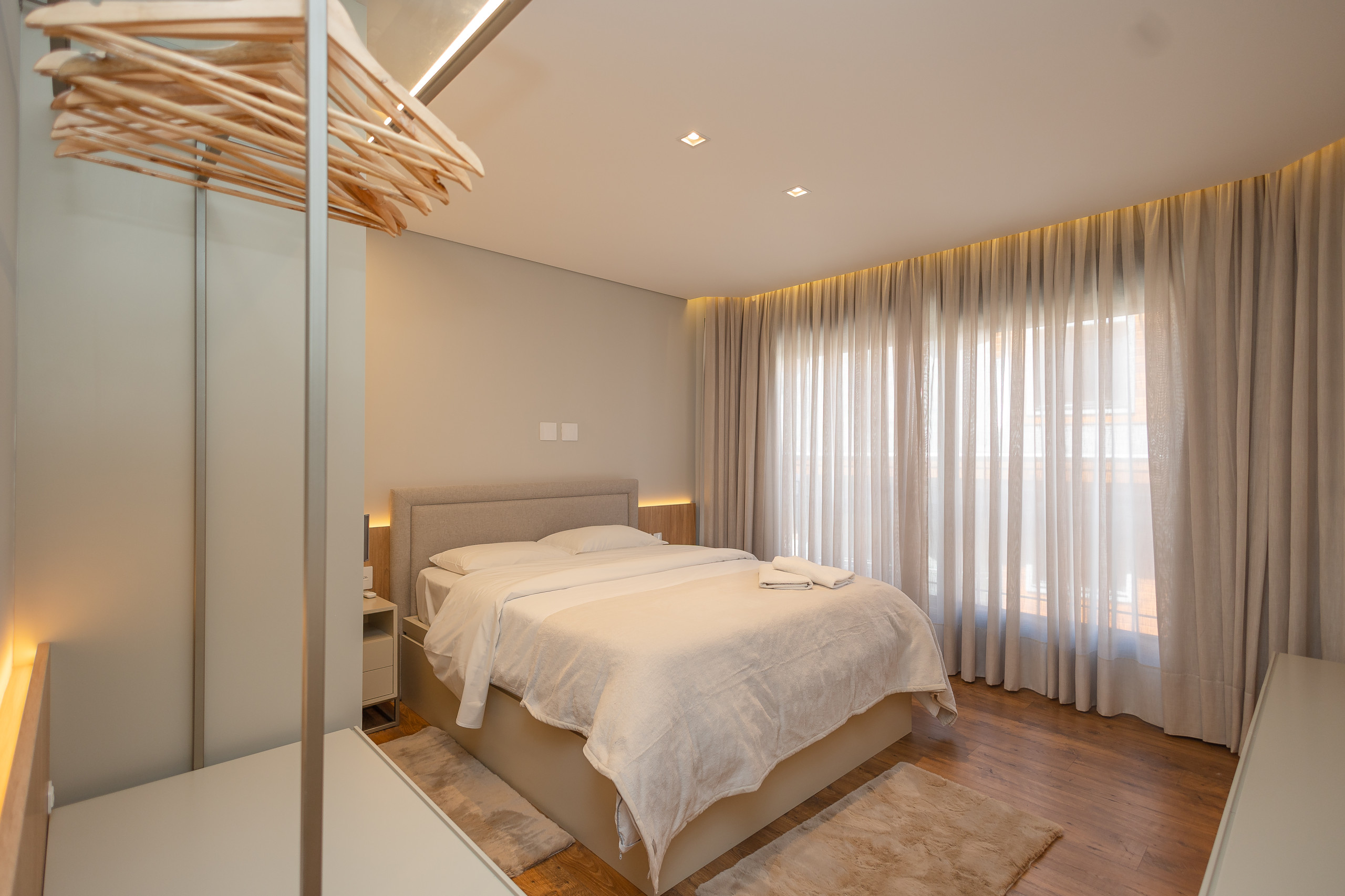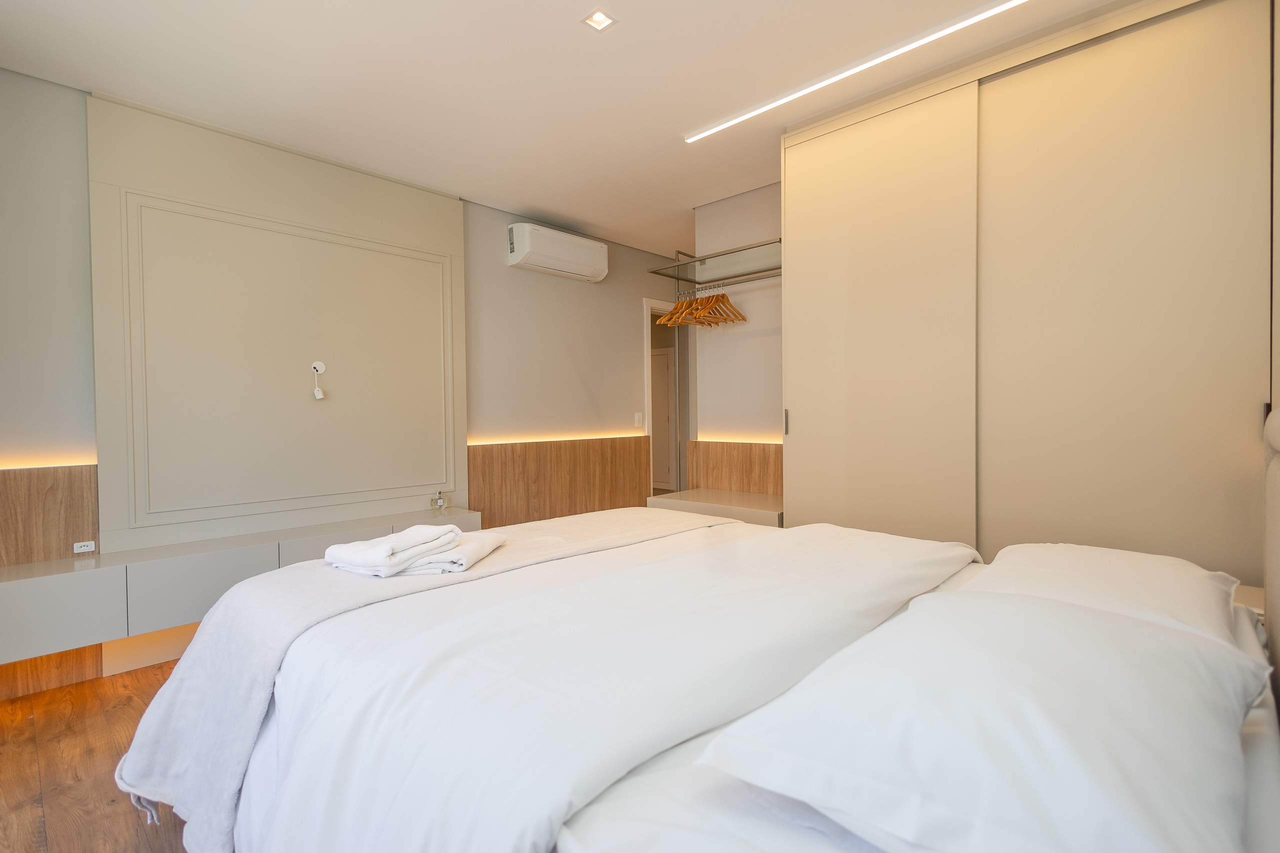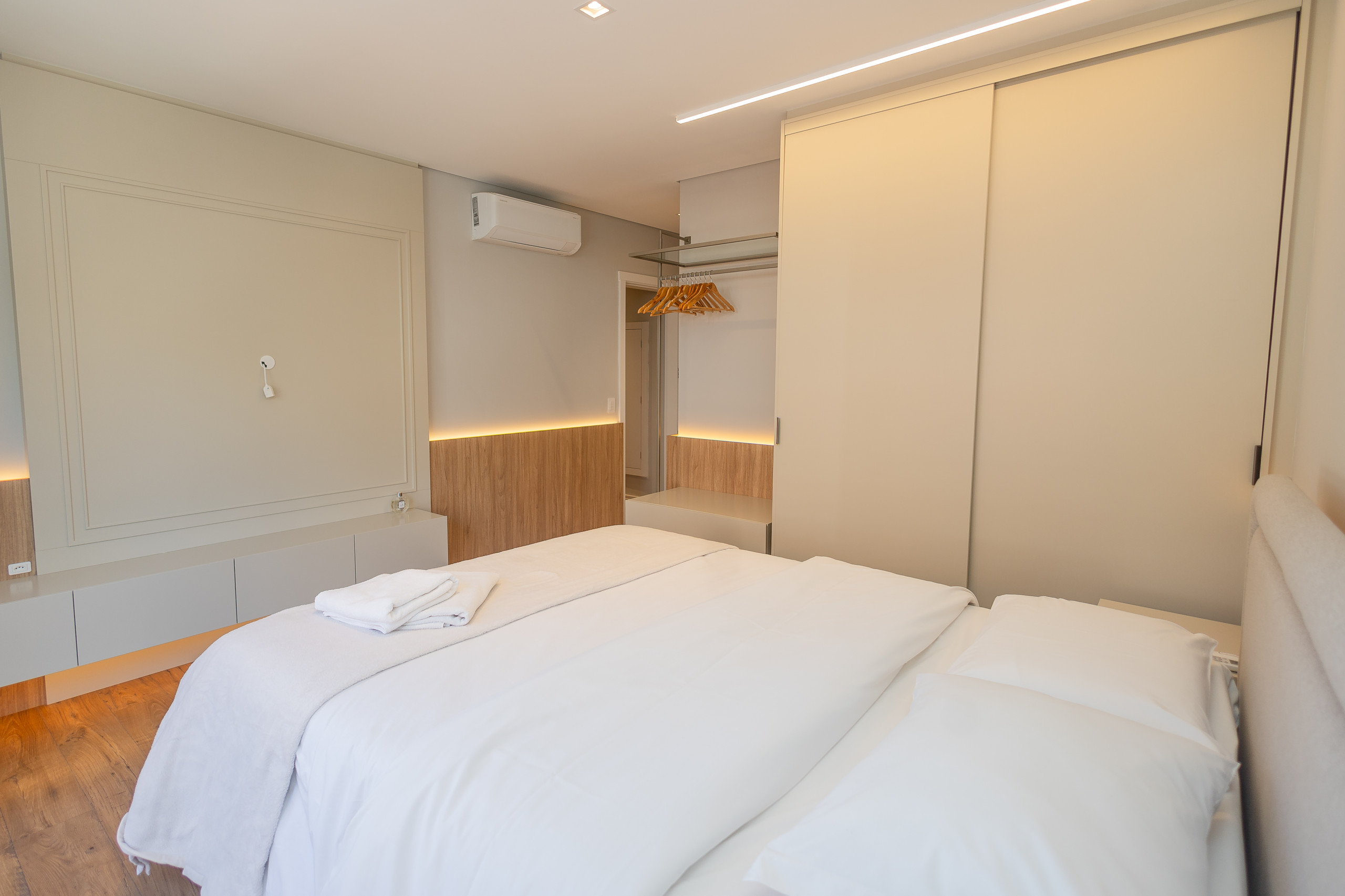 Na área íntima encontramos duas suítes, cada uma com split Q/F, persianas blackout e cortinas que trazem aconchego. Uma das suítes conta com cama queen e a outra suíte conta uma cama de casal. Cada suíte ainda conta com um colchão avulso, ideal para a gurizada!