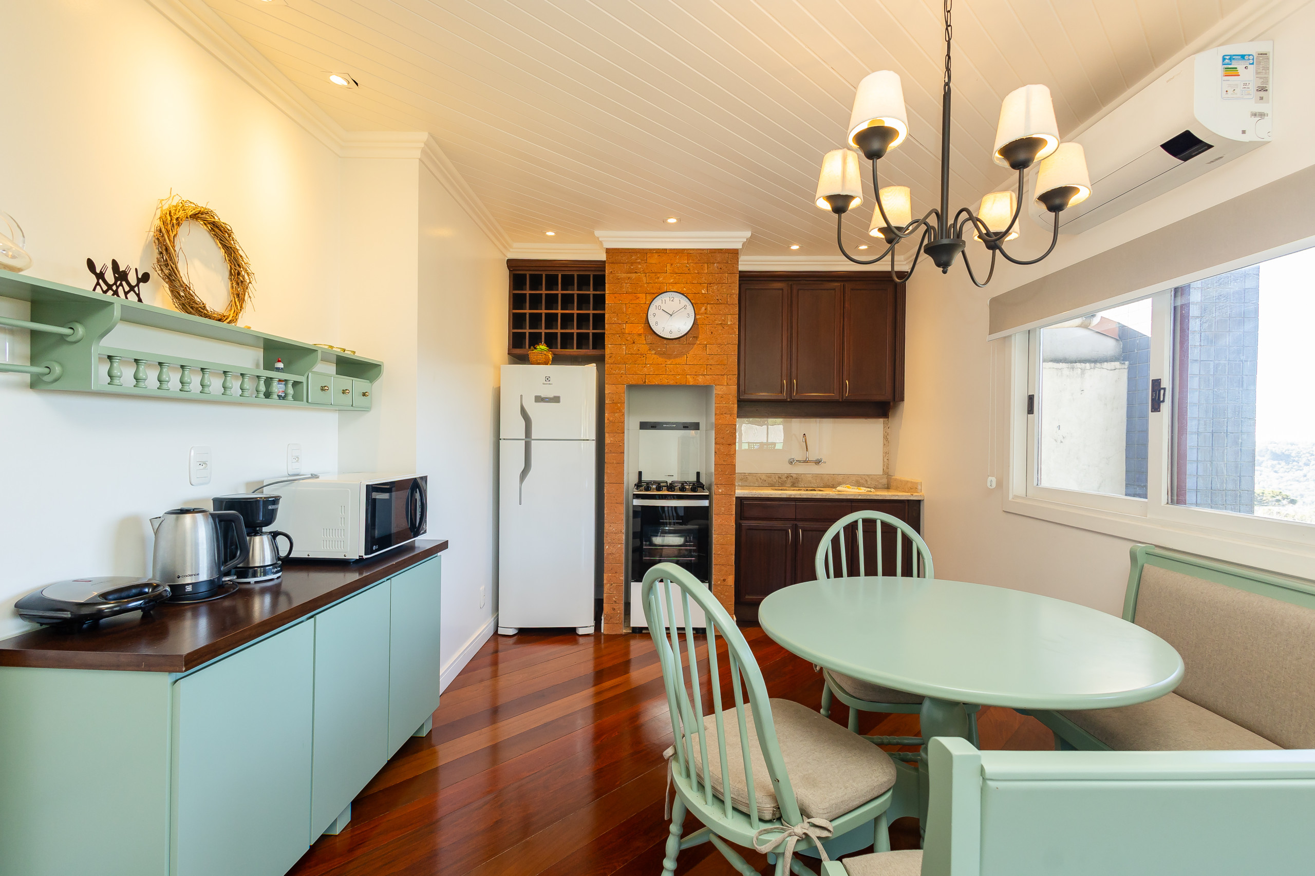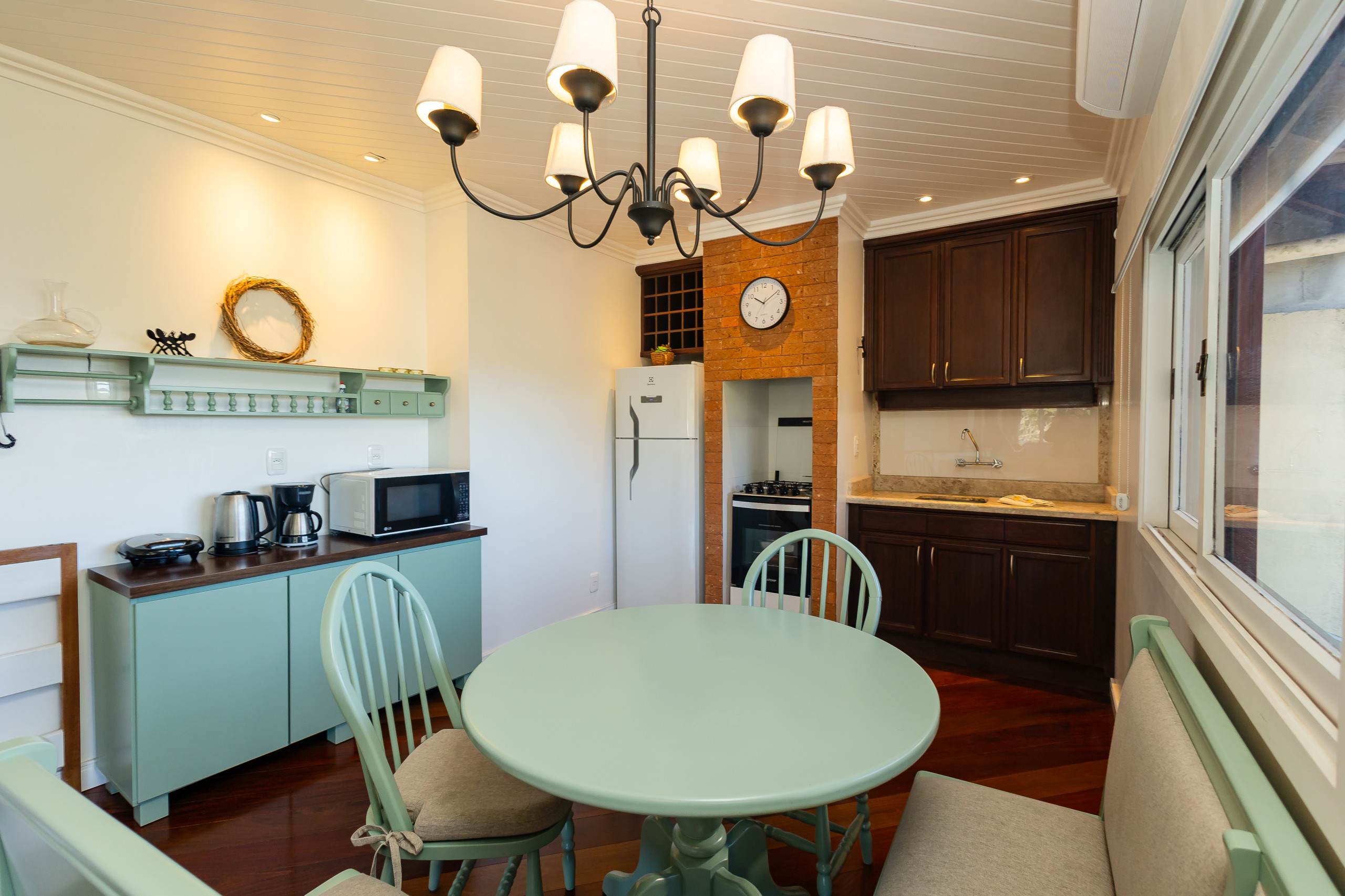 A cozinha americana completamente equipada é um verdadeiro ponto alto da propriedade. Com geladeira, freezer, forno, microondas, máquina de café, liquidificador e todos os utensílios necessários, você terá liberdade para preparar refeições deliciosas e momentos especiais em família.