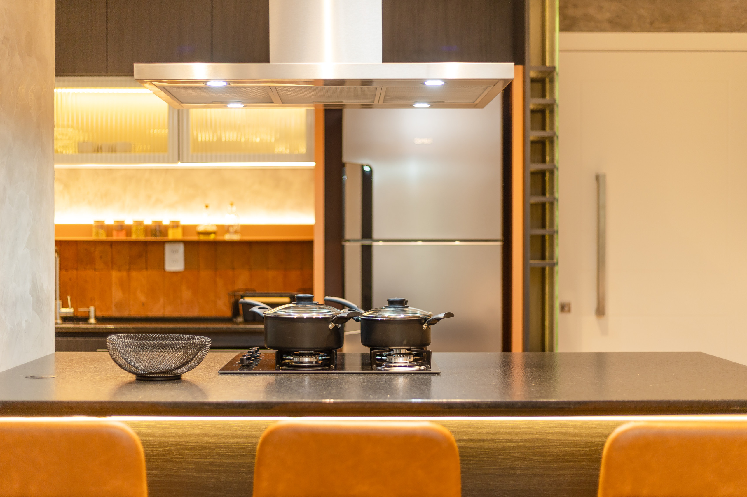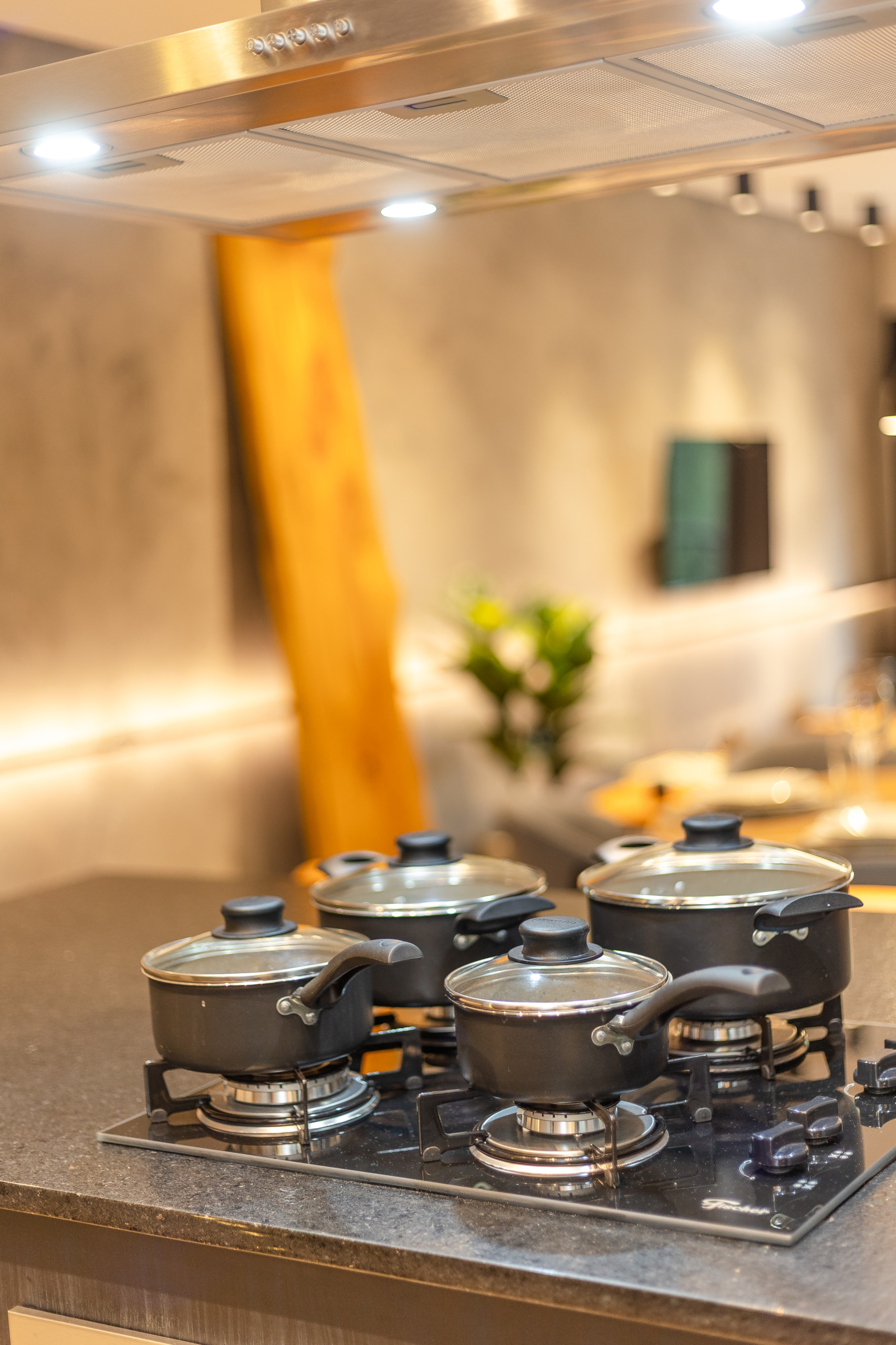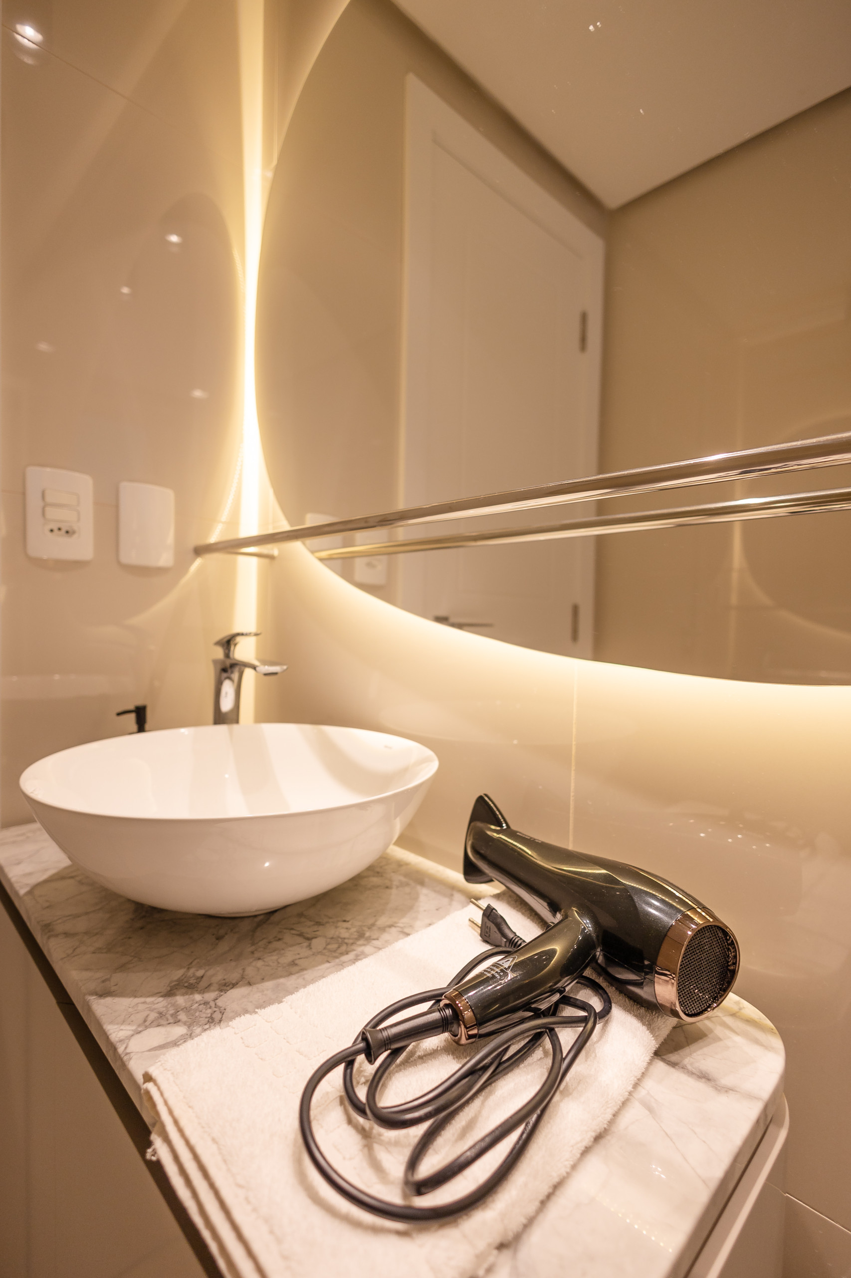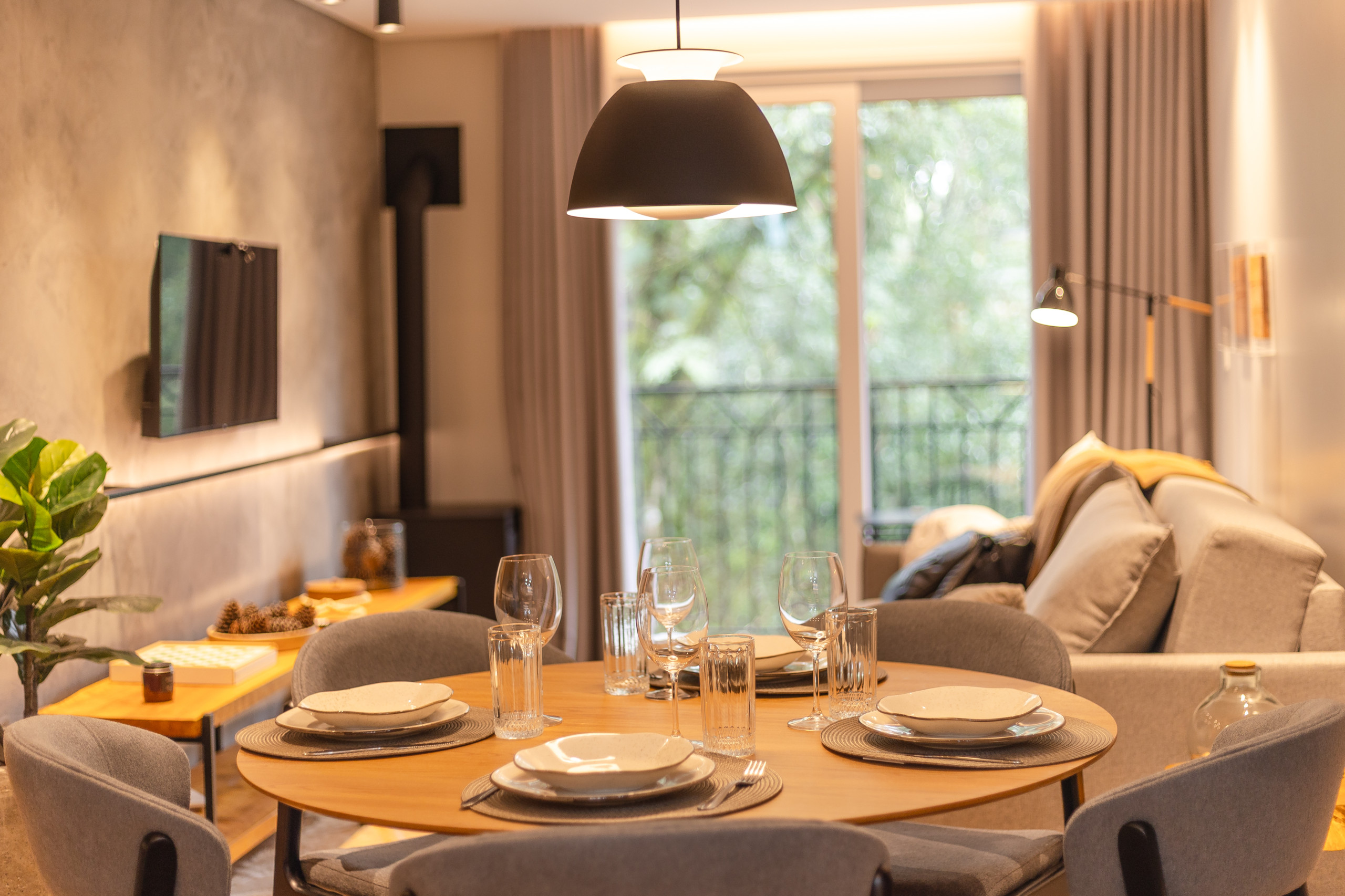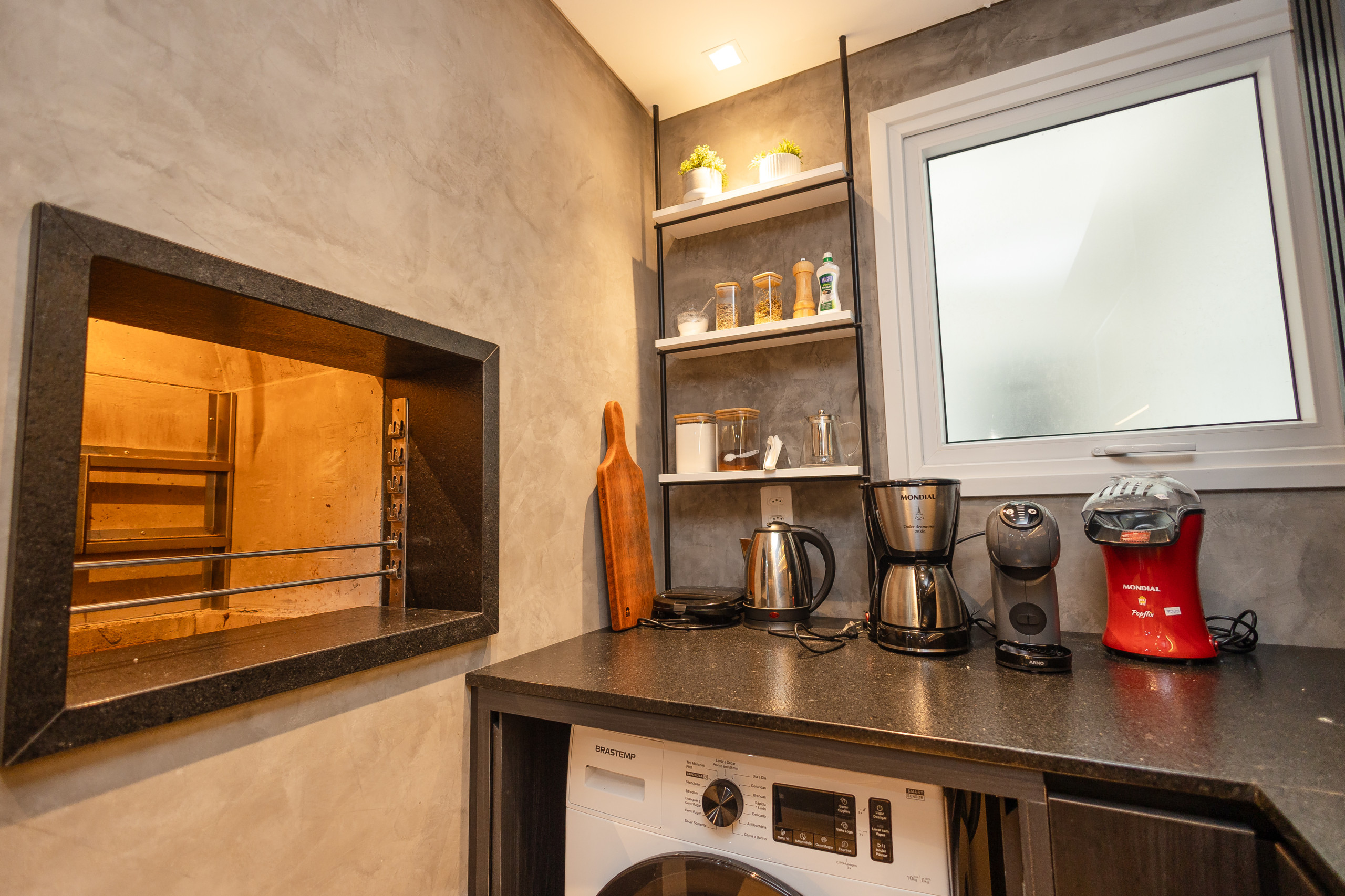 A cozinha completa conta churrasqueira, geladeira, cafeteira, sanduicheira, micro-ondas, cooktop e fogão. À mesa, poderão sentar-se para refeições ou para simplesmente apreciar um chocolate quente ou um vinho. O apartamento ainda dispõe de secador de cabelos e lava e seca.