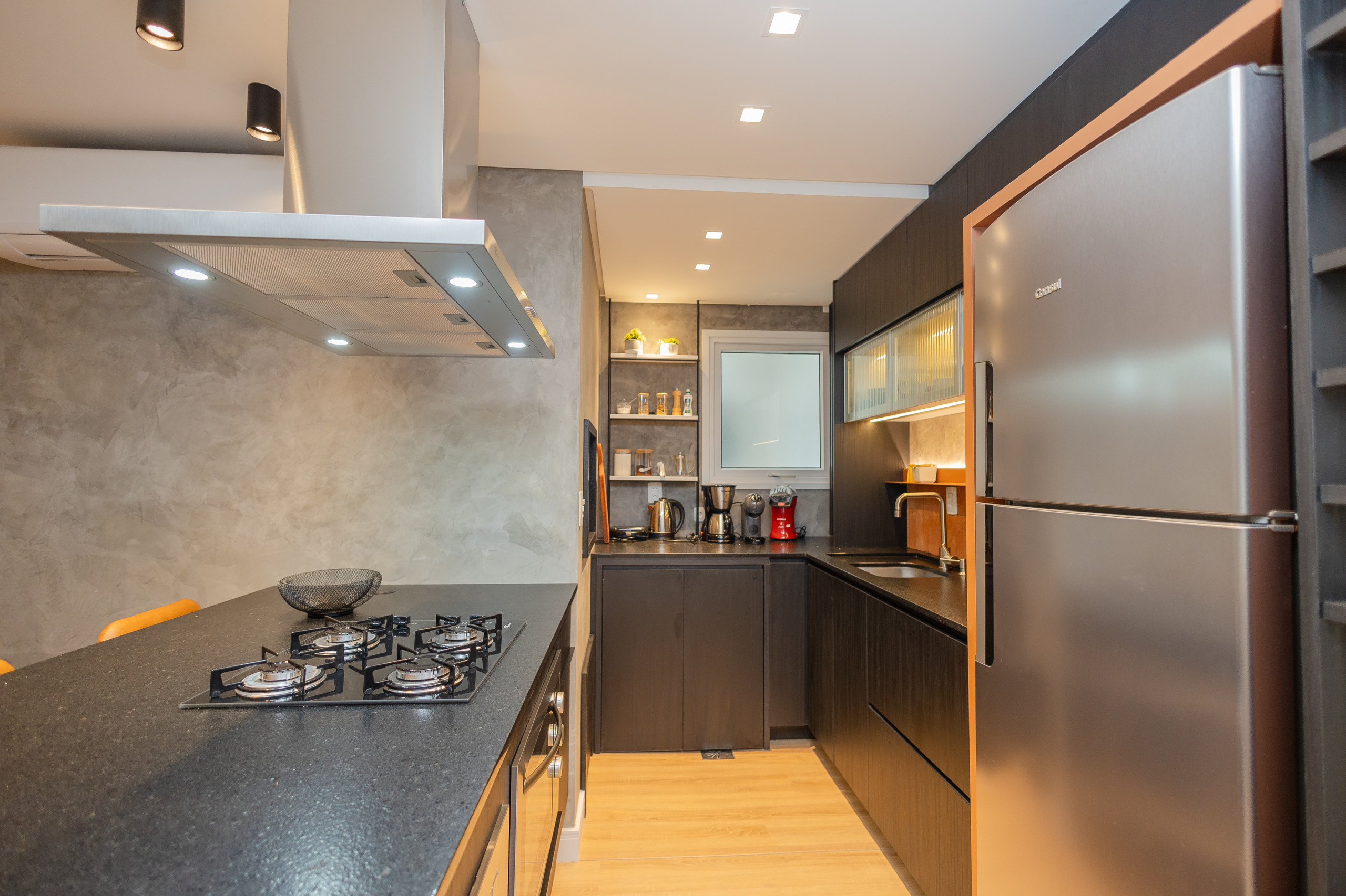 A cozinha completa conta churrasqueira, geladeira, cafeteira, sanduicheira, micro-ondas, cooktop e fogão. À mesa, poderão sentar-se até 04 hóspedes para refeições ou para simplesmente apreciar um chocolate quente ou um vinho. O apartamento ainda dispõe de secador de cabelos.