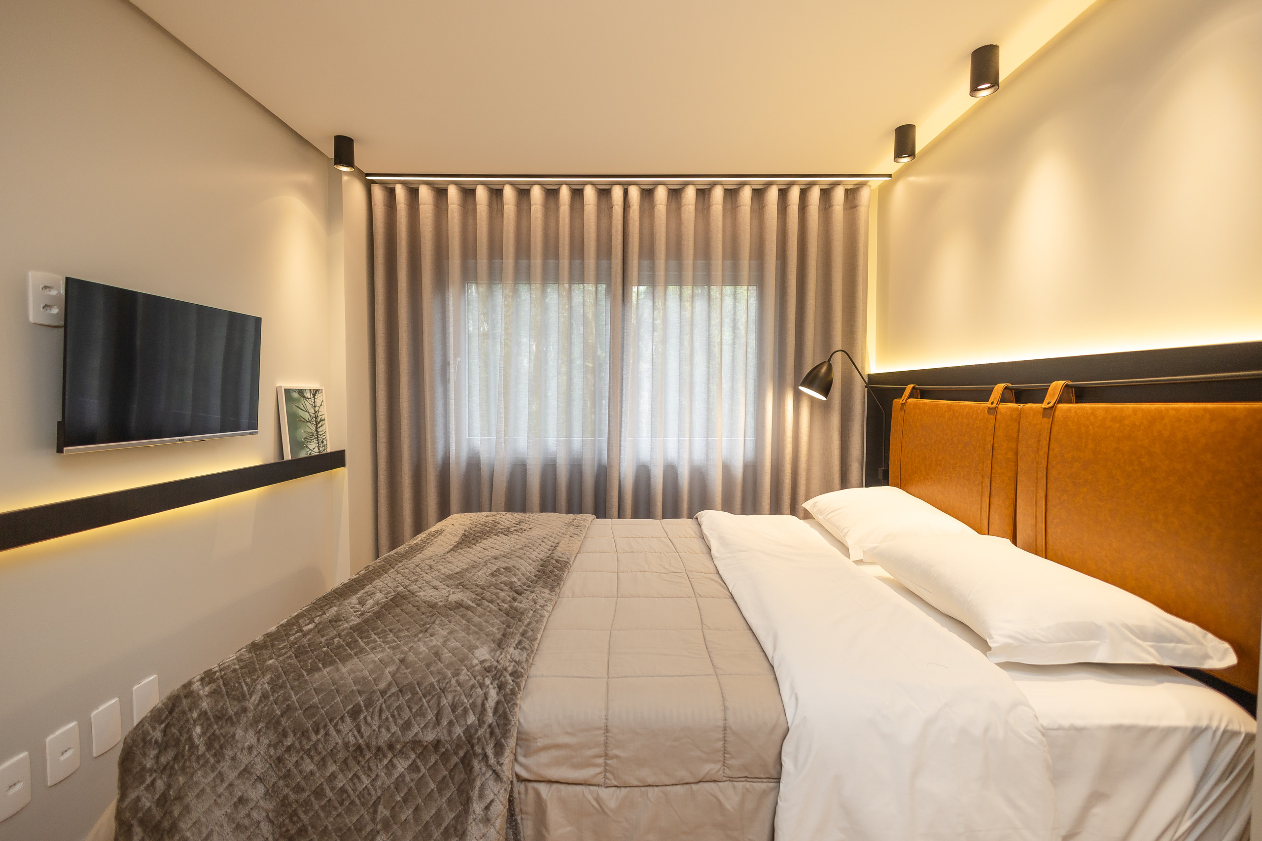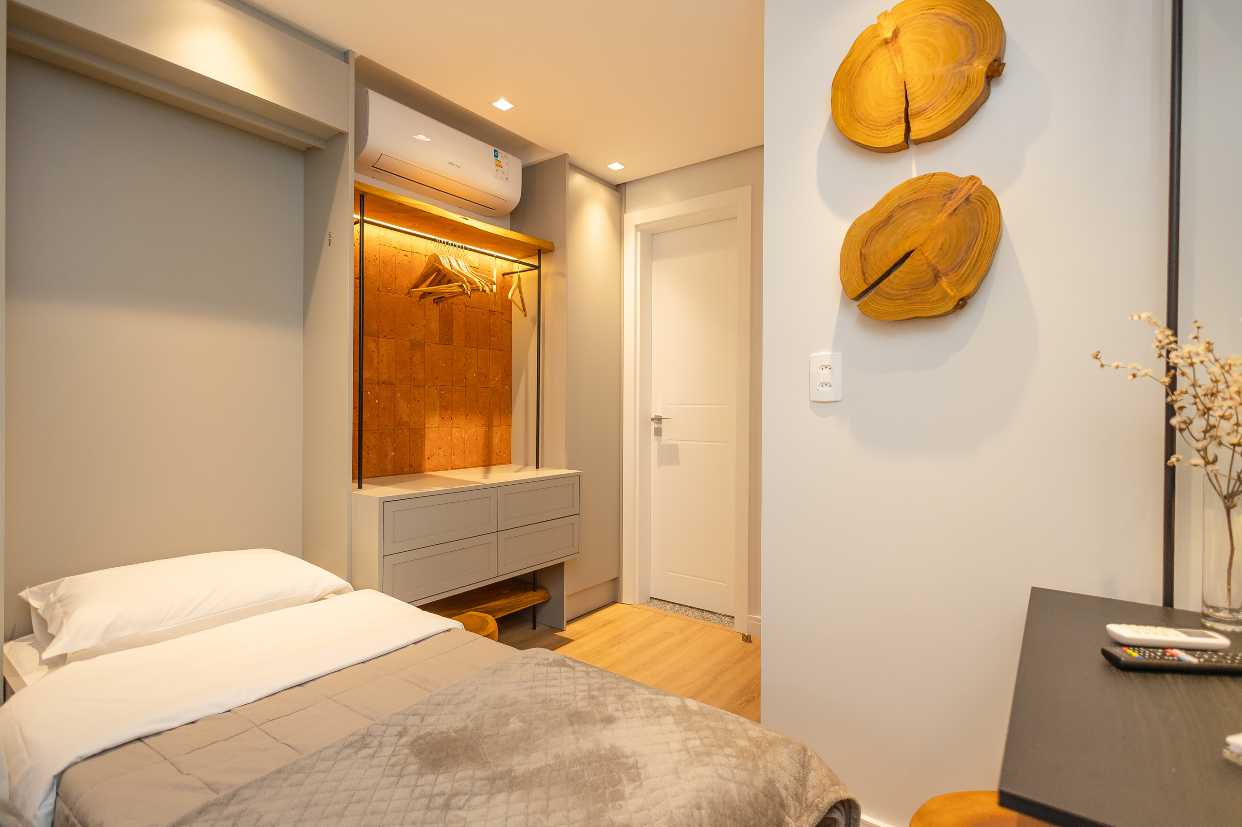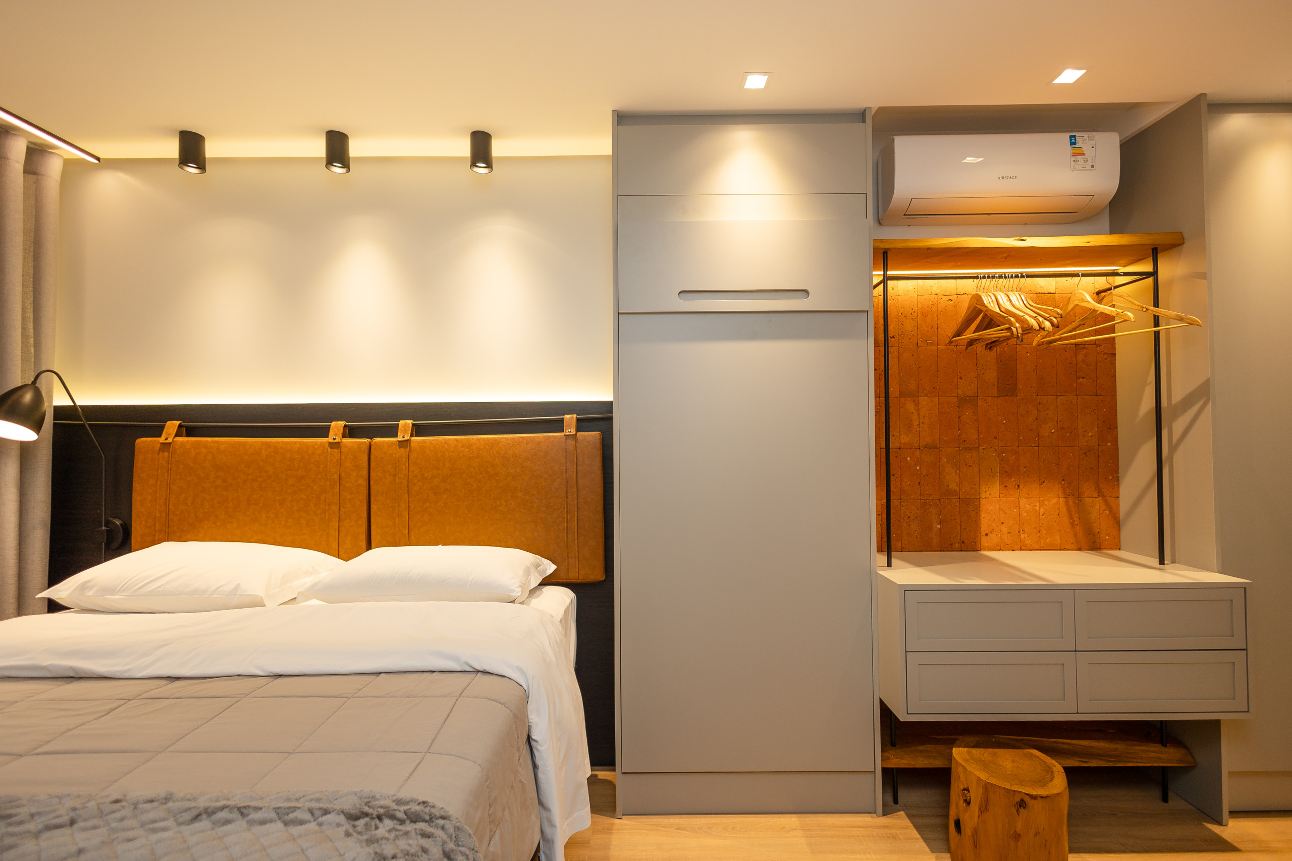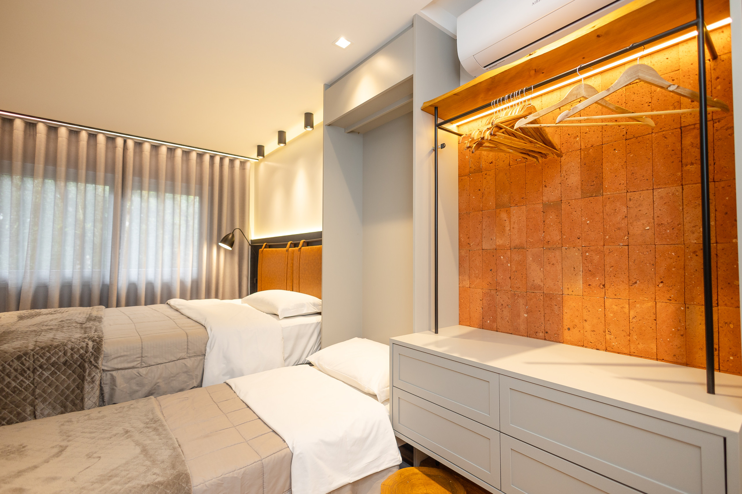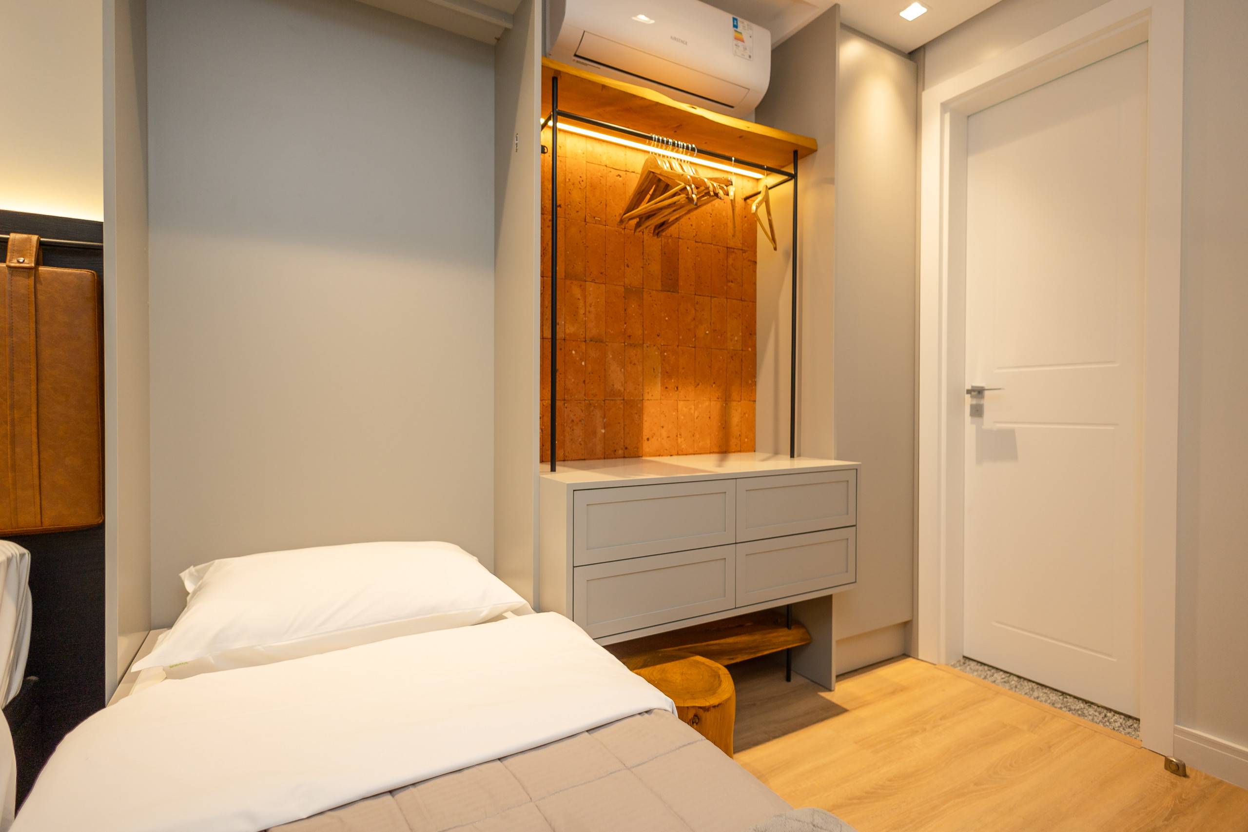 Na área íntima encontramos uma suíte com split Q/F e cortinas blackout que trazem aconchego. Ela conta com cama queen e uma cama de solteiro que pode ser rebatida no armário para otimizar o espaço quando não utilizada!