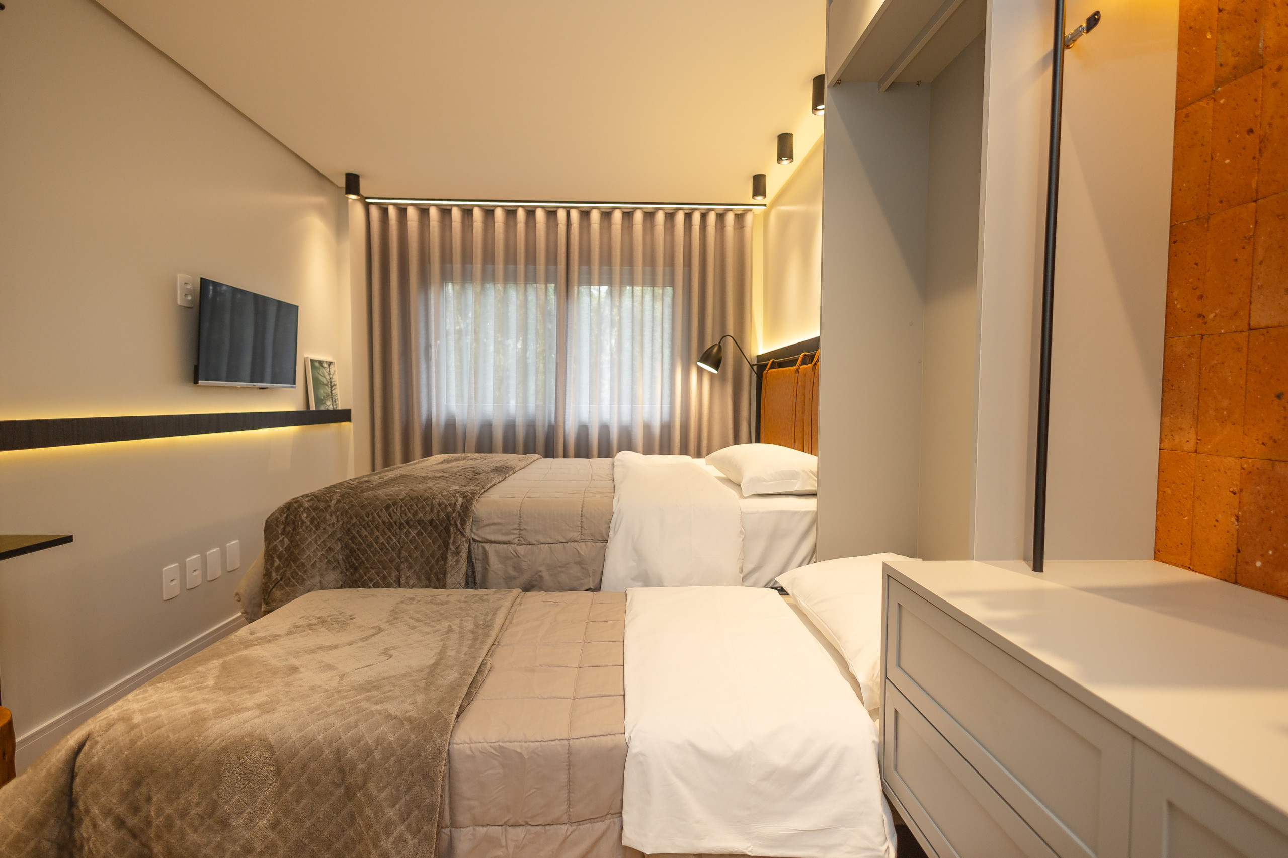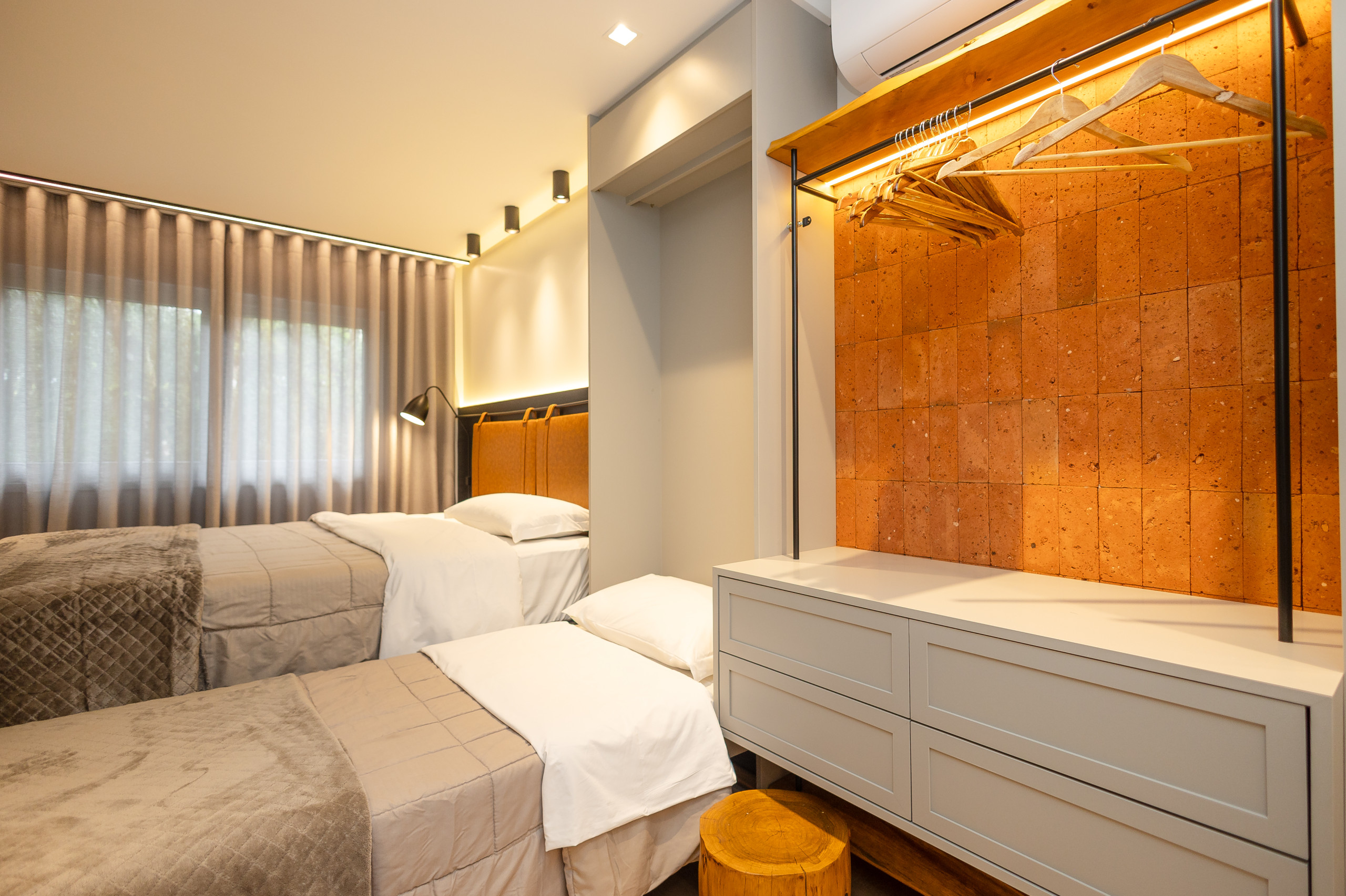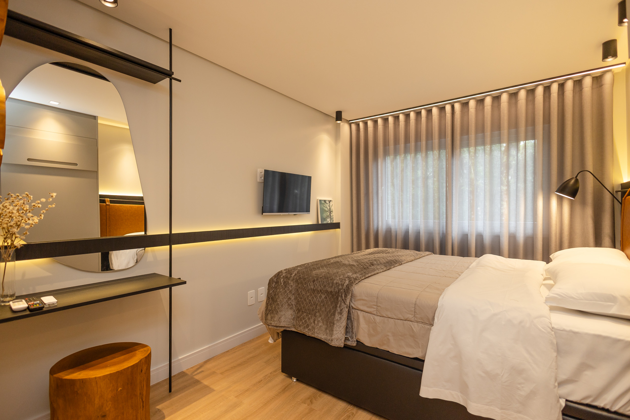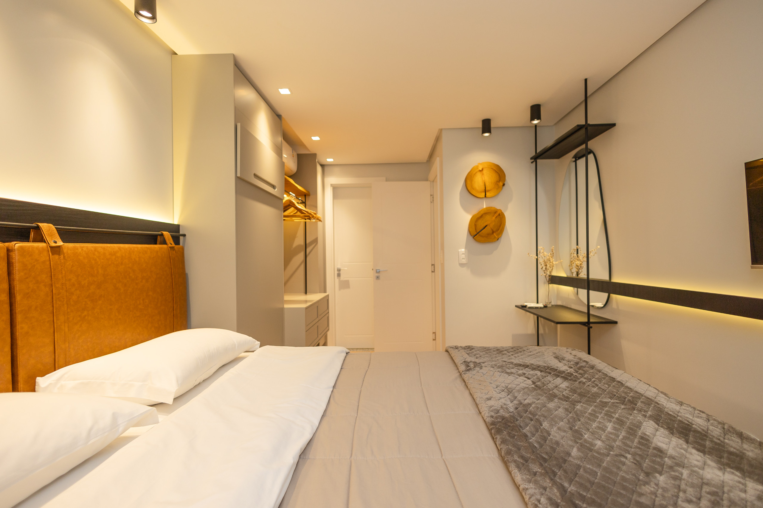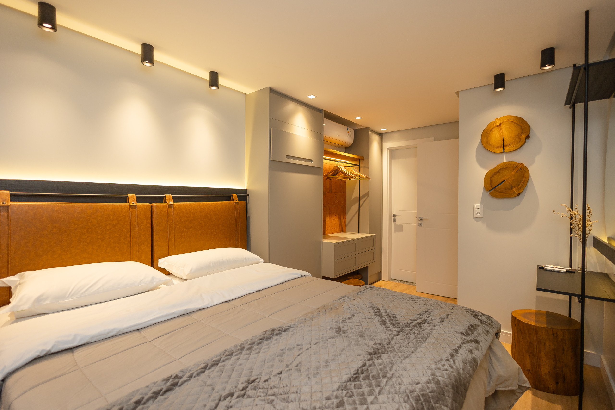 Na área íntima encontramos uma suíte com split Q/F e cortinas blackout que trazem aconchego. Ela conta com cama queen e uma cama de solteiro que pode ser rebatida no armário para otimizar o espaço quando não utilizada!